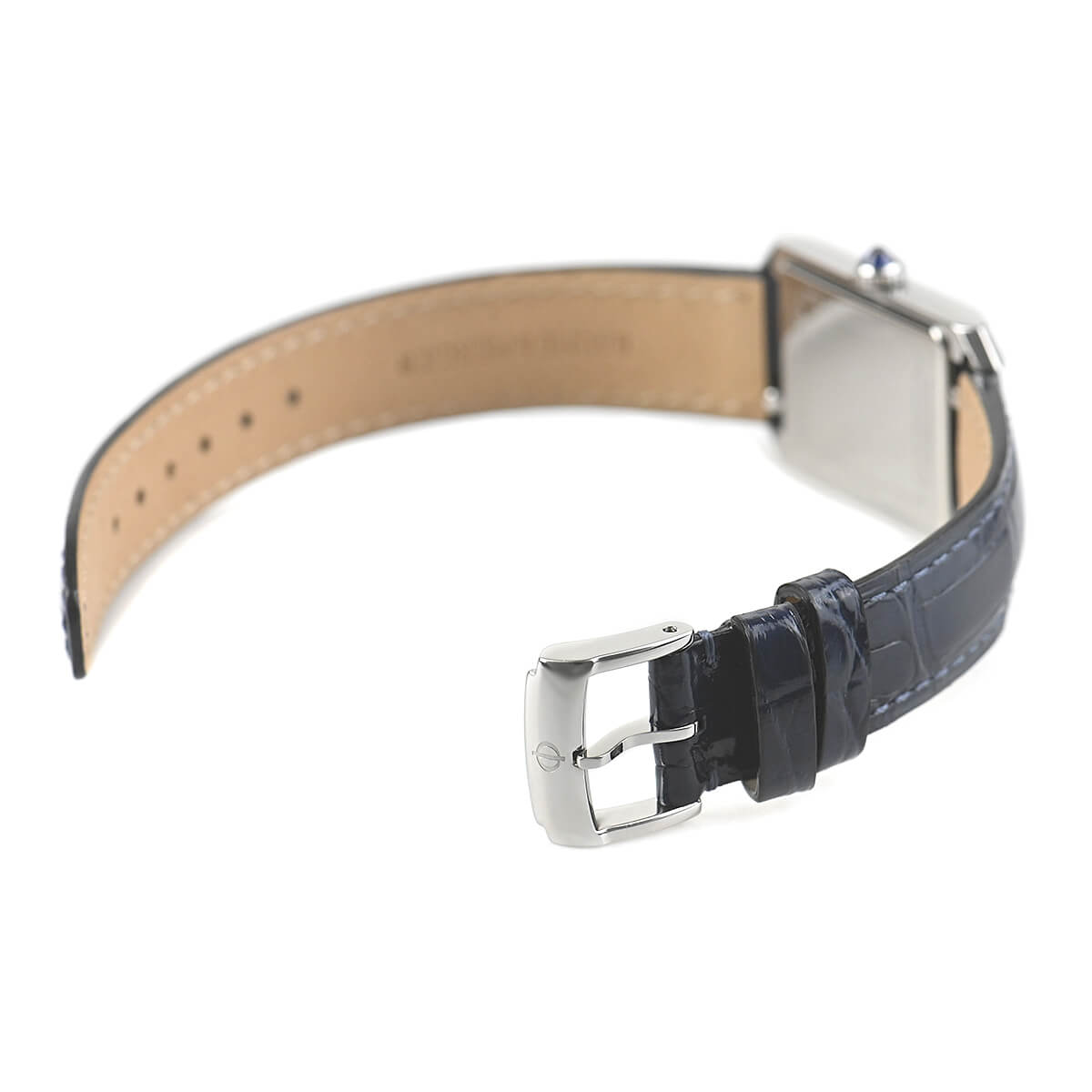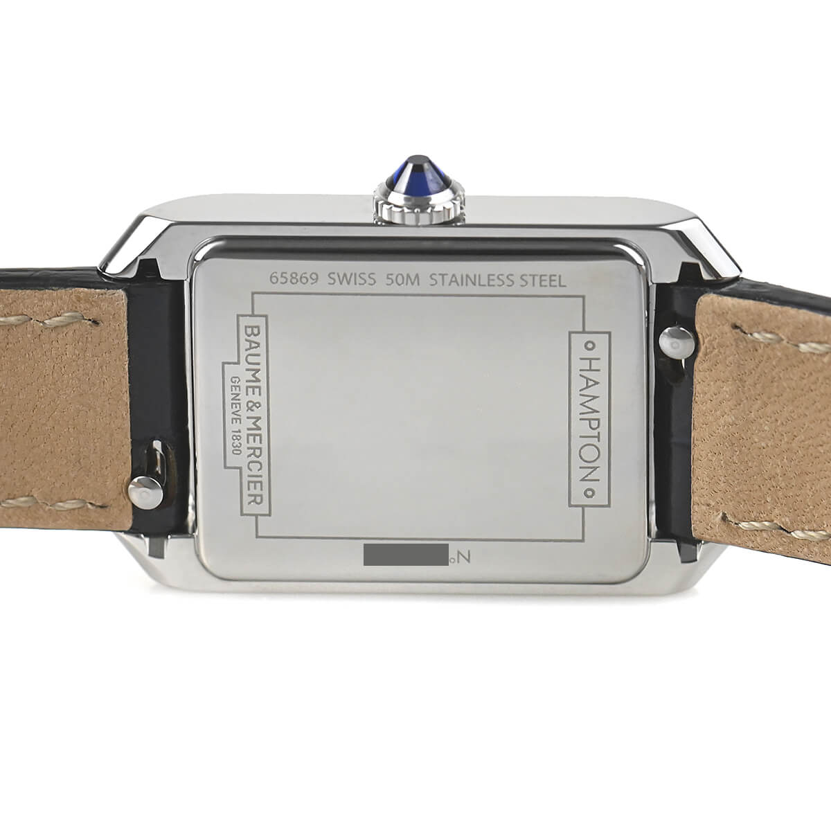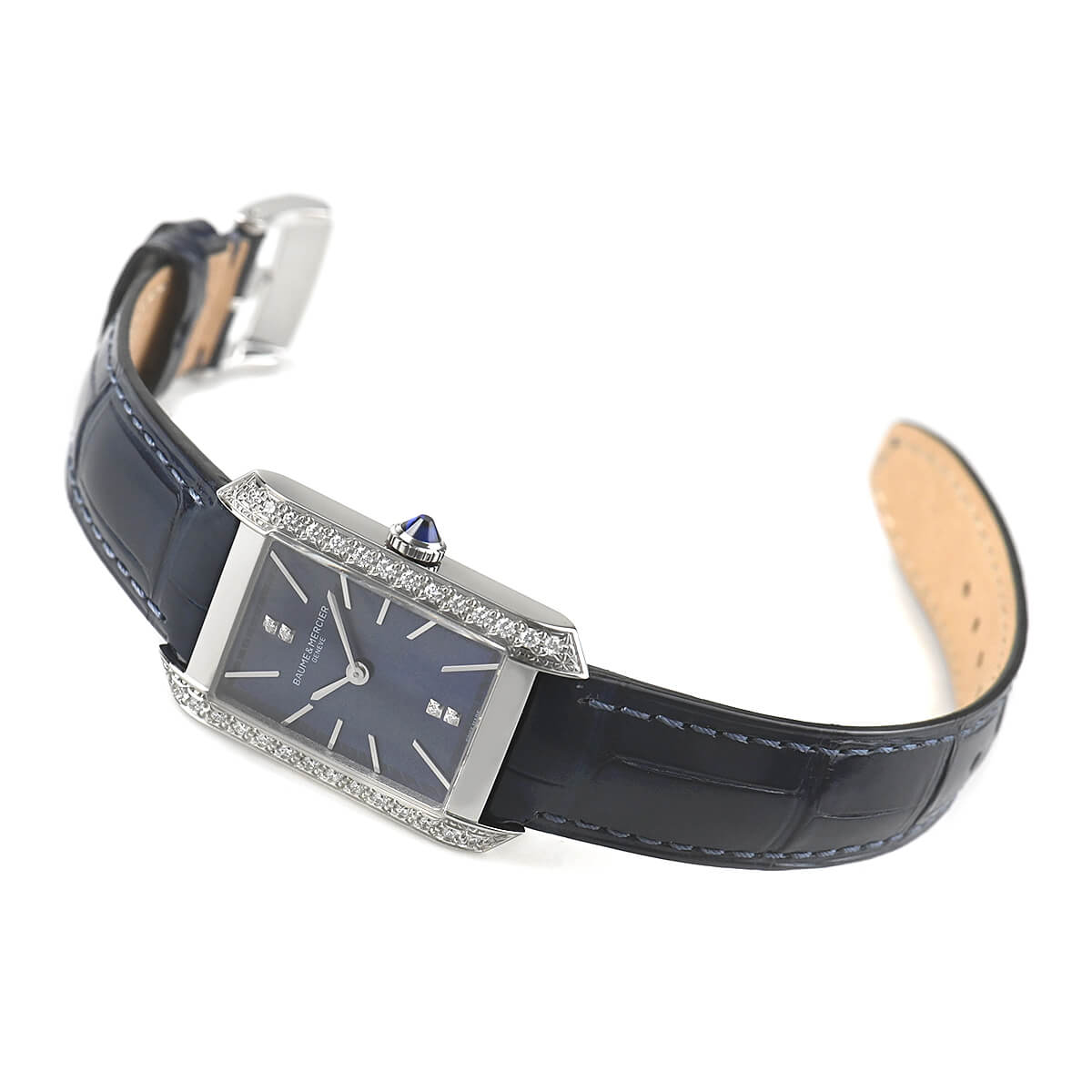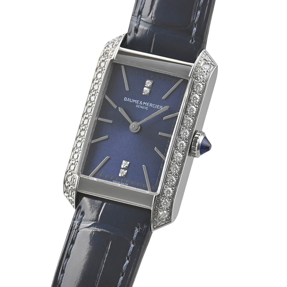 名門ボーム&メルシエのレクタンギュラーライン「ハンプトン」は、アールデコからインスピレーションを得たモデルです。今回入荷のこちらは、ブルーのダイヤルが涼しげなレディースモデル。