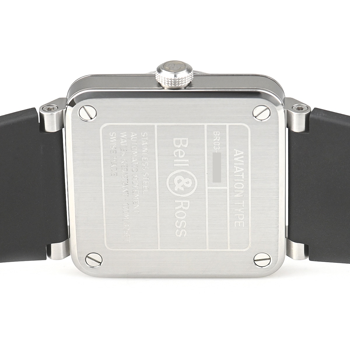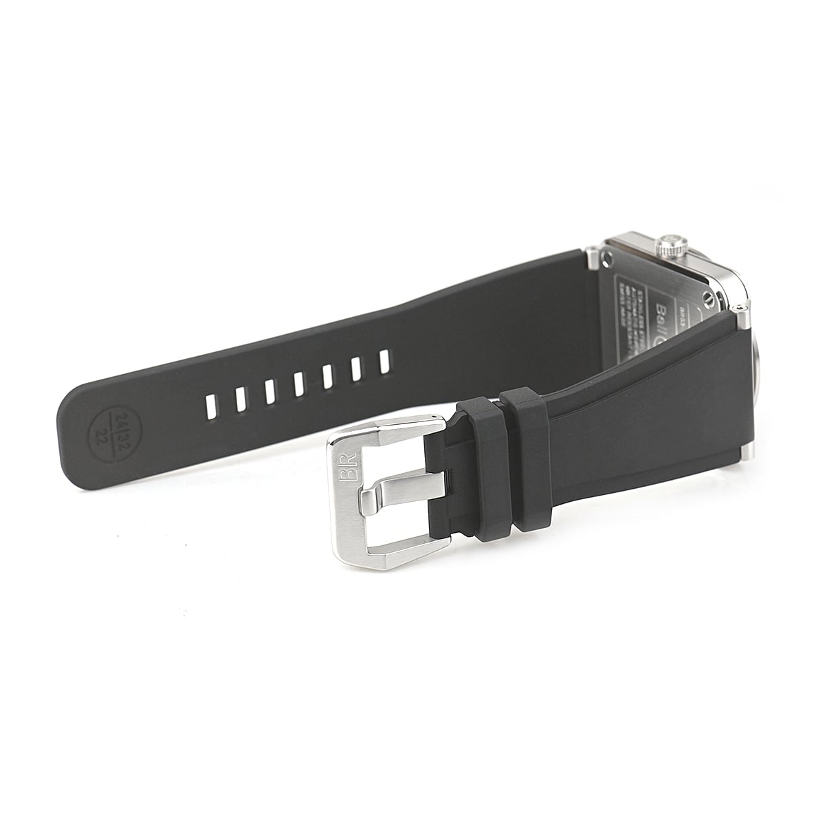 斬新な角形ケースが印象的なコレクション「BR03」。航空機のコックピット・クロックから発想を得たこの時計は、視認性を重視した機能的な道具という面が一段と強調されています。