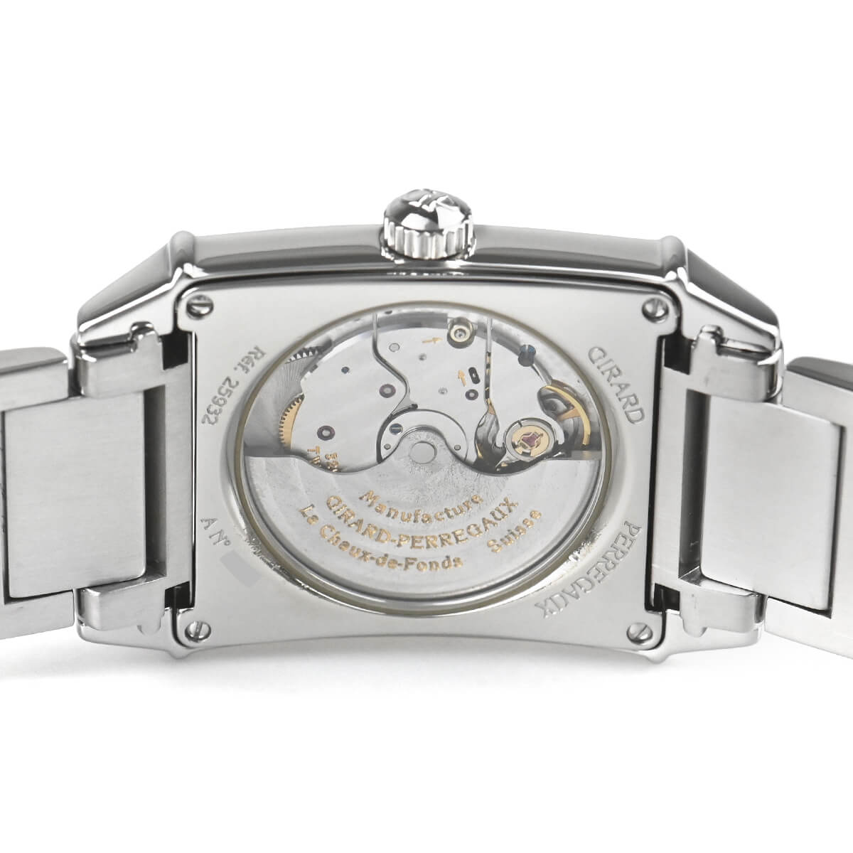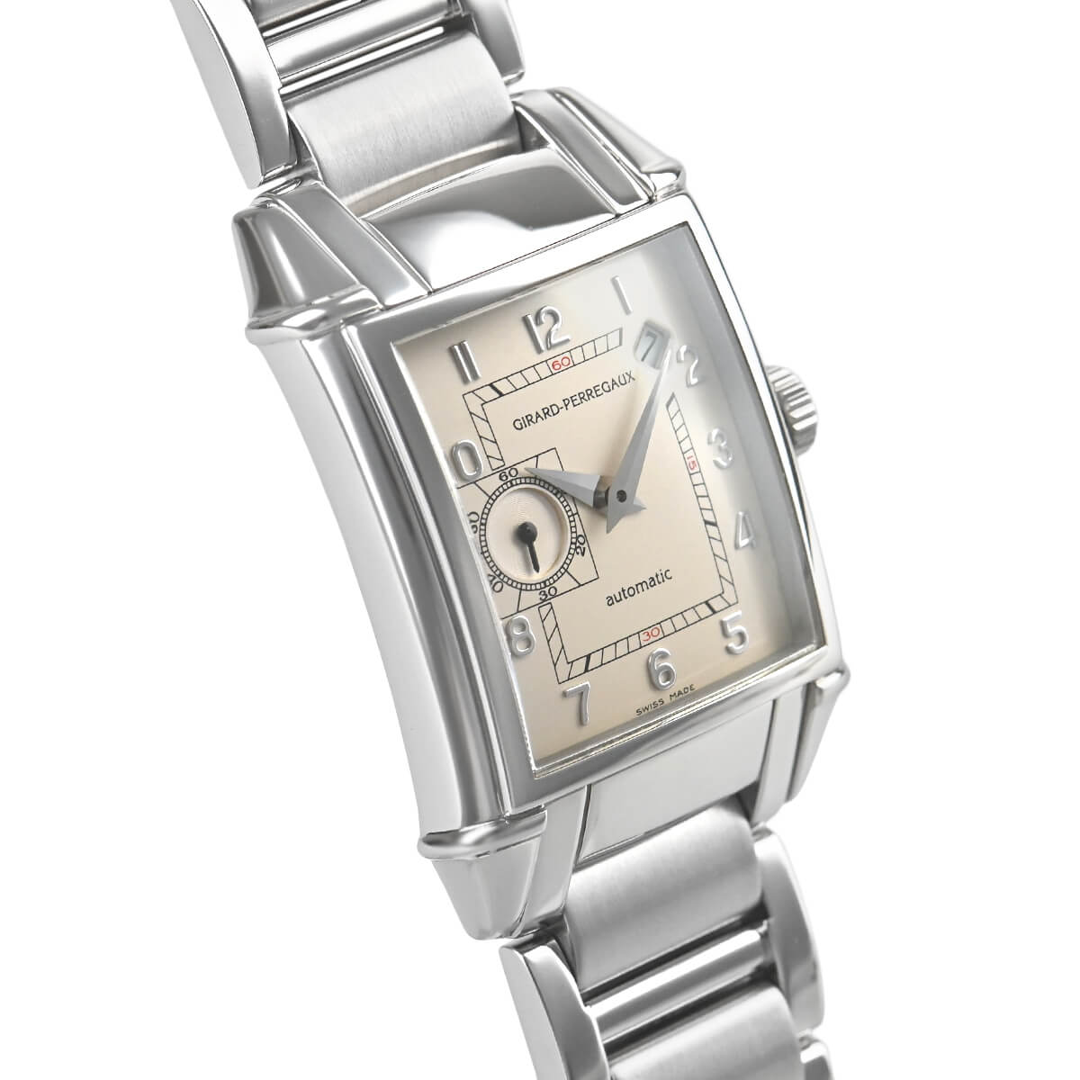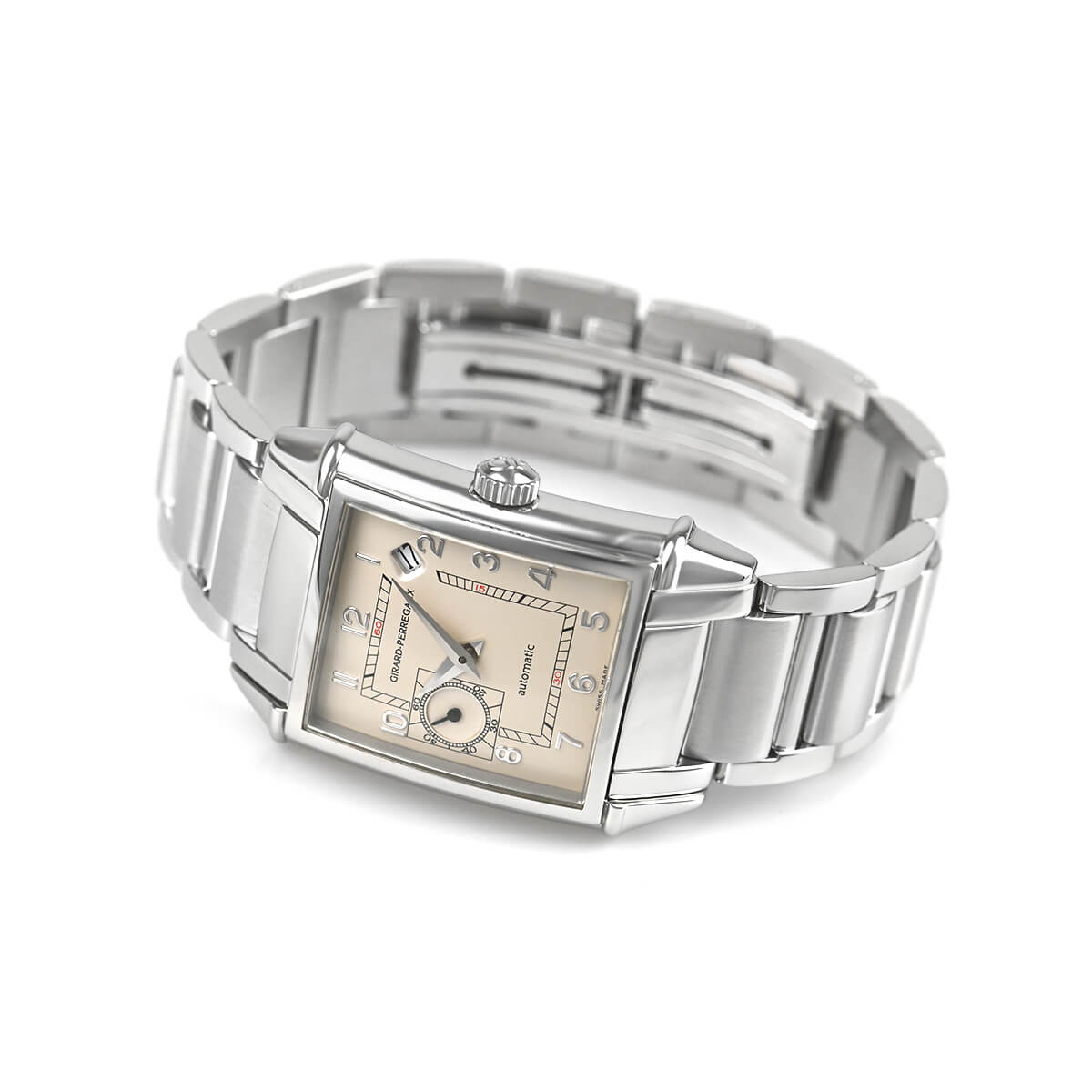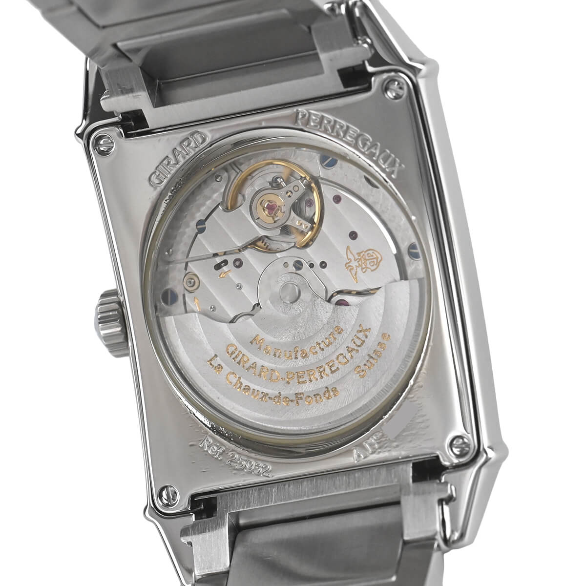 時計製造工芸の復活期である1945年、ジラール・ペルゴは、アールデコからインスパイアされた丸みをおびたレクタンギュラー(長方形)ケースのモデルを創作しました。こちらの「ヴィンテージ1945」は、1995年にその復刻版として発売されたモデルです。