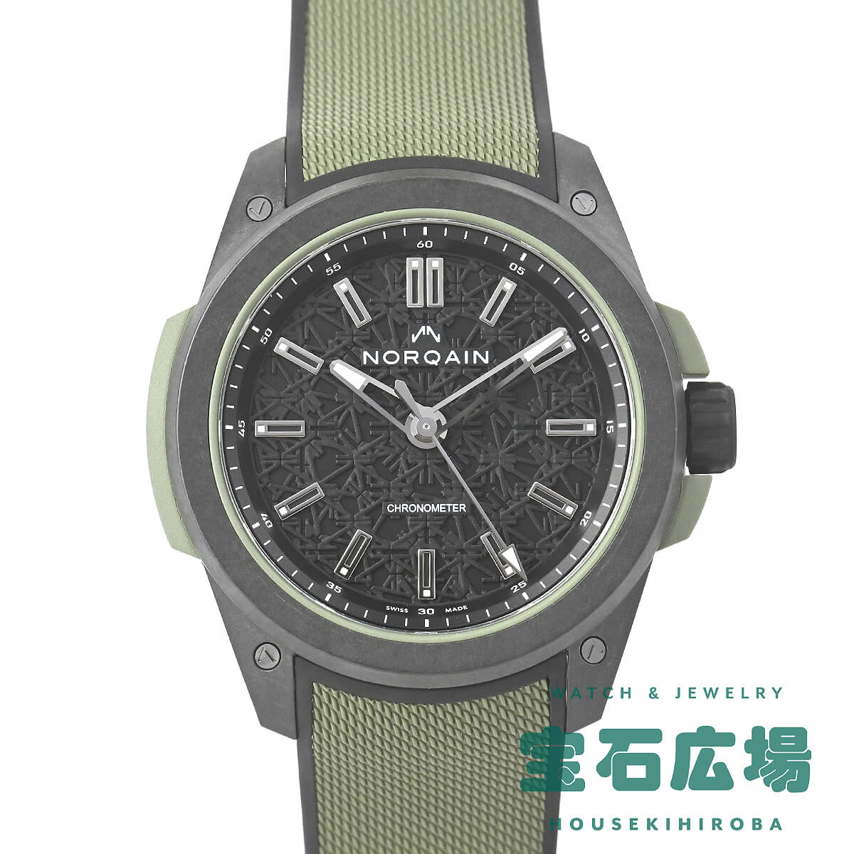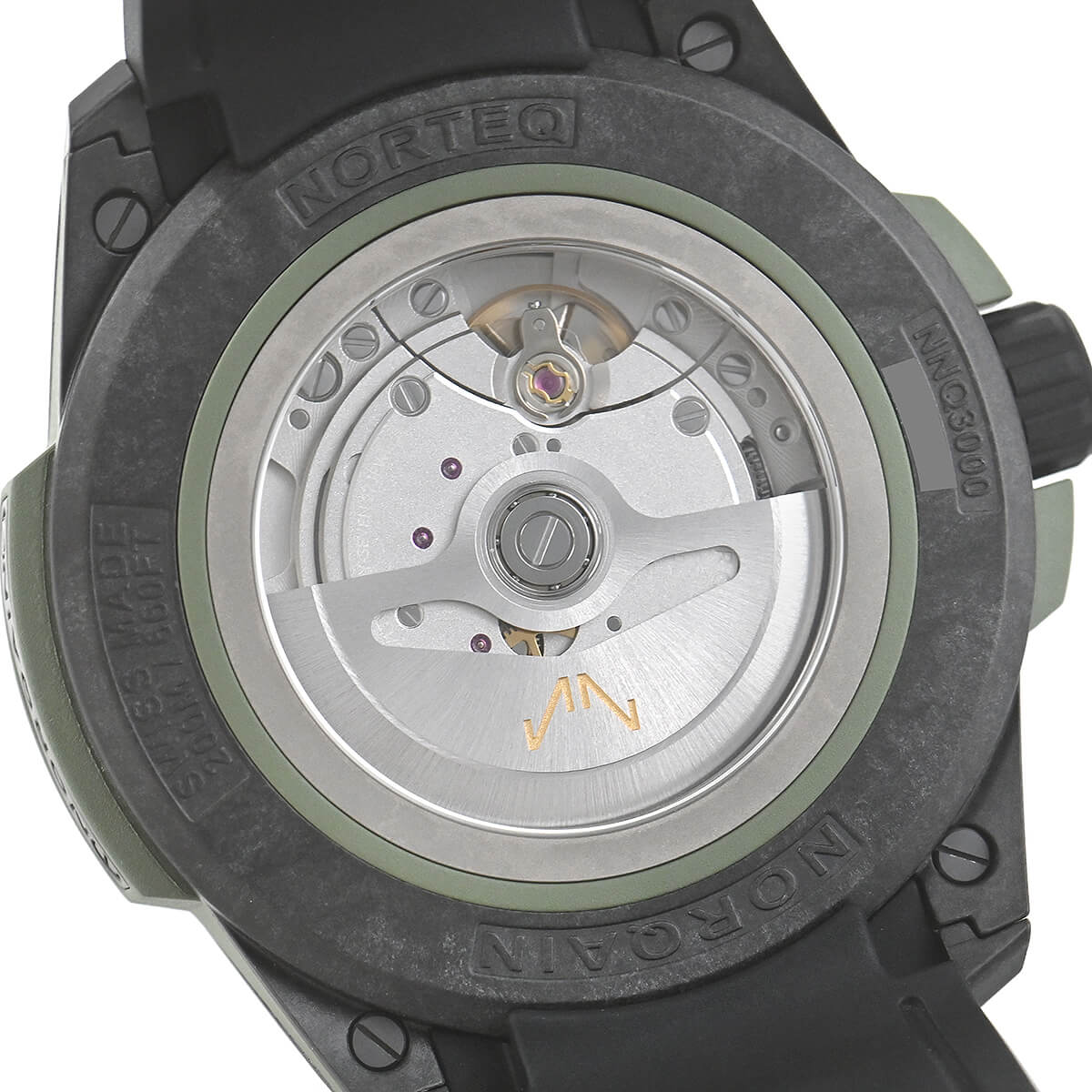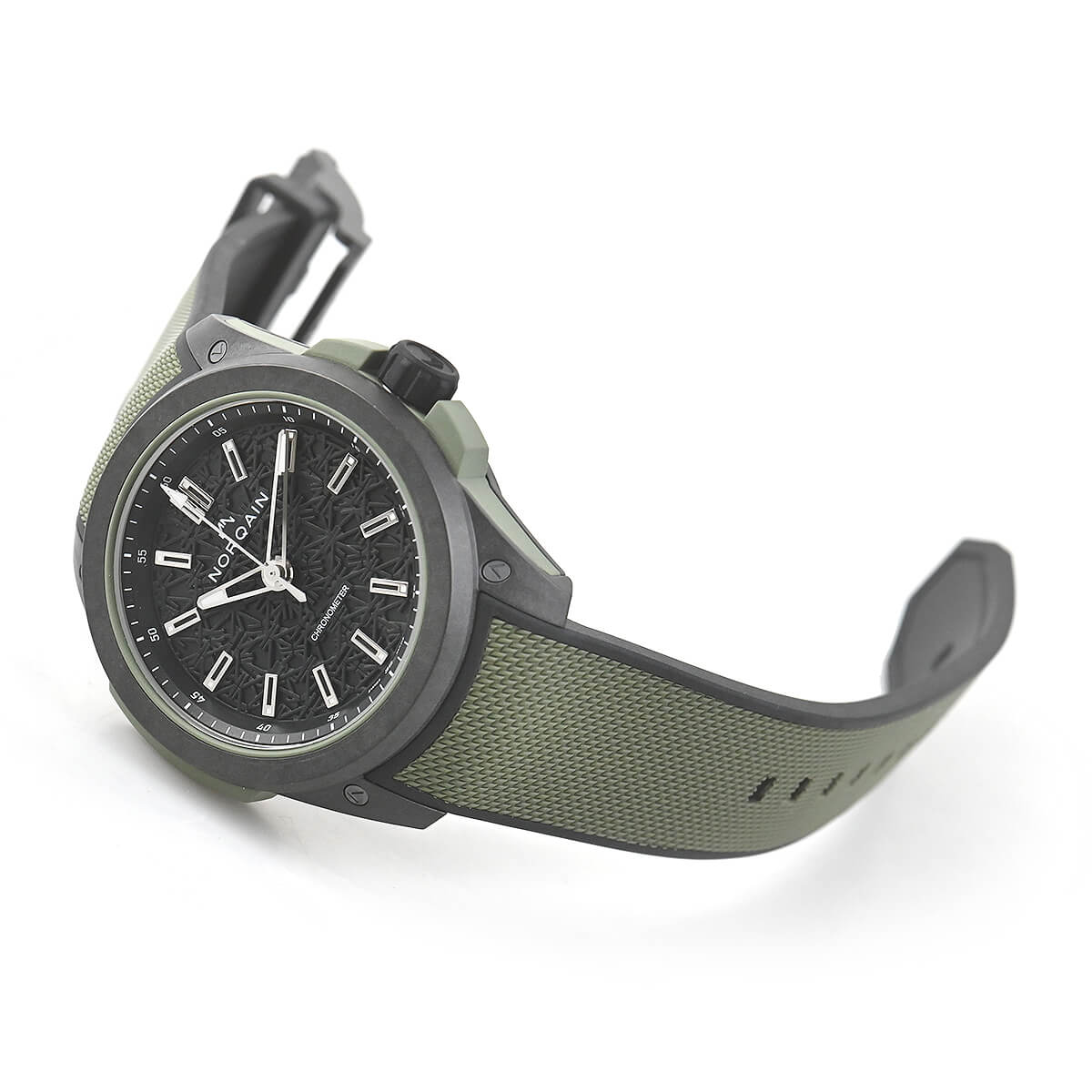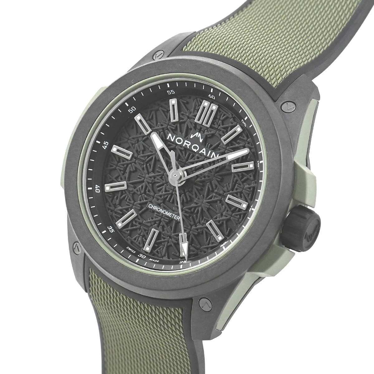 ダイヤルはレーザーカットで加工され、スイスの頂きをシンボルとしたノルケインのダブルNのロゴが刻まれています。