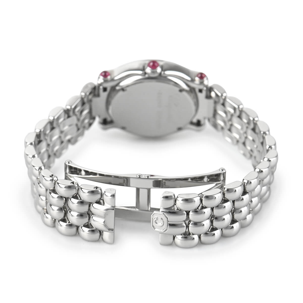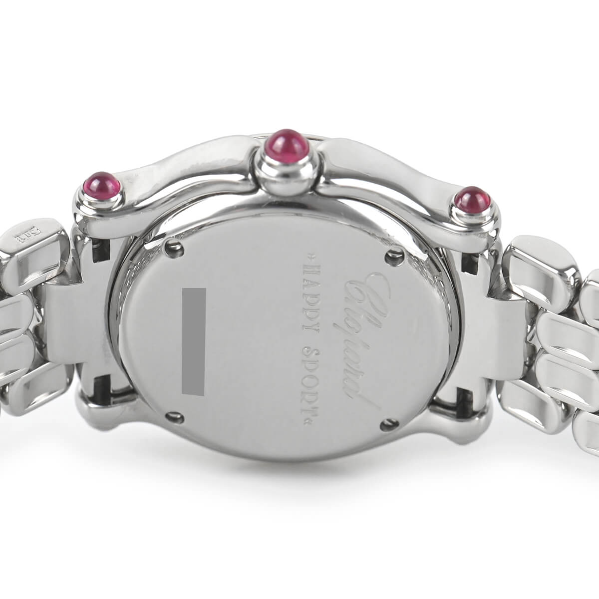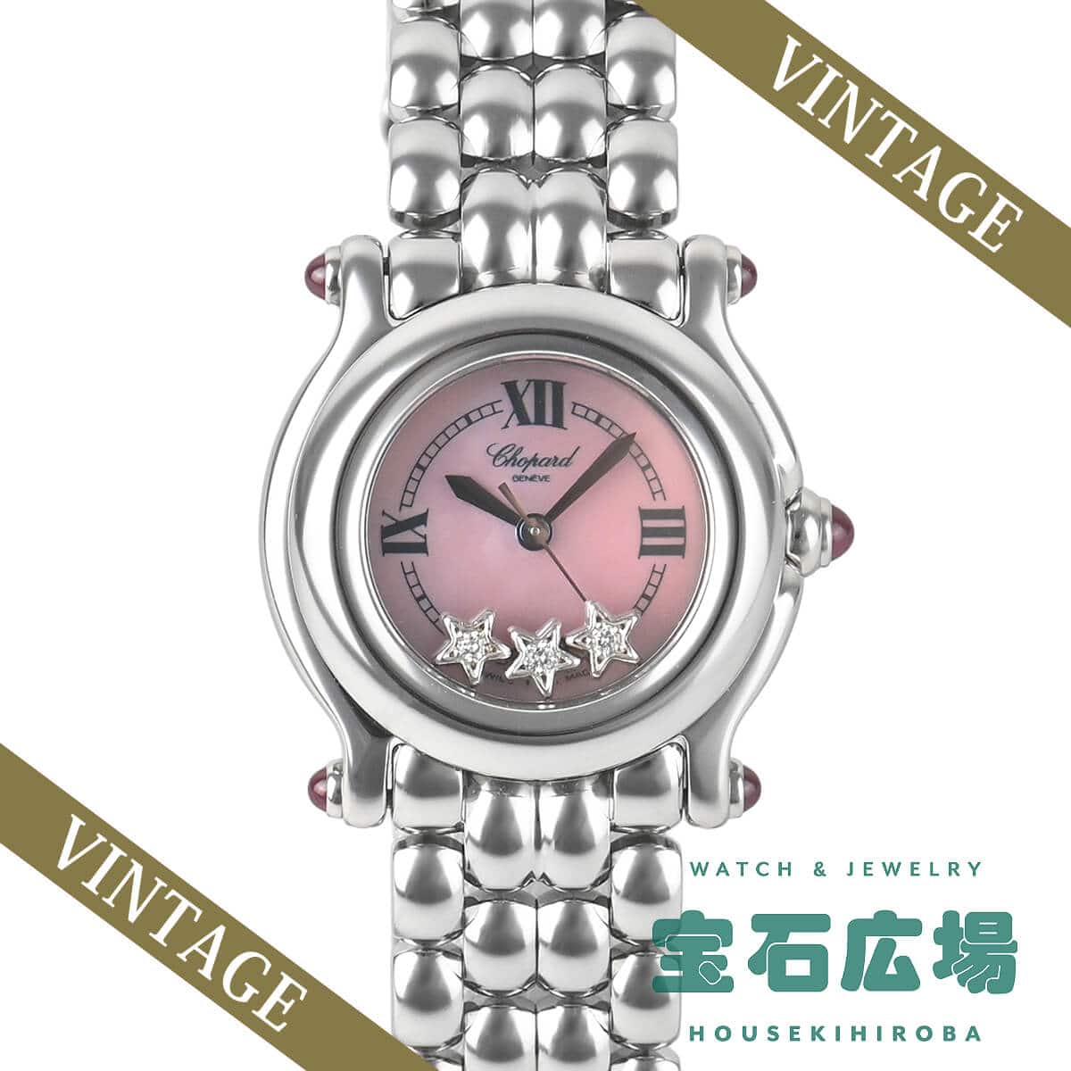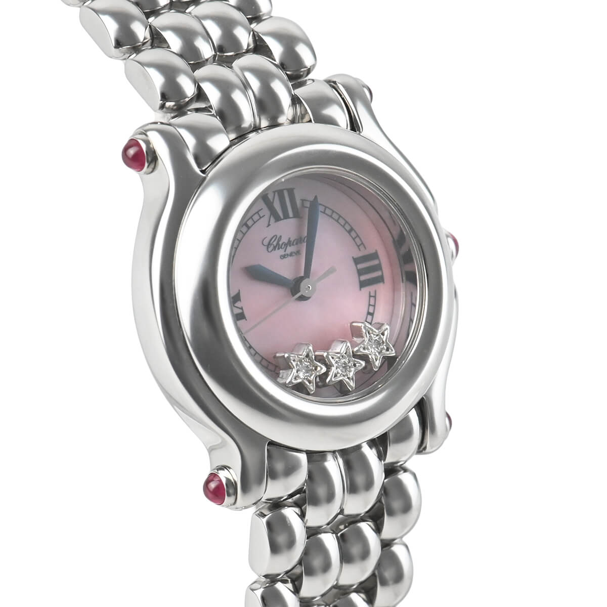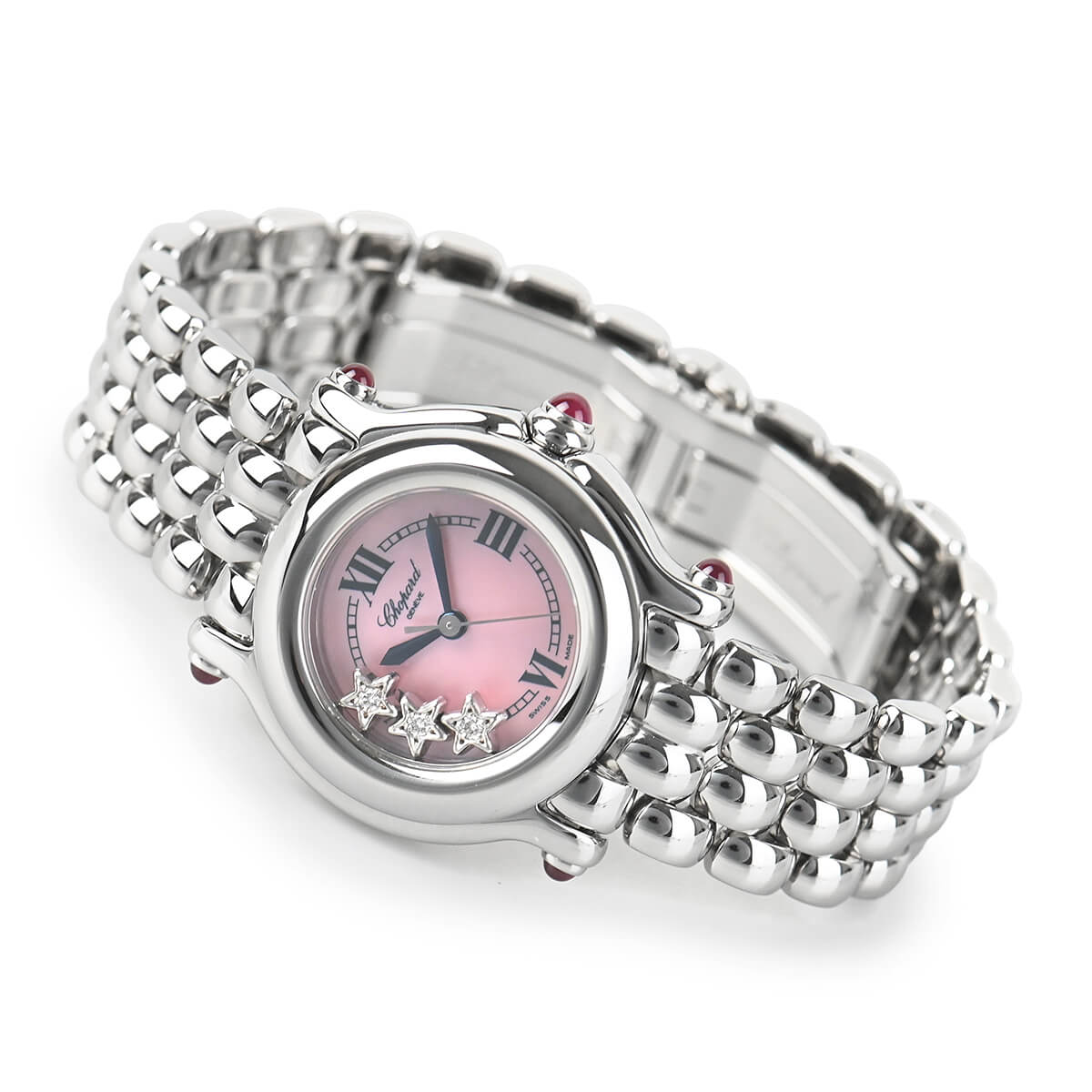 ショパールを代表する個性派ウォッチ「ハッピースポーツ」が入荷しました。ハッピースポーツは、カボションの石とダイヤルの組み合わせに様々な種類がありますが、今回入荷したのはピンクサファイヤカボションにピンクシェルダイヤル。ダイヤモンドは3ポイントの星です。
