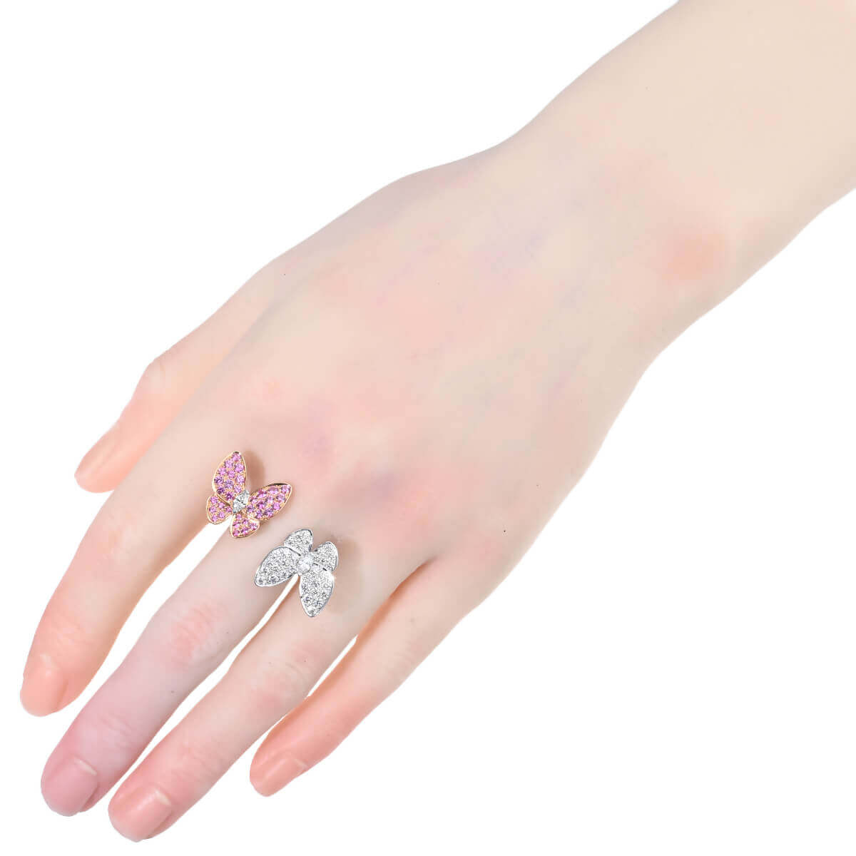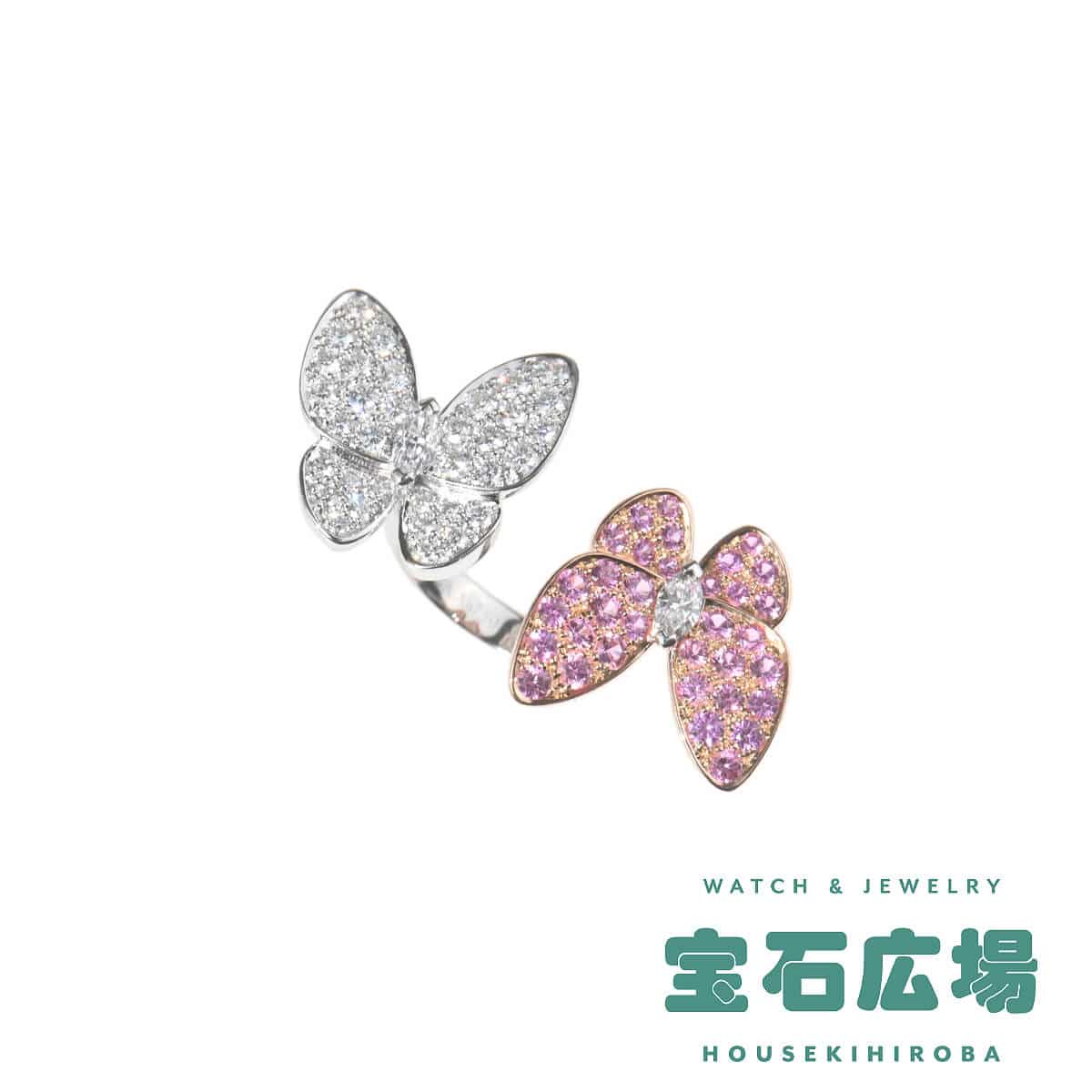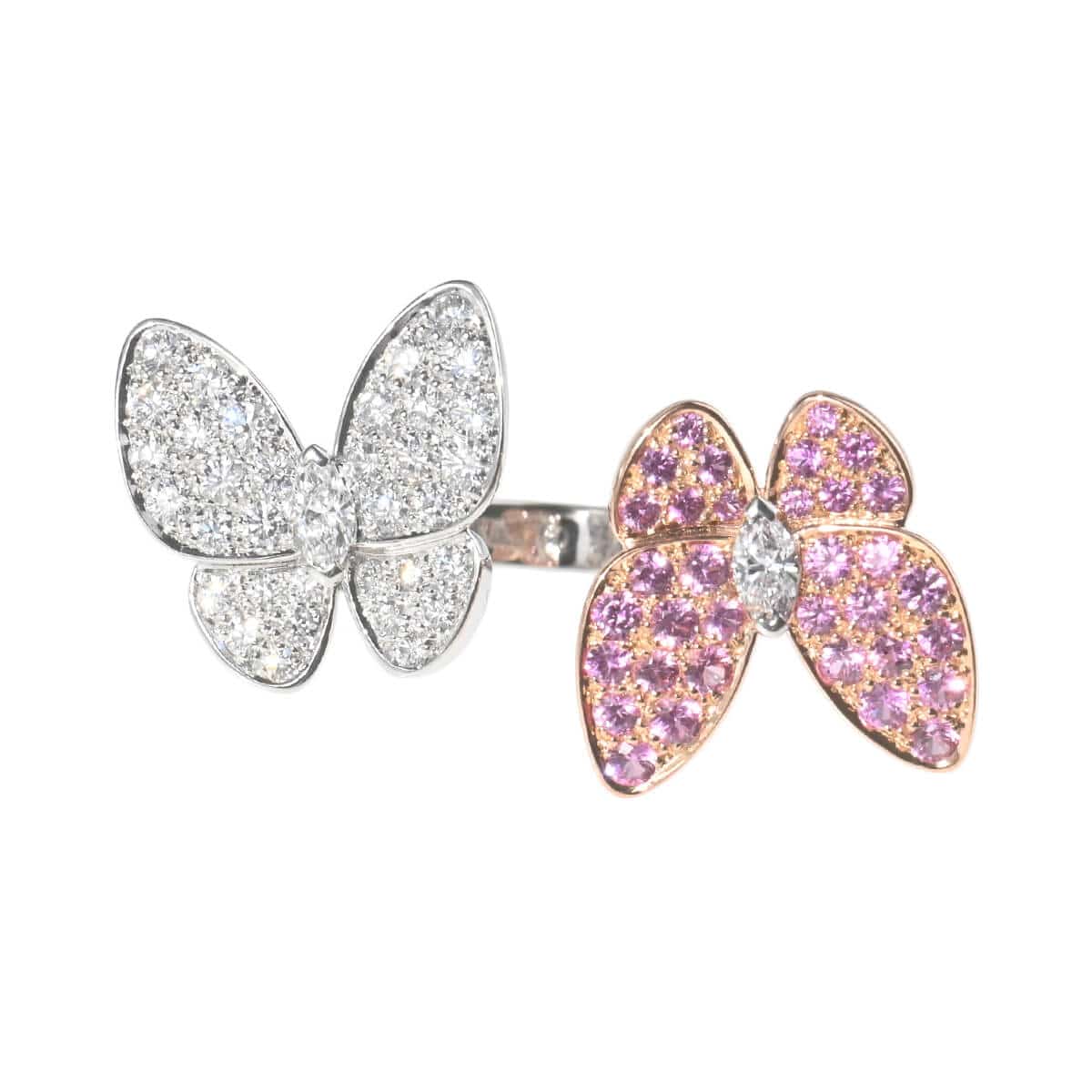 1906年、ヴァンドーム広場にて創業し、比類なき宝石をつかい、躍動する自然を表現し、美しさと調和が織りなすタイムレスな世界へと誘う、グランサンクのひとつでもある言わずと知れたパリの老舗ハイジュエリーメゾン『VanCleef&Arpels(ヴァンクリーフ&アーペル)』。メゾンが最も愛するモチーフのひとつ、“蝶”をテーマに、空を舞う蝶の優雅な美しさを表現した「ドゥ パピヨン」コレクションのホワイトゴールド製アントレレドアリングです。つけると指と指の間にモチーフが出るアントレレドアリングは、個性的な指輪のつけ方を提案したヴァンクリーフの名作。センターにマーキスダイヤモンドをあしらった2羽の蝶の羽は、片方は愛らしいピンクサファイア、もう片方は極上のダイヤモンドがパヴェセッティングされています。美しく可憐な色彩が目を惹く、洗練された存在感たっぷりの特別感あふれるハイジュエリーです。