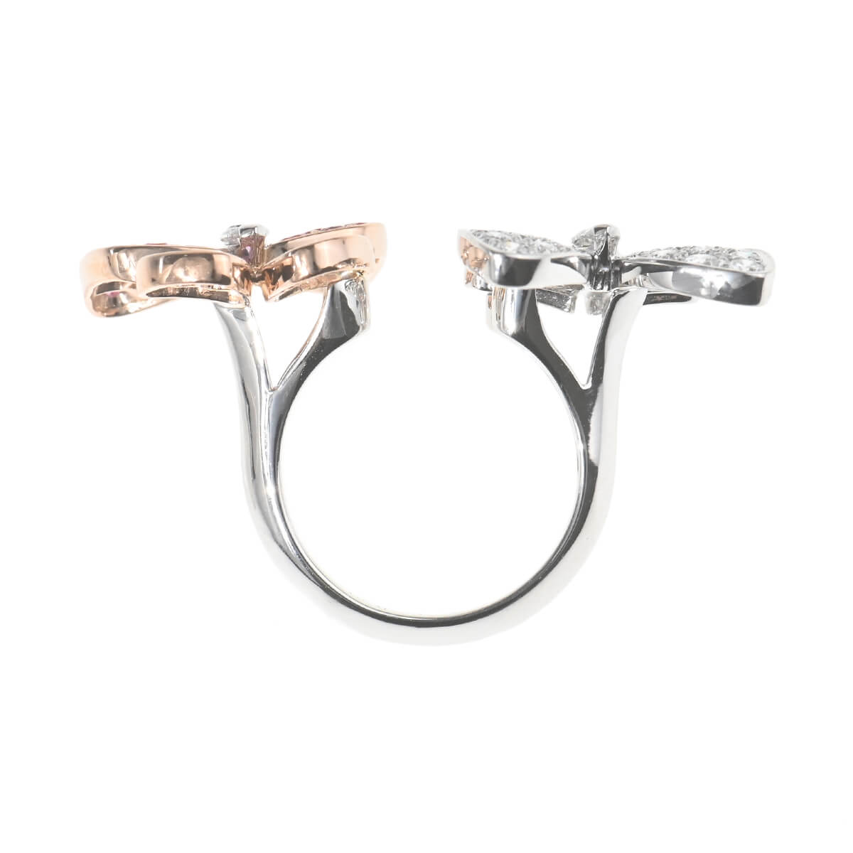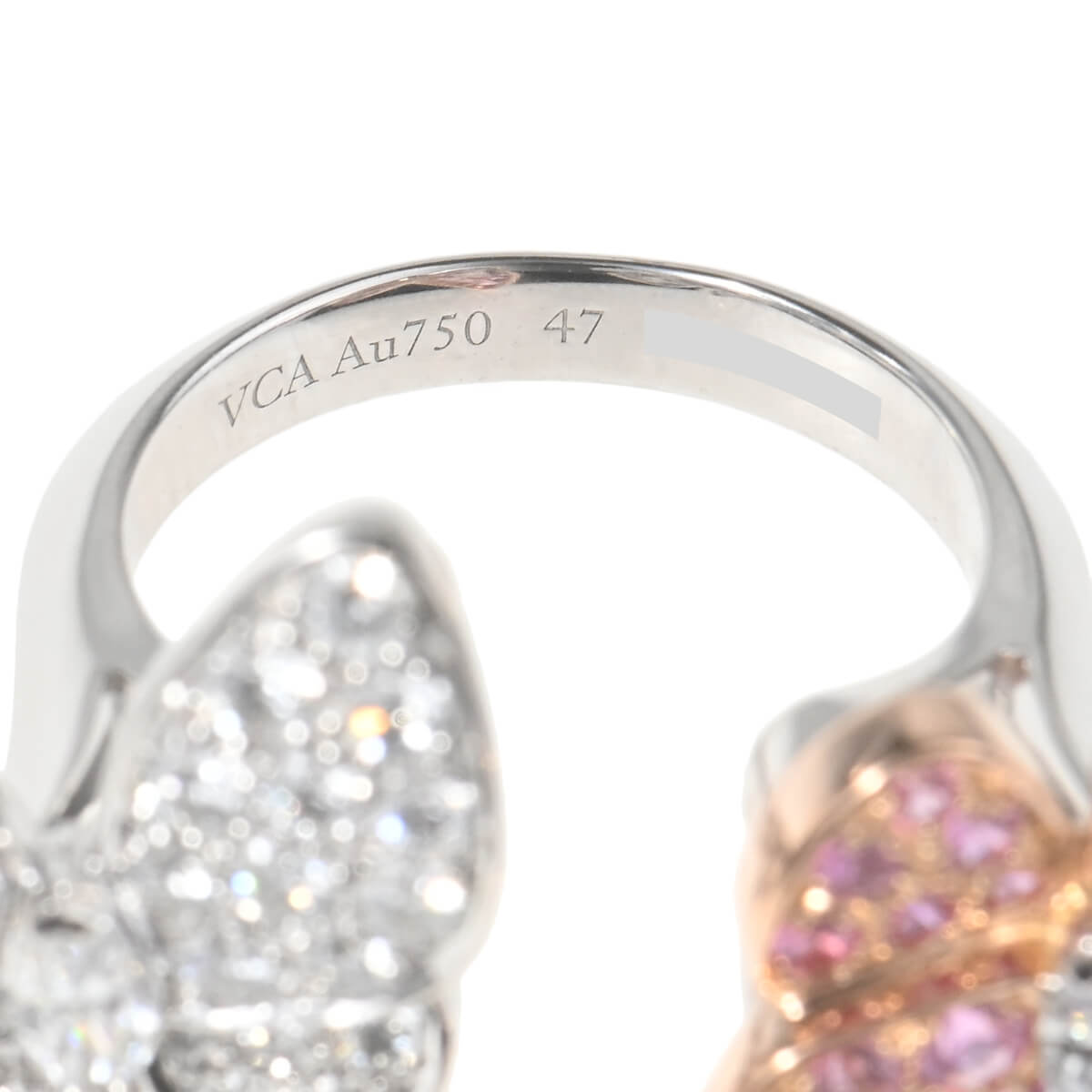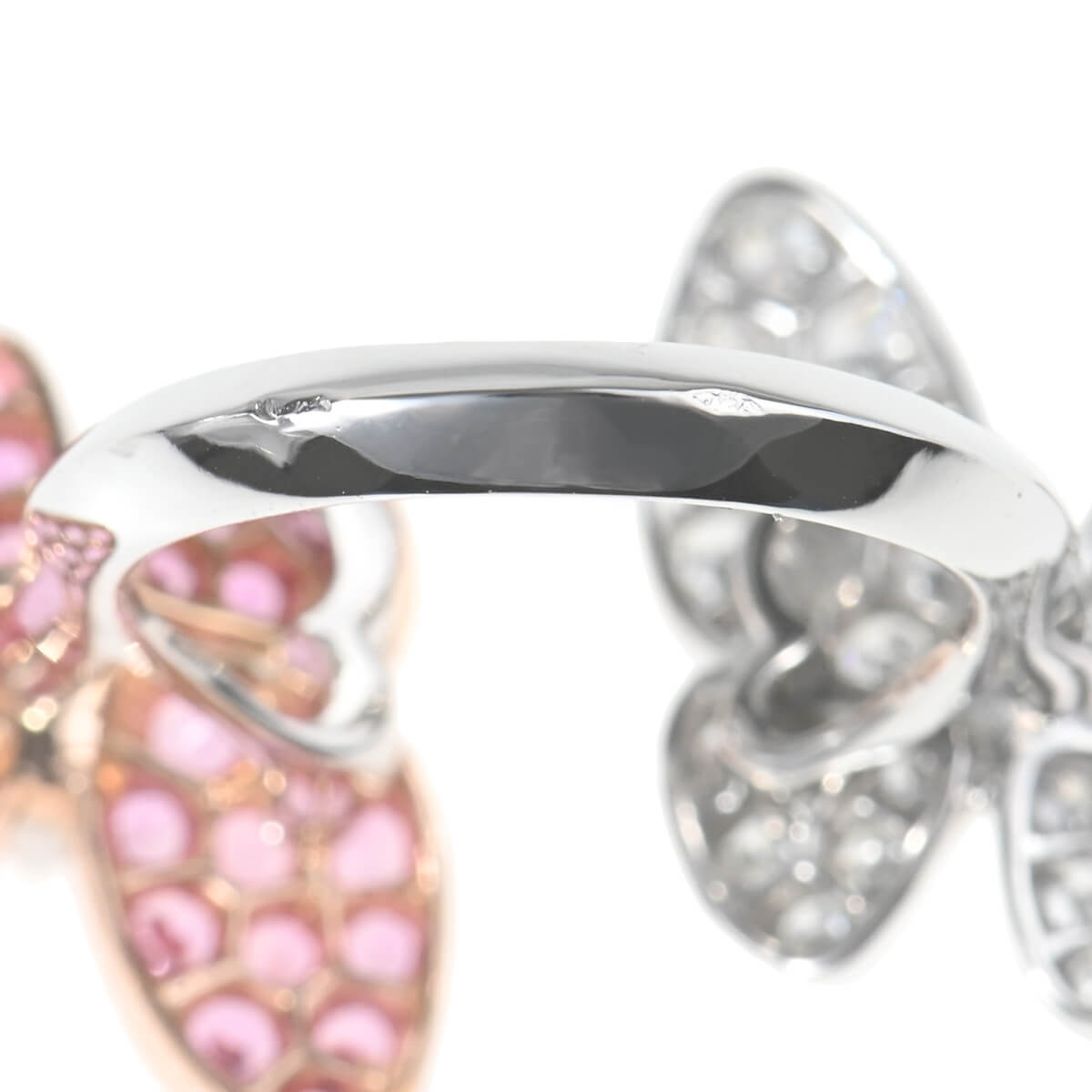 1906年、ヴァンドーム広場にて創業し、比類なき宝石をつかい、躍動する自然を表現し、美しさと調和が織りなすタイムレスな世界へと誘う、グランサンクのひとつでもある言わずと知れたパリの老舗ハイジュエリーメゾン『VanCleef&Arpels(ヴァンクリーフ&アーペル)』。メゾンが最も愛するモチーフのひとつ、“蝶”をテーマに、空を舞う蝶の優雅な美しさを表現した「ドゥ パピヨン」コレクションのホワイトゴールド製アントレレドアリングです。つけると指と指の間にモチーフが出るアントレレドアリングは、個性的な指輪のつけ方を提案したヴァンクリーフの名作。センターにマーキスダイヤモンドをあしらった2羽の蝶の羽は、片方は愛らしいピンクサファイア、もう片方は極上のダイヤモンドがパヴェセッティングされています。美しく可憐な色彩が目を惹く、洗練された存在感たっぷりの特別感あふれるハイジュエリーです。