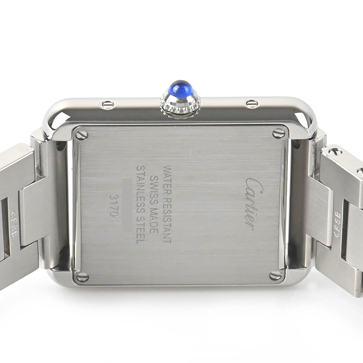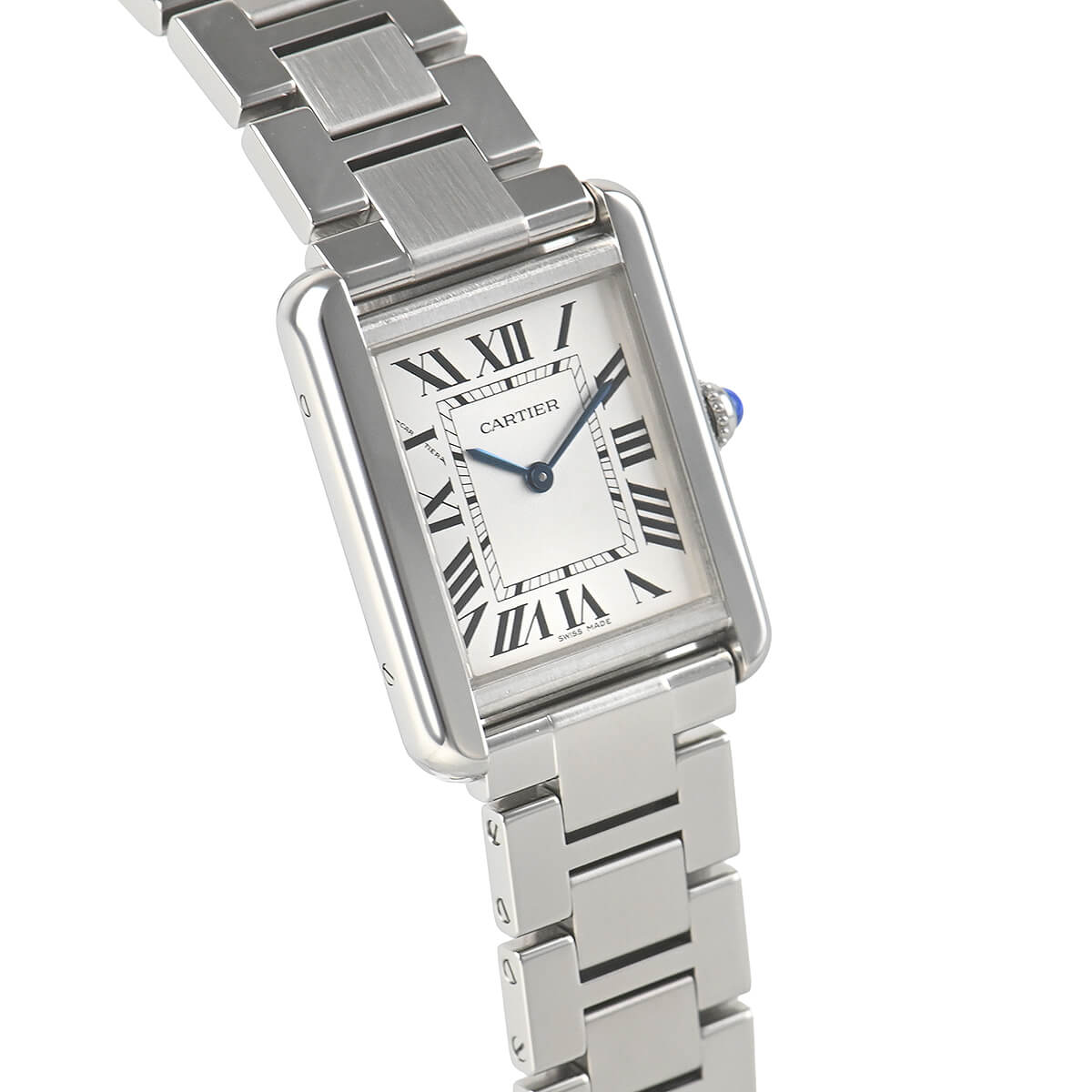 ベーシックなデザインで人気がある「タンク ソロ」のブレスレットモデル。シンプルな美しさのあるモデルですが、ブルースチールの針やローマインデックスなどカルティエらしさも溢れたデザインです。