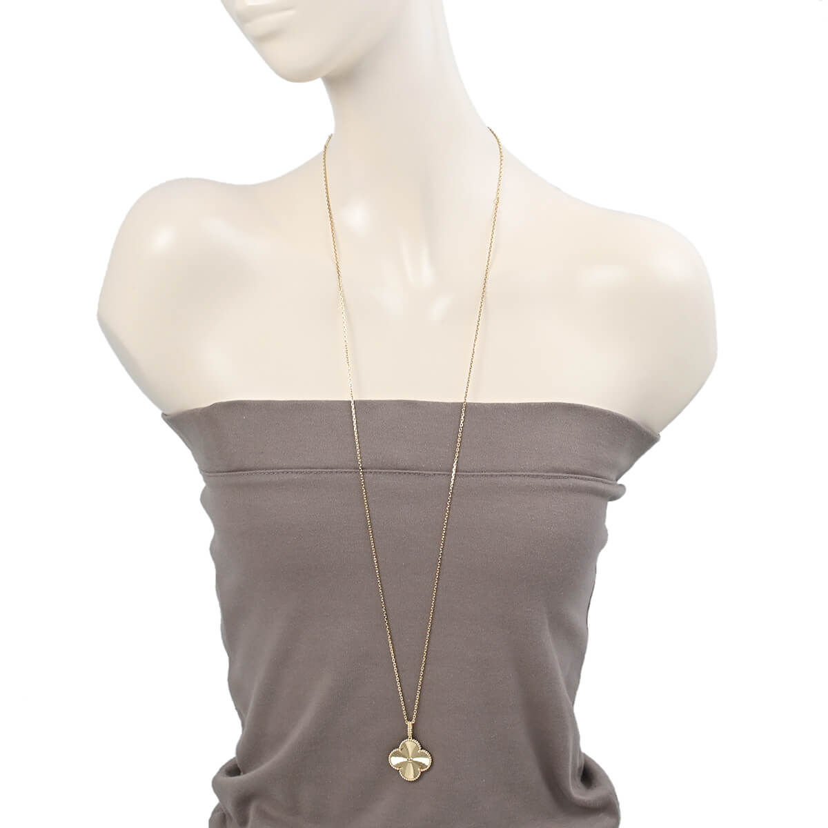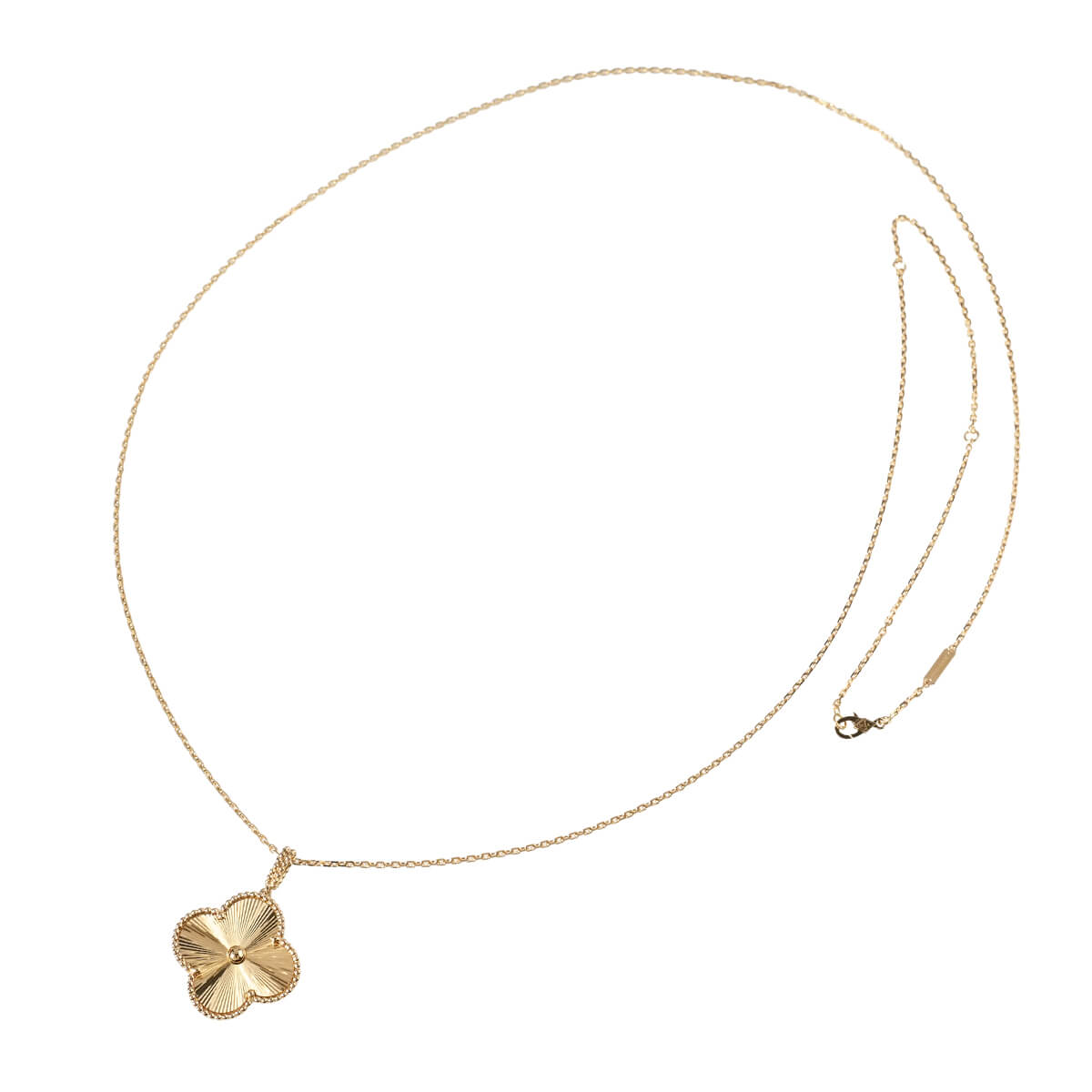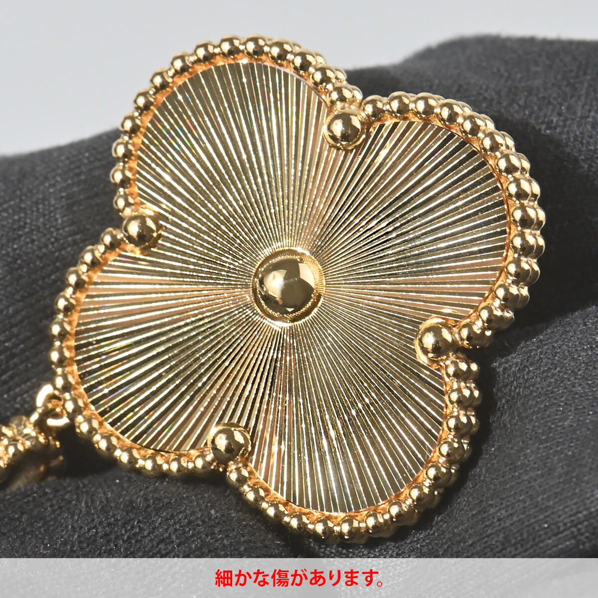 2006年に『VanCleef&Arpels(ヴァンクリーフ&アーペル)』が新たに制作した「マジックアルハンブラ」。さまざまなサイズのアルハンブラモチーフが作品に輝きと色彩をもたらし、楽しげなハーモニーを奏でる魅惑的なコレクションです。2018年に初めて「アルハンブラ」コレクションに加わり、誇らしくその存在感を示している“ギヨシェ彫刻”のイエローゴールドモチーフが約90cmものロングチェーンにひとつあしらわれた、定番アルハンブラとは違う、ドラマティックな存在感たっぷりのペンダント。金細工やテーブルウェアから着想を得た伝統的な職人技であるこの伝統技法“ギヨシェ彫刻”は、1910年代に時計の文字盤に採用したことに始まり、オブジェやアクセサリーに用いられ、今ではメゾンの歴史を物語る重要な技法のひとつとなっています。深い彫り込みがマテリアルの表面に繊細なレリーフ効果をもたらし、まるで太陽の光が反射するように華やかな光を放つ“ギヨシェ彫刻”が、この幸運のシンボルをひときわ美しく輝かせているペンダントです。