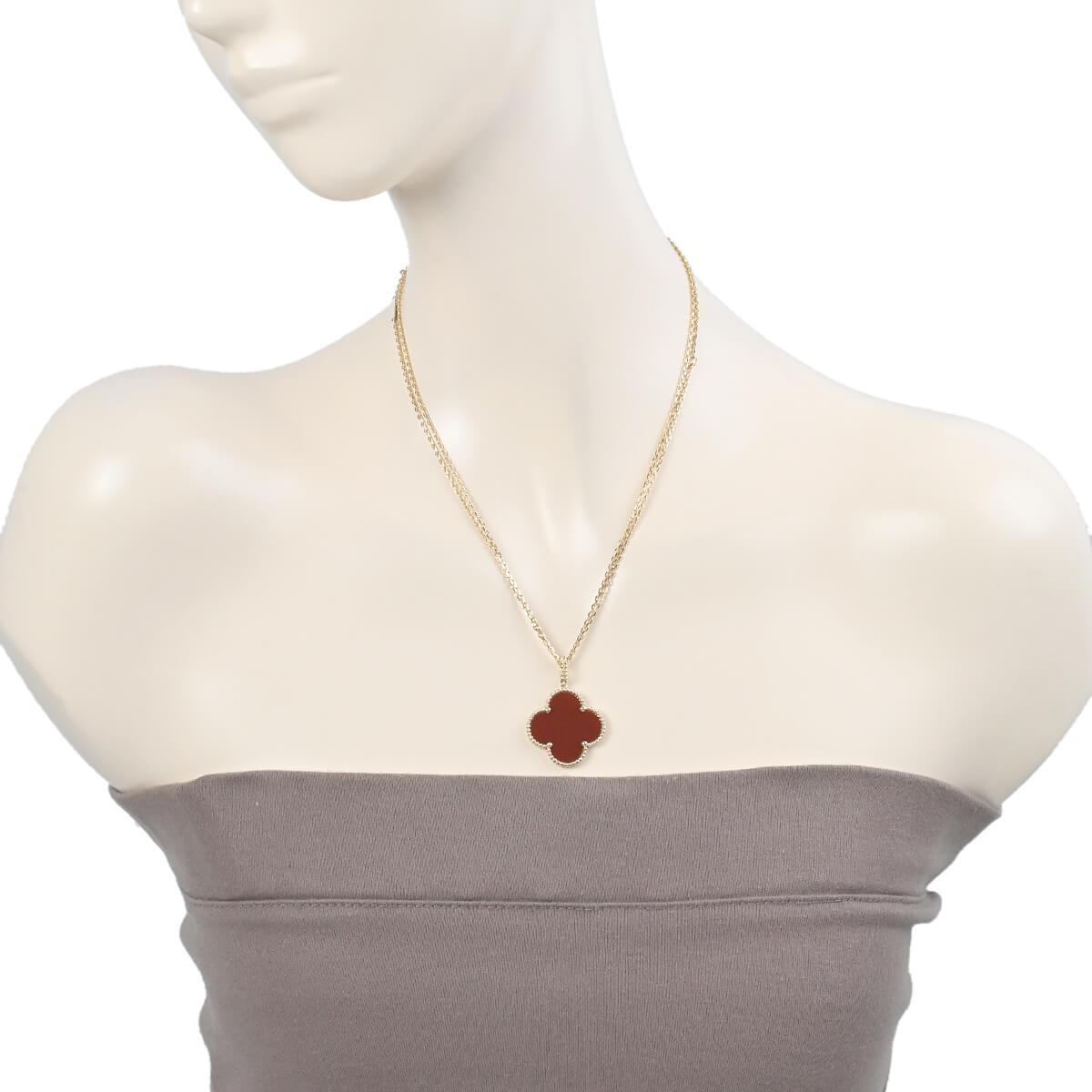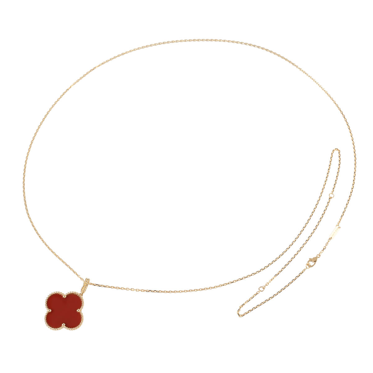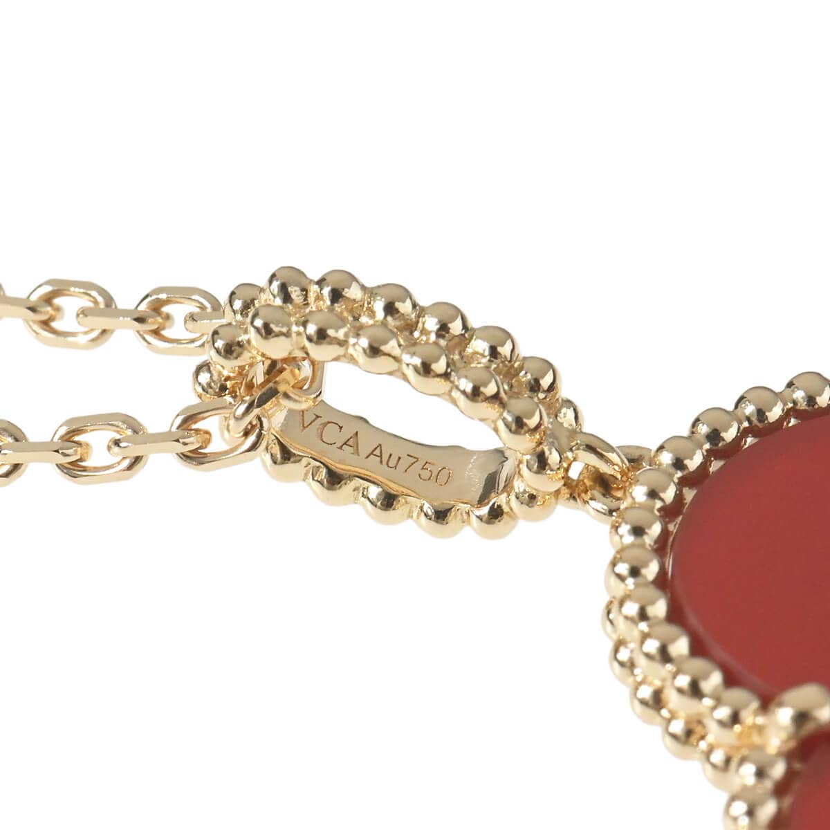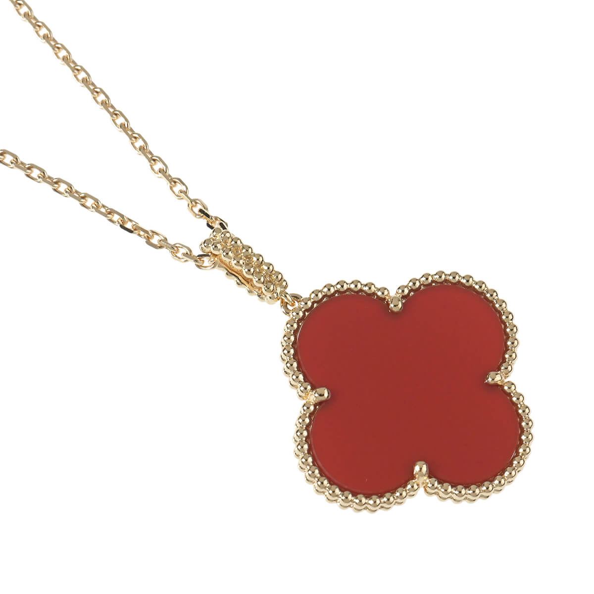 1968年に初めて誕生した幸運のシンボル「アルハンブラ」の特徴を受け継ぎ、『VanCleef&Arpels(ヴァンクリーフ&アーペル)』ならではの独創性と時を超えるエレガンスを湛える「ヴィンテージアルハンブラ」コレクションは、エレガントで清楚、控えめでありながら洗練された、メゾンを代表するアイコン。2006年にヴァンクリーフ&アーペルが新たに制作した「マジックアルハンブラ」は、さまざまなサイズのアルハンブラモチーフが作品に輝きと色彩をもたらし、楽しげなハーモニーを奏でる魅惑的なコレクションです。フェミニンなビーズに縁取られたアイコニックなカーネリアンのクローバーモチーフが、約90cmものロングチェーンにひとつあしらわれた、定番アルハンブラとは違う、ドラマティックな存在感たっぷりのペンダント。ひとめでそれとわかるラッキーチャームを、どのタイミングで、どのカラーで迎えるかを考えるのも楽しい、エレガントに映えるハッピーな魅力にあふれたコレクションジュエリーです。