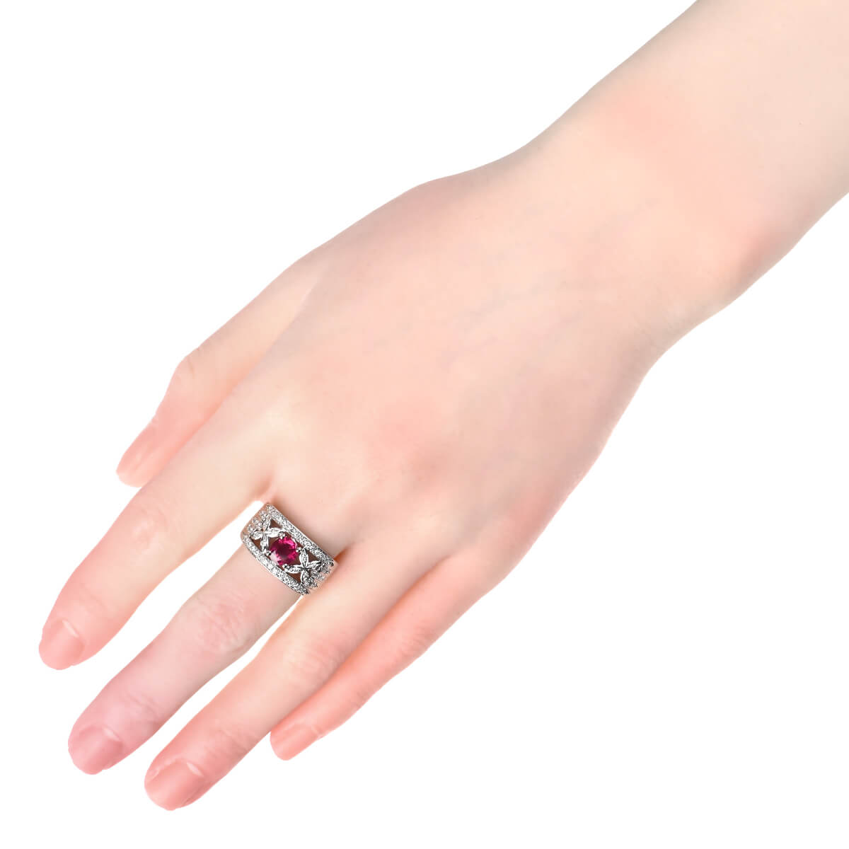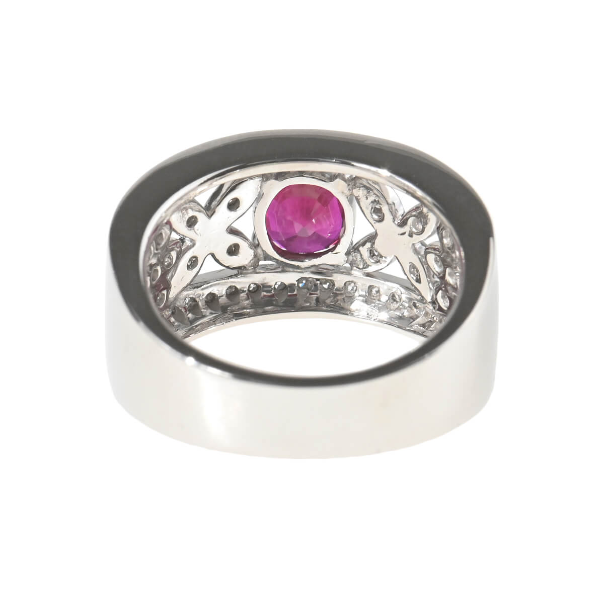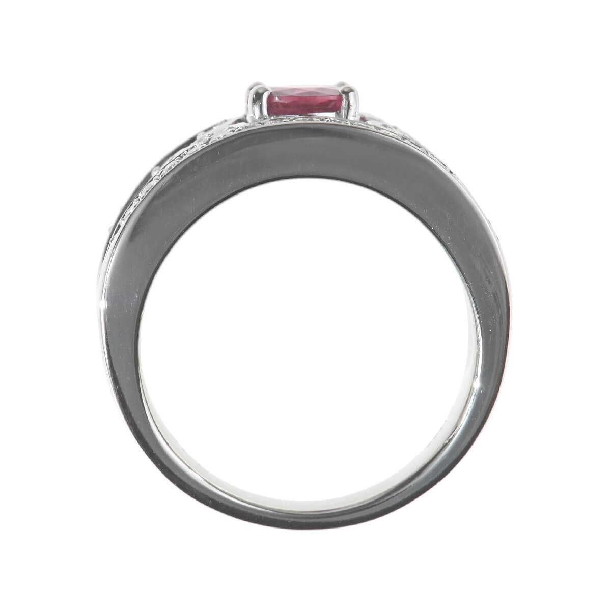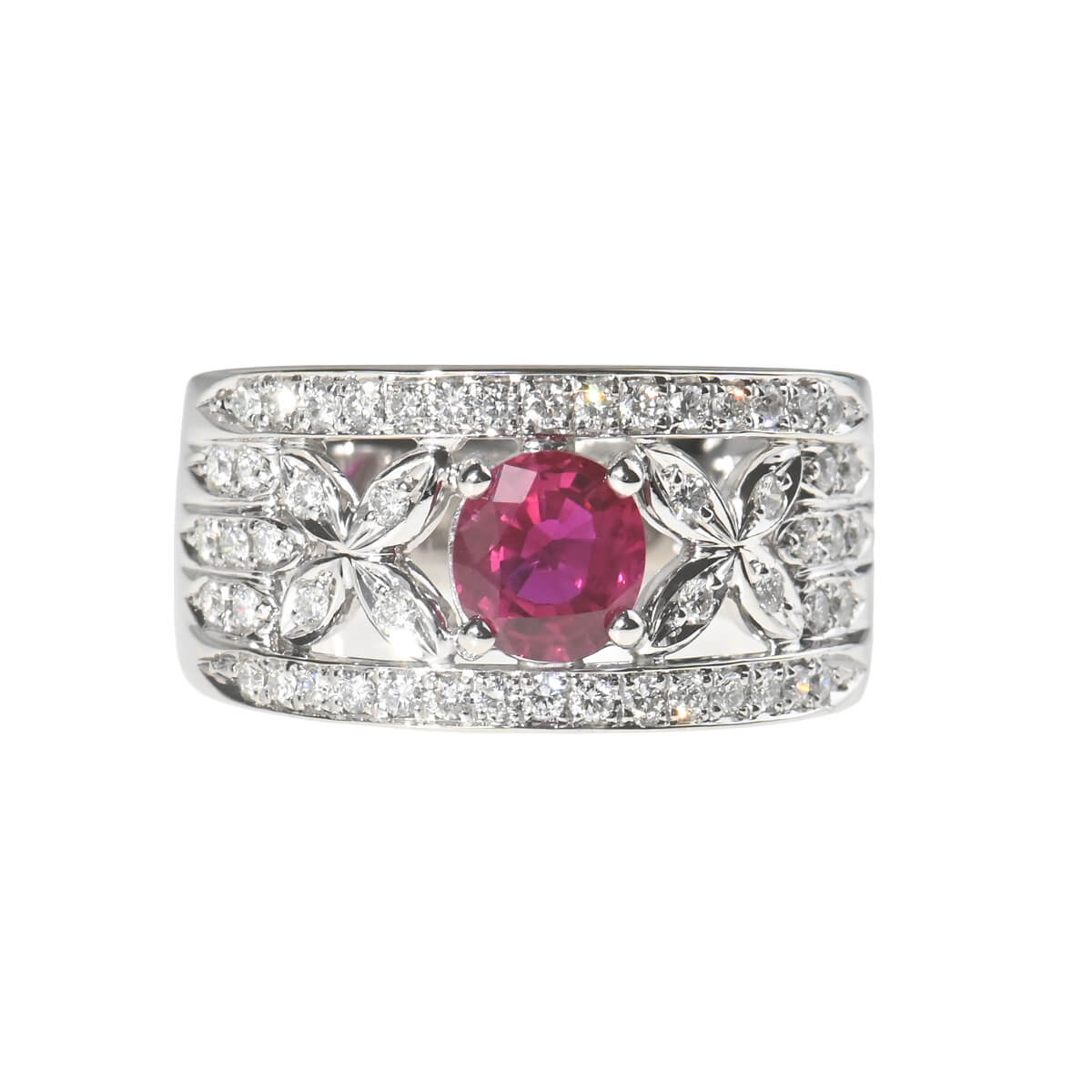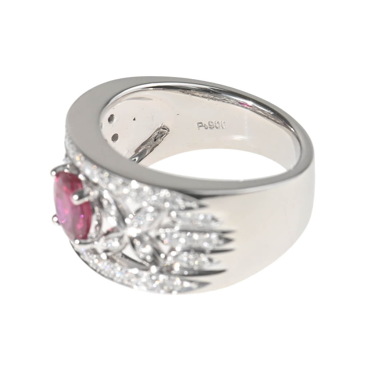 サンスクリット語で“宝石の王”を意味する「RATNARAJ(ラトナラジュ)」に由来し、“赤”を意味するラテン語の「RUBEUS(ルベウス)」から名付けられた宝石「ルビー」。歴史的にも最も重要なカラーストーンのひとつでもあるこの宝石の赤色は、不滅の炎と信じられ、情熱や深い愛情と結びつくと考えられてきました。1.108ctもの深紅のルビーとまわりを飾るダイヤモンドが華やかなコントラストを魅せる、プラチナ製リング。見るひとを魅了する大粒ルビーが一層際立ち、指先を印象的に、優美に彩るリングはドレスアップや和装にはもちろん、デイリーのスタイリングのアクセントにしても素敵。しっかりとしたつくりと、美しい存在感が魅力の、本格カラーストーンジュエリーです。