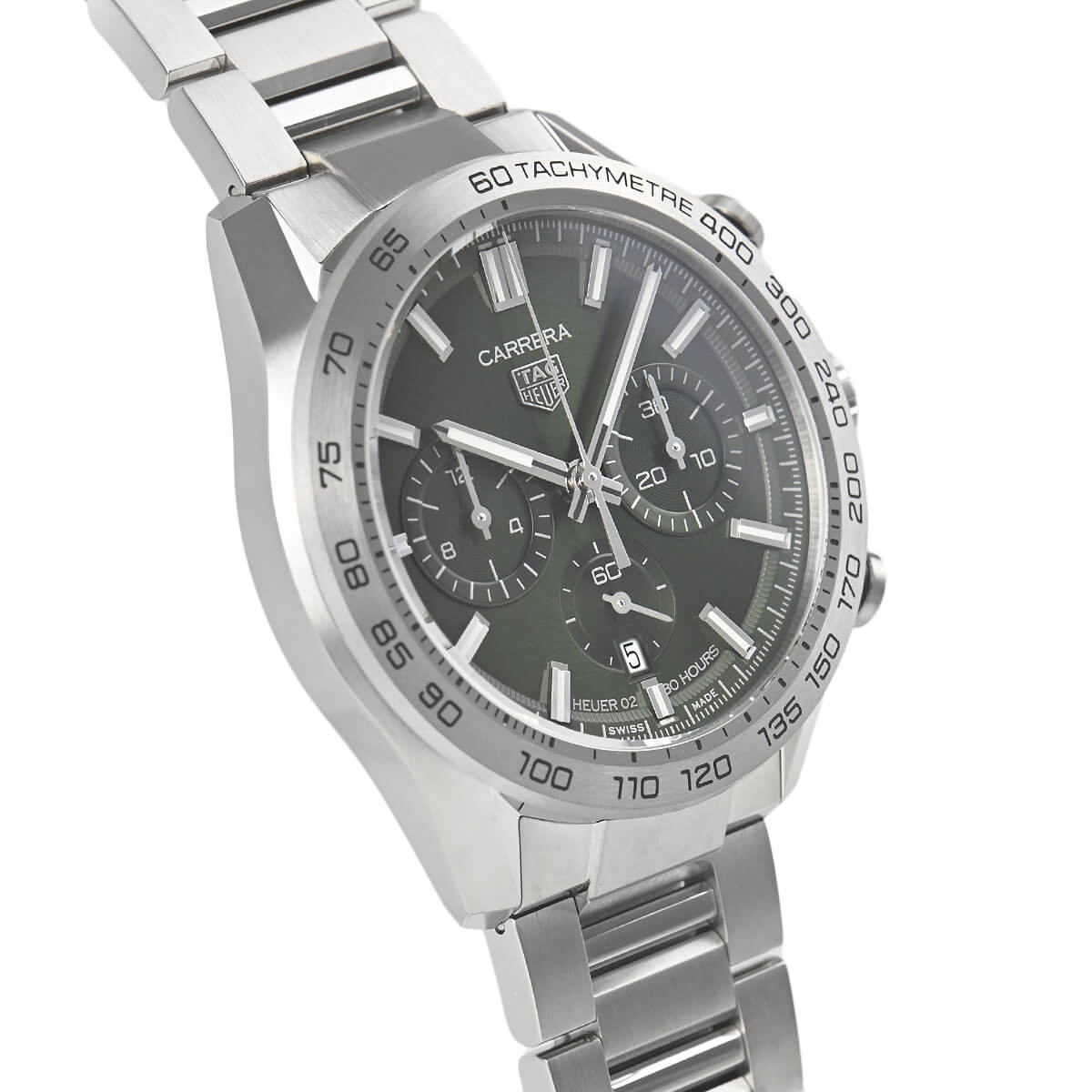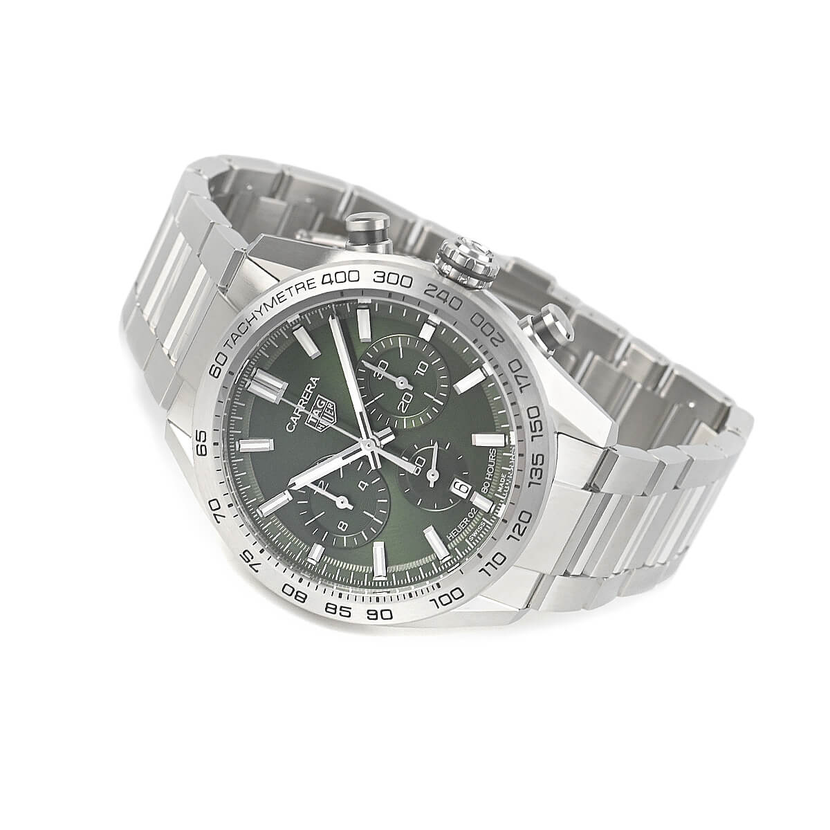 人間工学に基づき新たに設計された44mmケースを採用した【カレラ キャリバーホイヤー02 スポーツクロノグラフ】。文字盤のデザインもホイヤー01搭載モデルが縦3つ目のクロノグラフであったのに対して、ホイヤー02を搭載するこちらのモデルはバランスの良い下3つ目となっています。