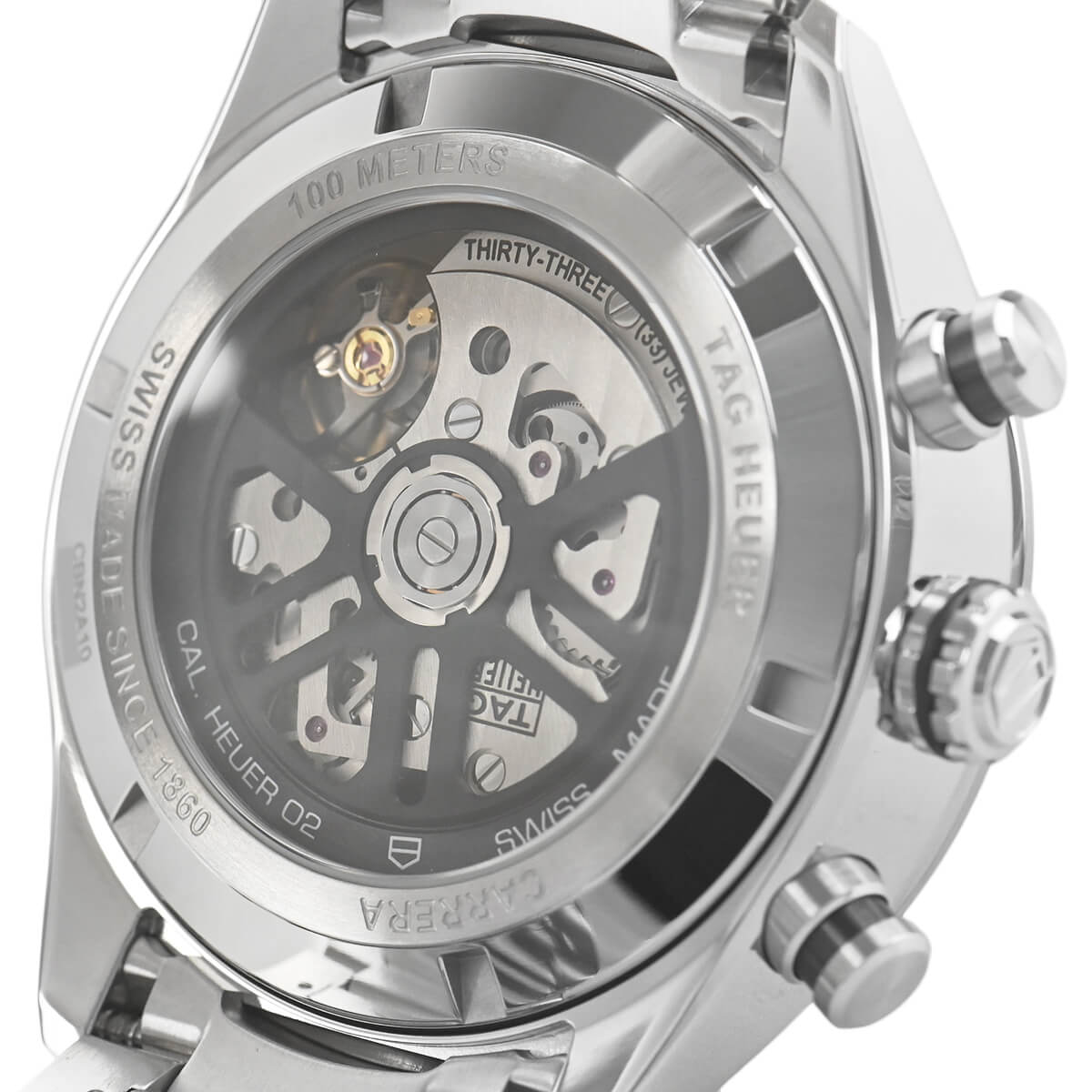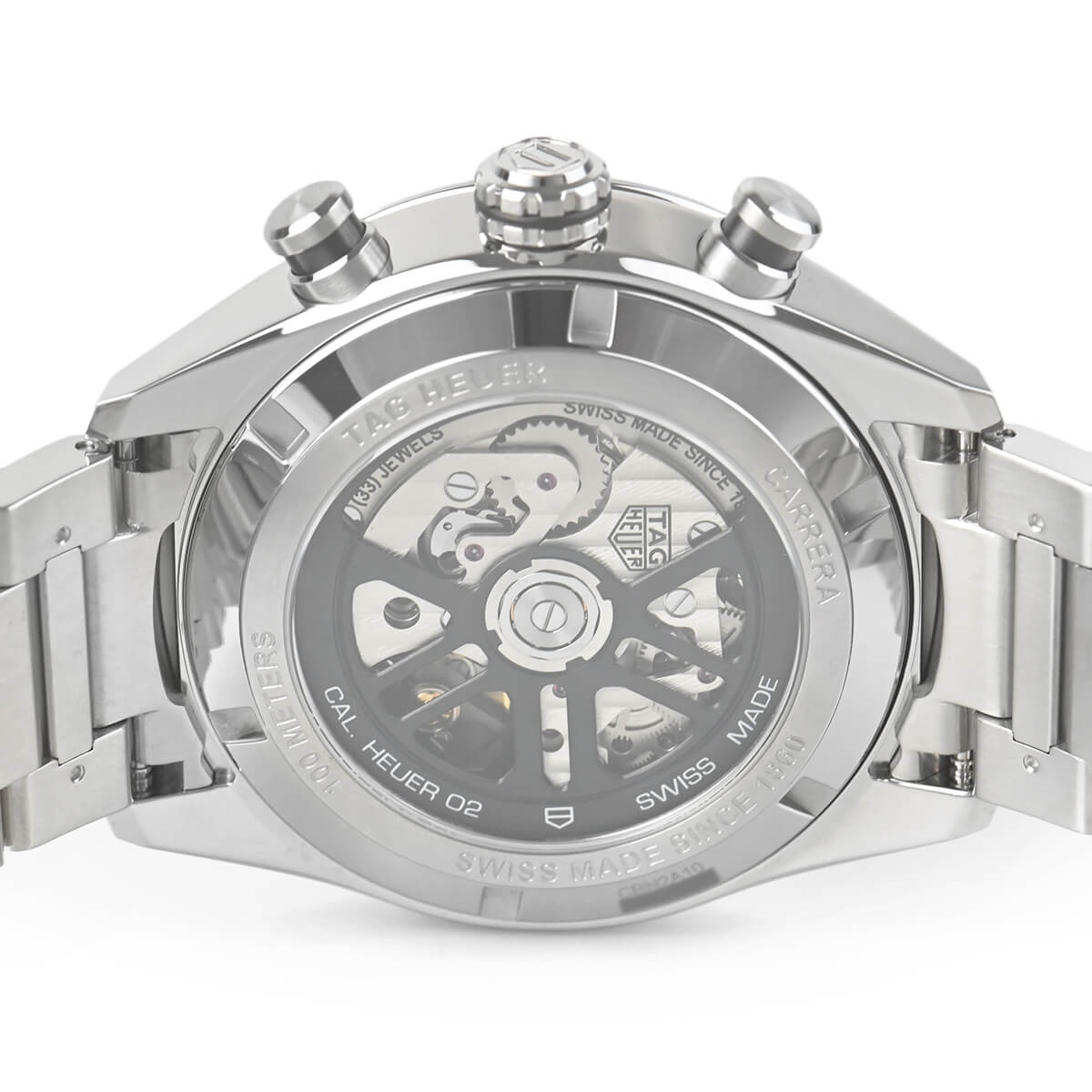 ムーブメントには80時間ものロングパワーリザーブを誇る、垂直クラッチ式クロノグラフムーブメントの「ホイヤー02」を搭載。