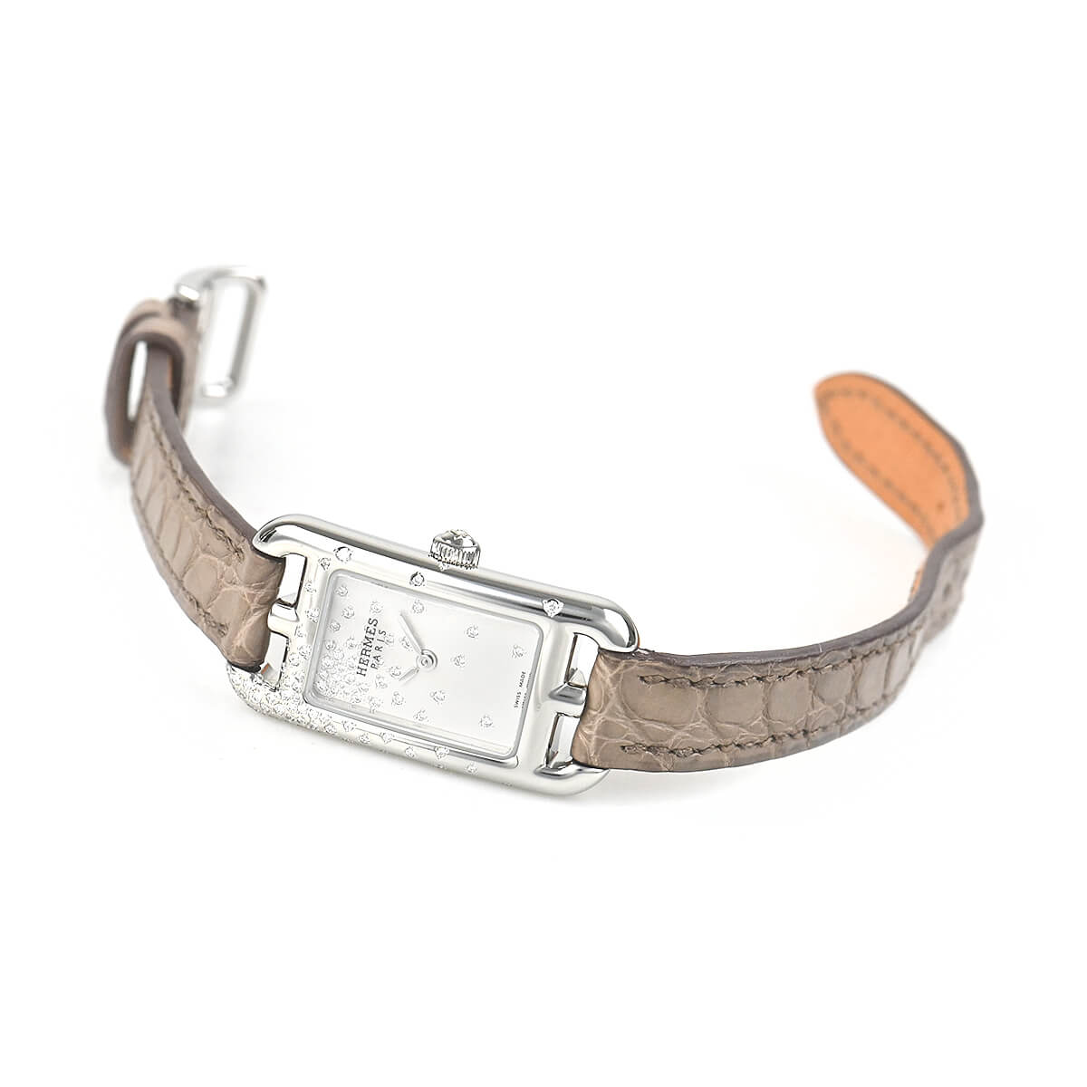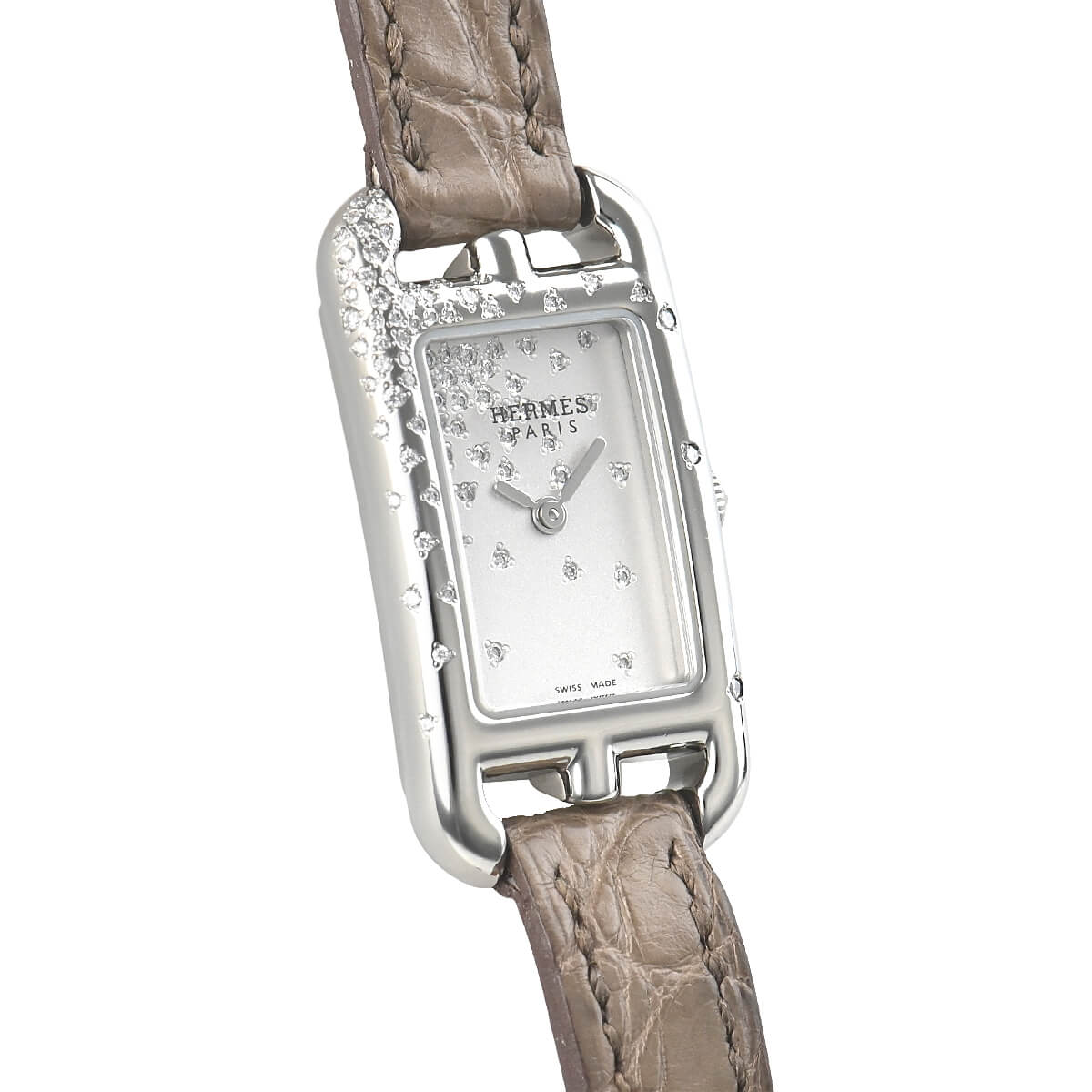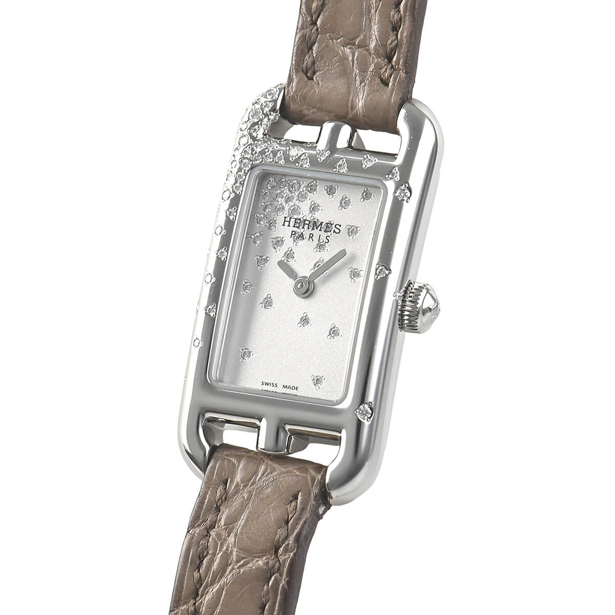 エルメスのアイコニックジュエリー「シェーヌ・ダンクル」をモチーフにレクタングルケースに進化させた「ナンタケット」。こちらは、ケースから文字盤にかけて雪や花が舞い落ちる様を表現した「ジュテ・ドゥ・ディアマン」。