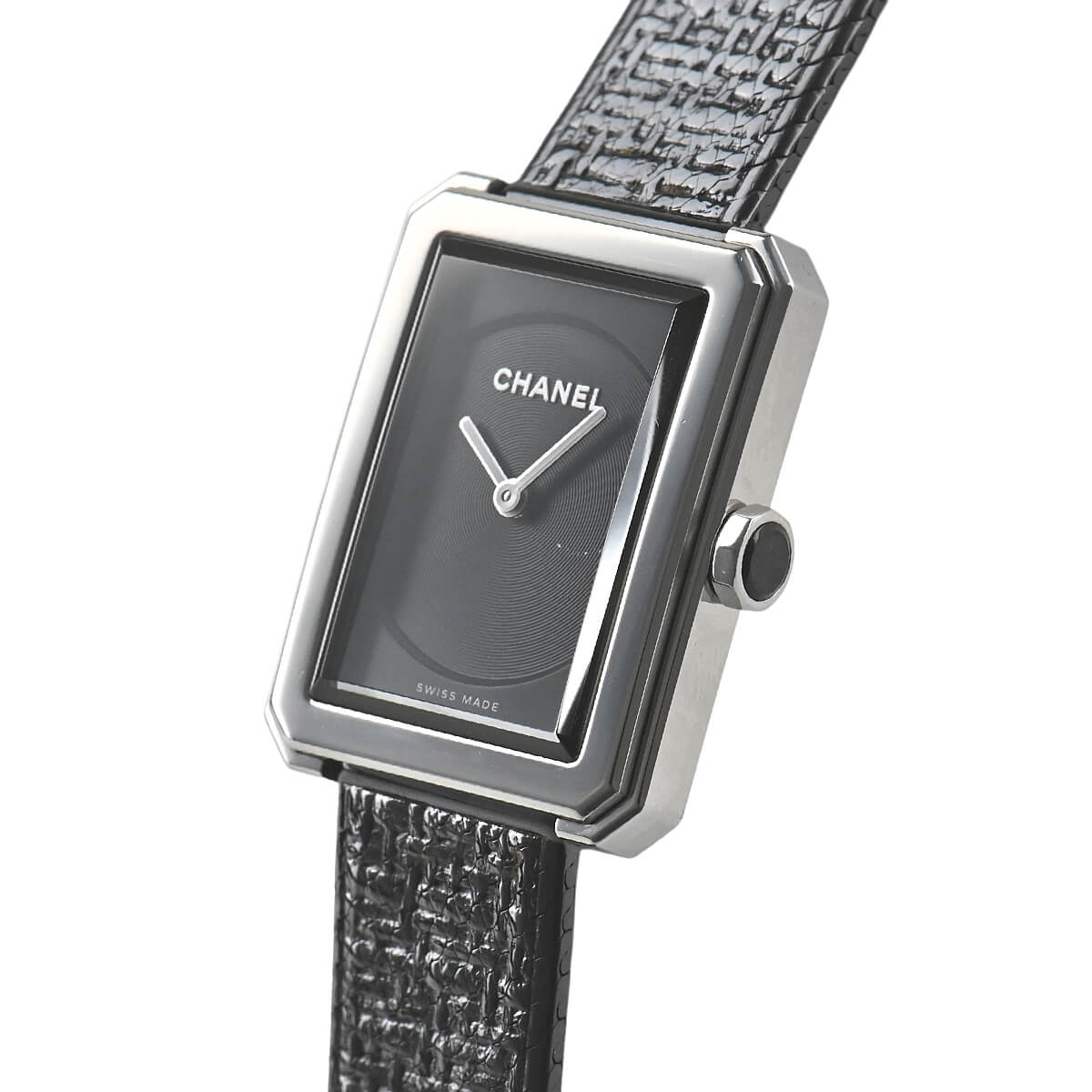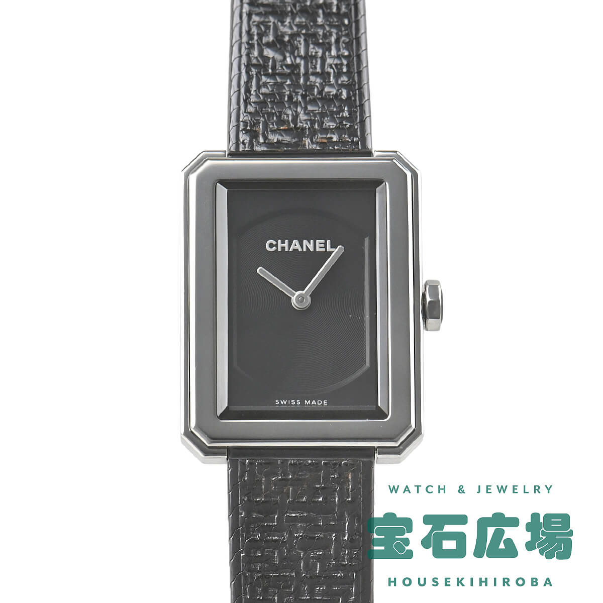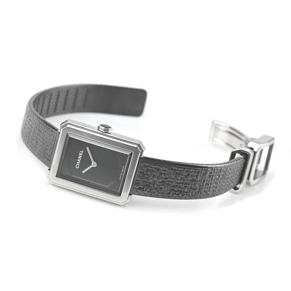「ボーイフレンド」シリーズはヴァンドーム広場と香水のシャネルNO5のボトルキャップに敬意を表し、8角形のデザインを採用したレディースコレクションです。こちらは「ボーイフレンド ツィード」を発展させ、ツィード柄をエンボス加工したステンレスブレスレットにブラックコーティングを施して、シックでマスキュリンな雰囲気を演出したモデルです。