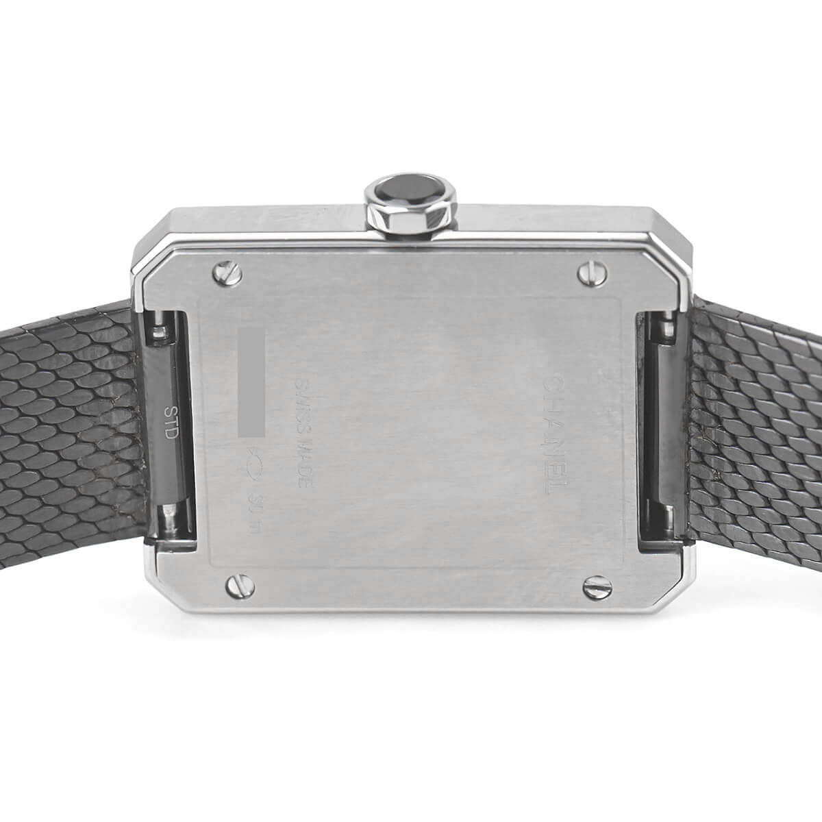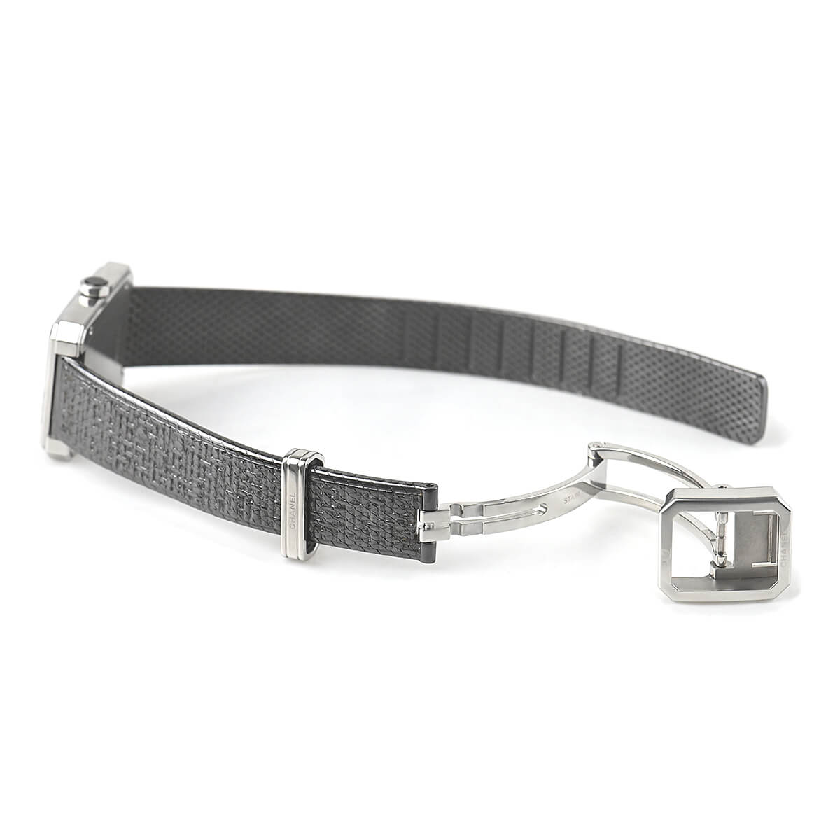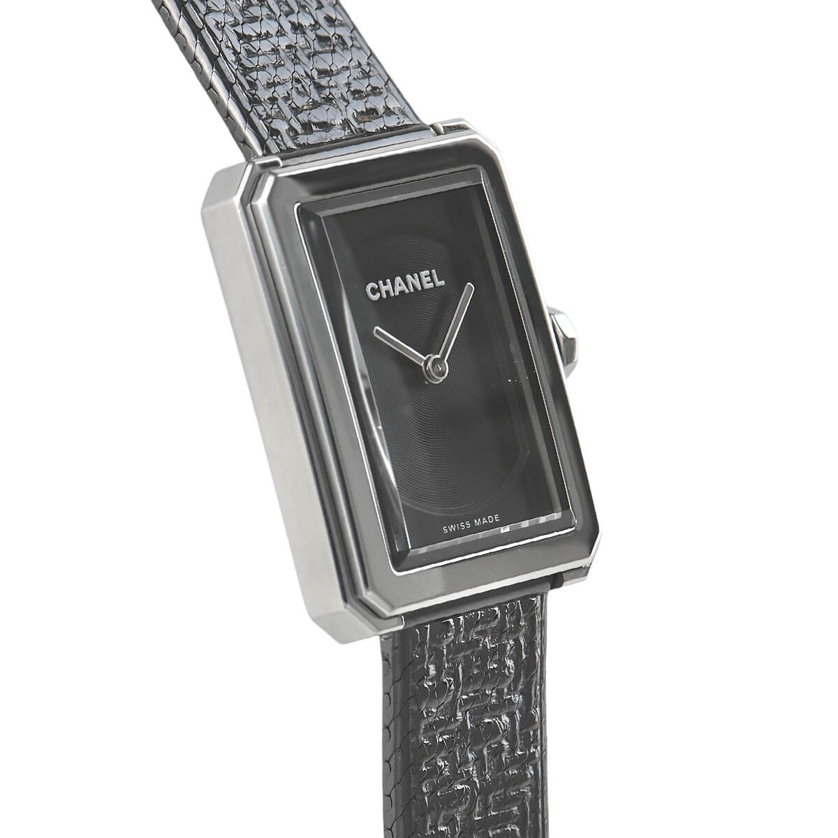 「ボーイフレンド」シリーズはヴァンドーム広場と香水のシャネルNO5のボトルキャップに敬意を表し、8角形のデザインを採用したレディースコレクションです。こちらは「ボーイフレンド ツィード」を発展させ、ツィード柄をエンボス加工したステンレスブレスレットにブラックコーティングを施して、シックでマスキュリンな雰囲気を演出したモデルです。