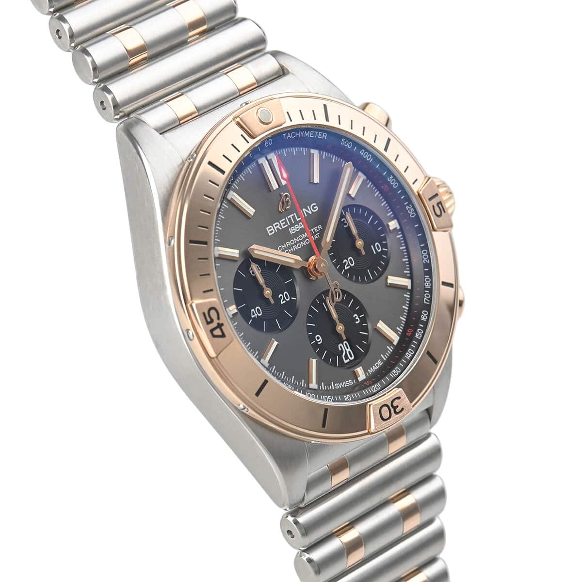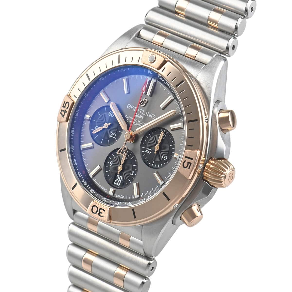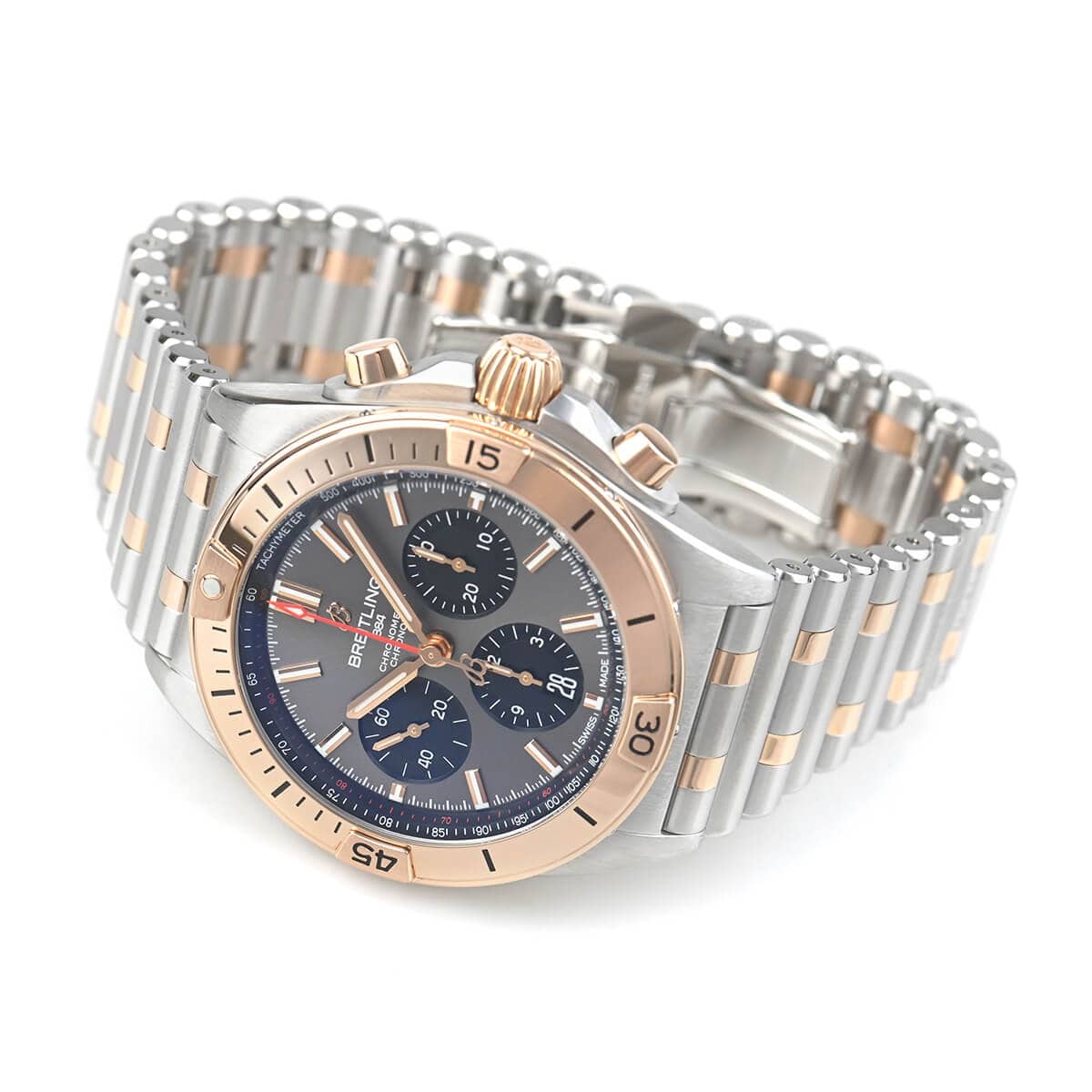 こちらの【クロノマットB01 42】は、初代クロノマットにあったオニオン型リューズ、回転ベゼル上に設けた4つのライダータブ、ルーローブレスを現代的にアップデートさせたデザインで体現したモデル。