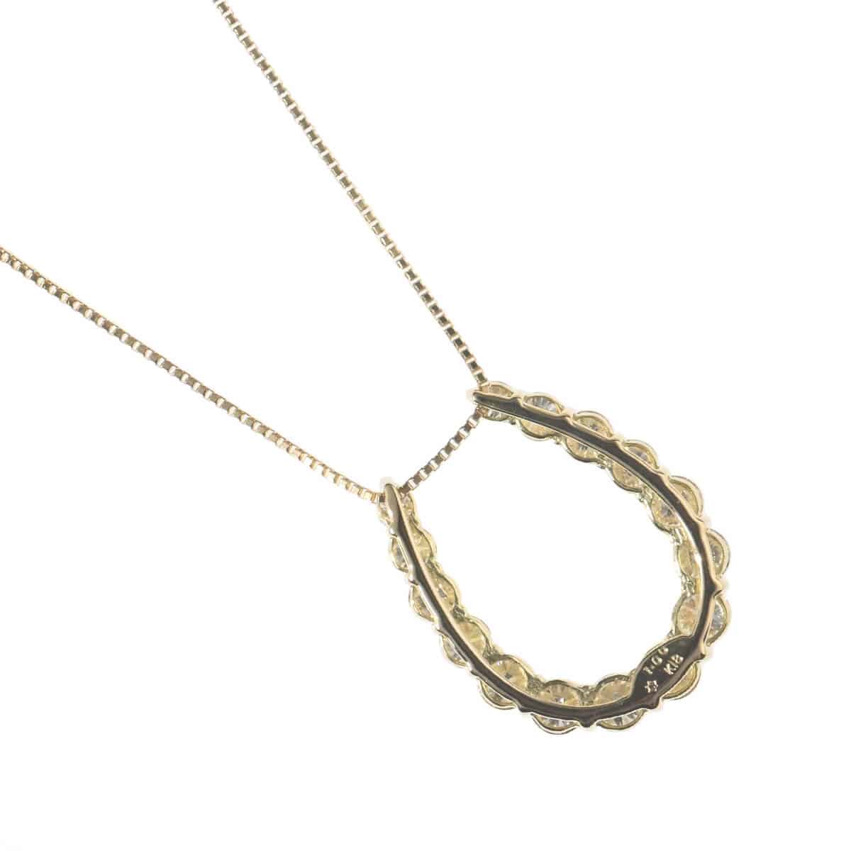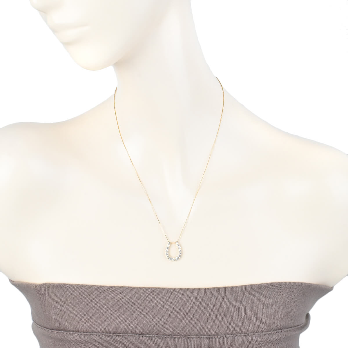 世界中で魔除けやお守りとして昔から愛されてきたラッキーモチーフ、U字型の窪みで幸せを受けとめ満たしてくれるといわれる馬の蹄につける“蹄鉄”、「ホースシュー(馬蹄型)」がデザインされた、イエローゴールド製ペンダントネックレスです。トータル1.00ctものダイヤモンドで描かれたラッキーモチーフが、スタイリングを惹きたてながら、日常に本物の輝きを添えてくれそうですね。洗練された美しい存在感をもつダイヤモンドジュエリーは、ワーキングシーンから休日カジュアルまで幅広いスタイリングで活躍します。