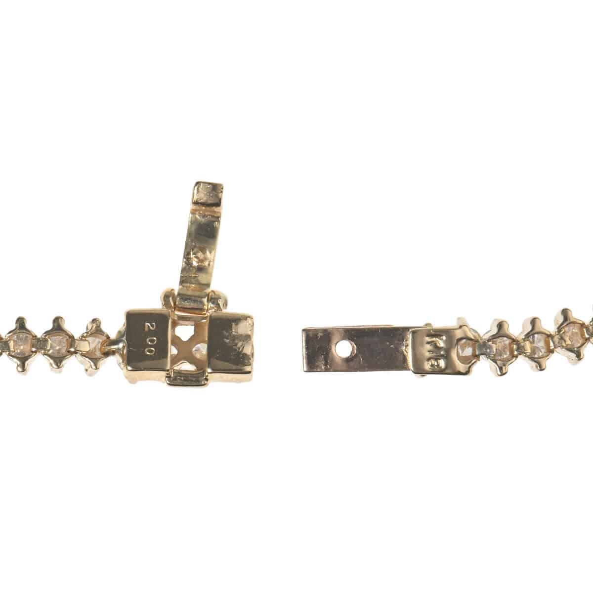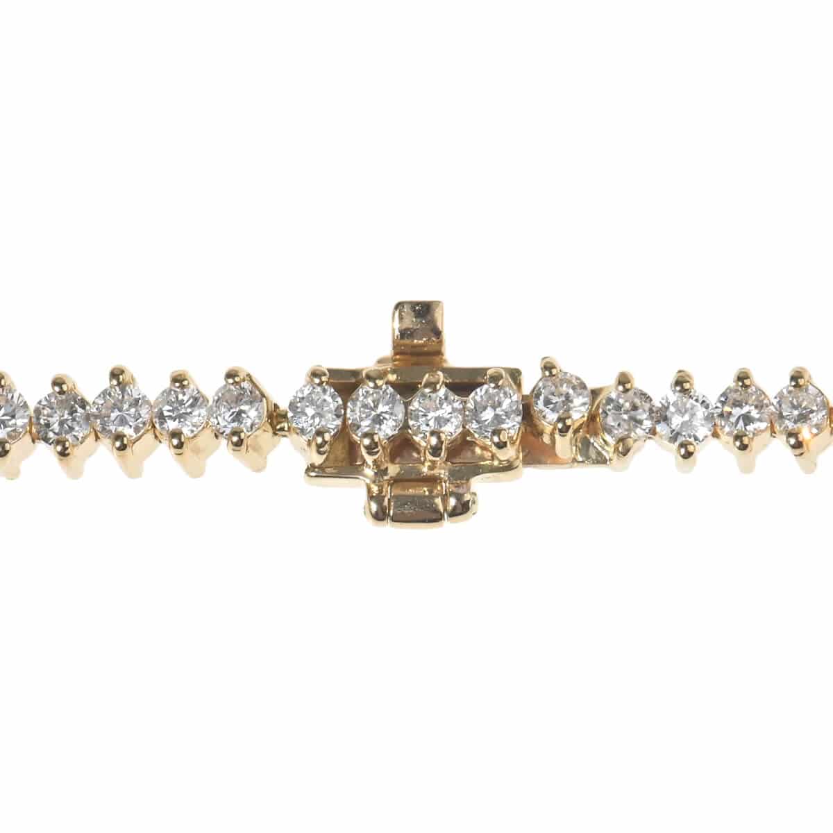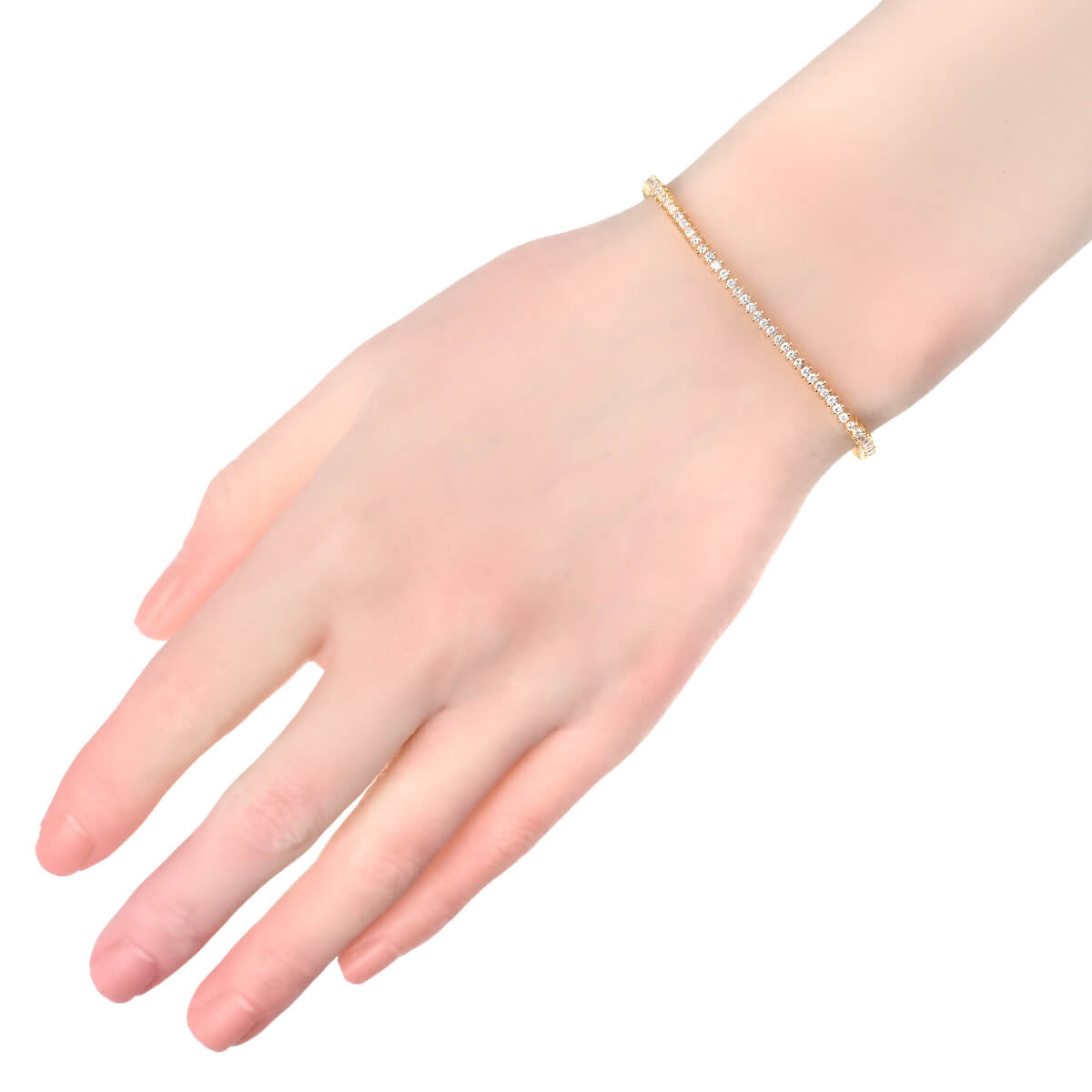 2本のプロングで留められたトータル2.00ctものダイヤモンドが連なる、イエローゴールド製テニスブレスレット。シンプルなフォルムに、流れるように連なるダイヤモンドそのものの存在感が美しく際立ち、一層輝くブレスレットです。抜群の透明感と七色の輝きが美しいダイヤモンドと、イエローゴールドの華やかな煌めきは手元をエレガントに飾ります。1本でシンプルにつけたり、お手持ちのブレスレットや時計とスタッキングしたり、自分らしいルックを楽しめるシンプルで上質なダイヤモンドジュエリーです。