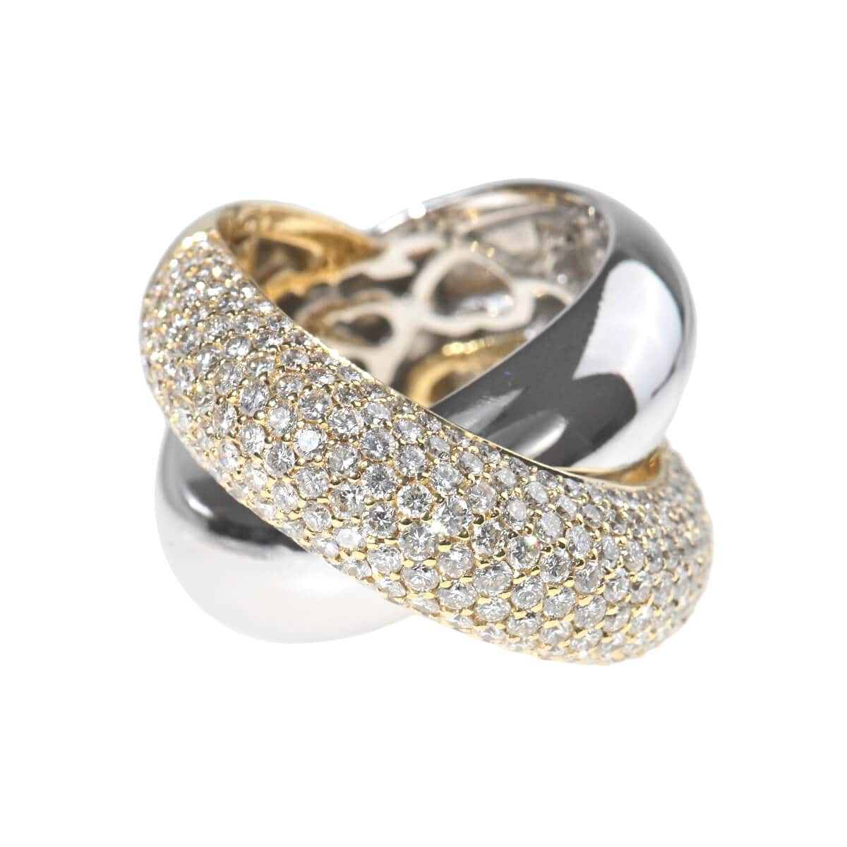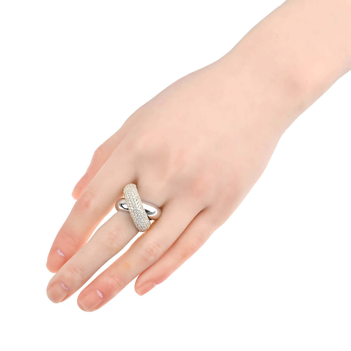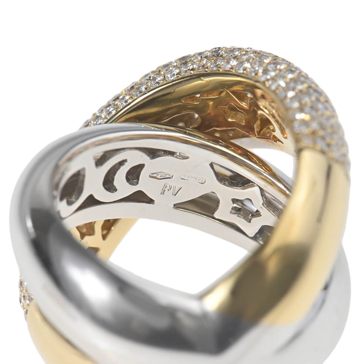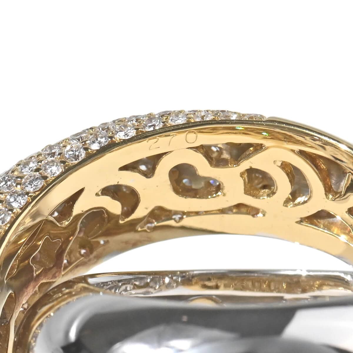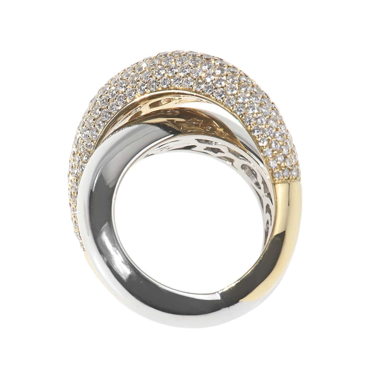 イタリア、フィレンツェ最古の橋であり、建造以来橋上に金細工師の商店が並んでいた、アルノ川にかかる石造アーチの橋“ポンテヴェキオ橋”。その名を冠したドメスティックジュエリーブランド『PonteVecchio(ポンテヴェキオ)』は、1981年の創業以来“Romantic Luxury(ロマンティック ラグジュアリー)”をキーワードに、ジュエリーが紡ぎだすロマンティックな物語、こだわりのマテリアルと熟練の職人技術によって表現されるラグジュアリーな価値を、遊び心あふれるファインジュエリーに昇華し続けています。艶やかに磨かれたホワイトゴールドのアームと、2.70ctものダイヤモンドがパヴェセッティングされたゴールドアームがクロスする、ボリュームたっぷりのコンビネーションリング。フランス語で“石畳”を意味する「パヴェ」の名の通り、立体フォルムのサイドにまでダイヤモンドが敷き詰められたリングは、さまざまな角度で光をとらえ煌めきを放ちます。目を惹く、ユニークな造形でありながらシンプルで、洗練された美しさとポンテヴェキオらしい大人の遊び心あふれるハイジュエリーです。