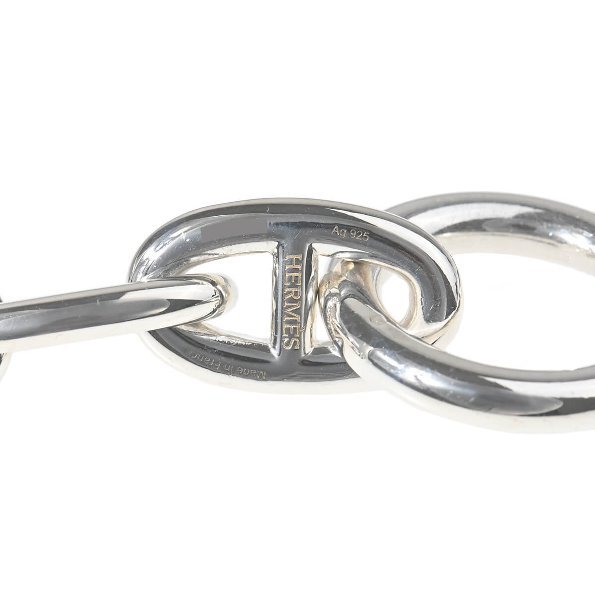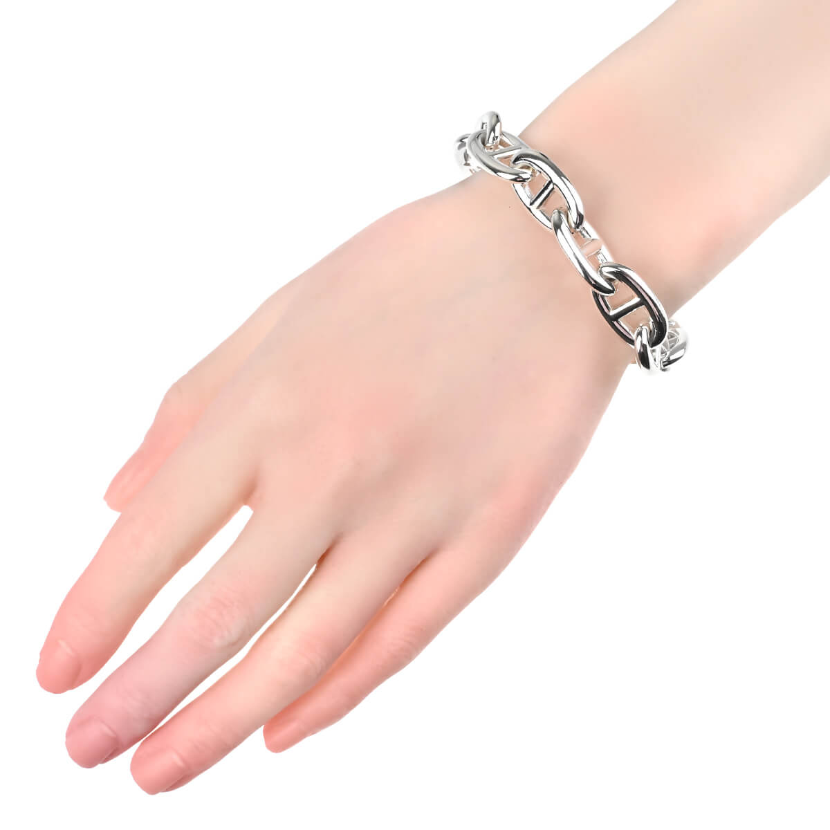 1938年にエルメス家の一員であり当時のエルメスの社長であったロベール・デュマ=エルメスが、ふと船の錨のチェーンに目を留め、そのシルエットに惹かれ、そのチェーンを元にデザインしたブレスレットを作ったことにはじまった「シェーヌ・ダンクル」コレクション。インスピレーションの源であった“錨の鎖(Chaine d’ancre)”をそのままモデル名に冠したこのコレクションは、鎖で強く結ばれた絆を象徴しているそう。最初のブレスレット誕生後も艶出しにしたり、丸い粒状にしたり、ひねったりと、コマの形や大きさを変え、ネックレスやリング、ピアス、ブレスレットとつぎつぎに新しい姿を見せ、メゾンを代表するコレクションのひとつとなった「シェーヌ・ダンクル」、TGMサイズのコマが11コマ連なるシルバー製ブレスレットです。「シェーヌ・ダンクル」といえばこれ、というほどに人気で定番でありながら飽きることなく、ジェンダーや年代を問わずに身につけるひとをお洒落に引き立てる、一流メゾンのトレンドジュエリーです。