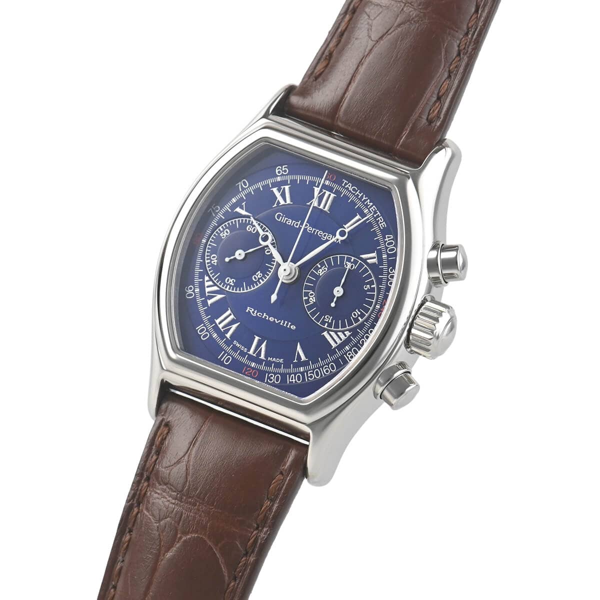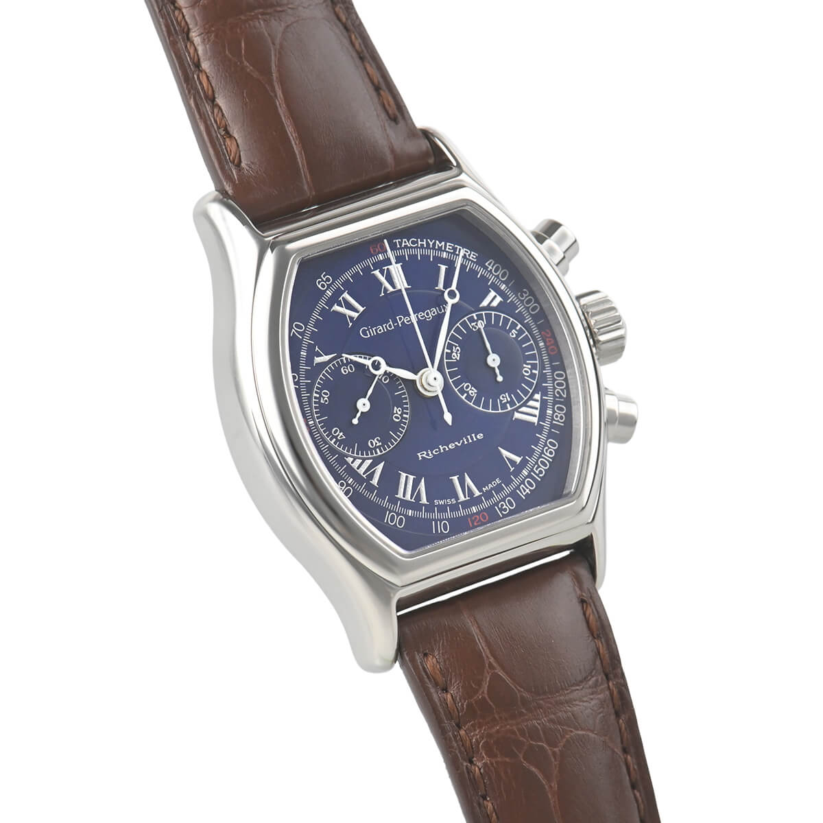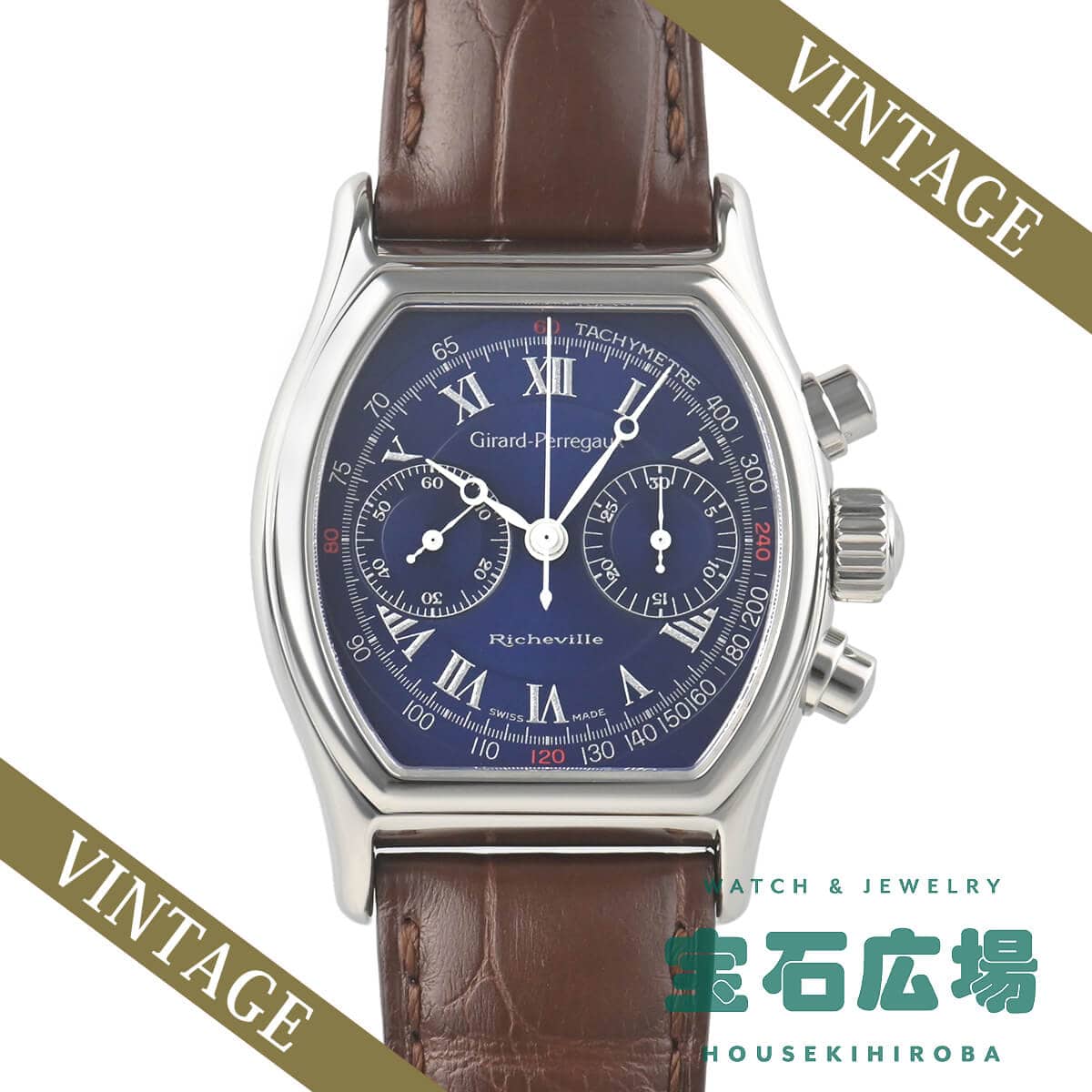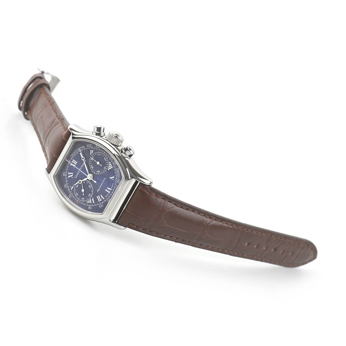 1990年代の後半に時計雑誌でよく取り上げられていた人気モデル「リシュビル トノークロノグラフ」。こちらはその初期型の手巻きモデルで、ダイヤルは人気のブルーローマンダイヤルです。