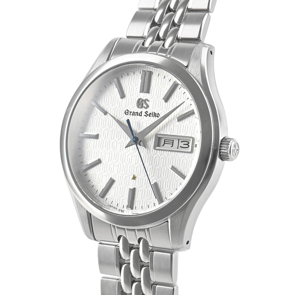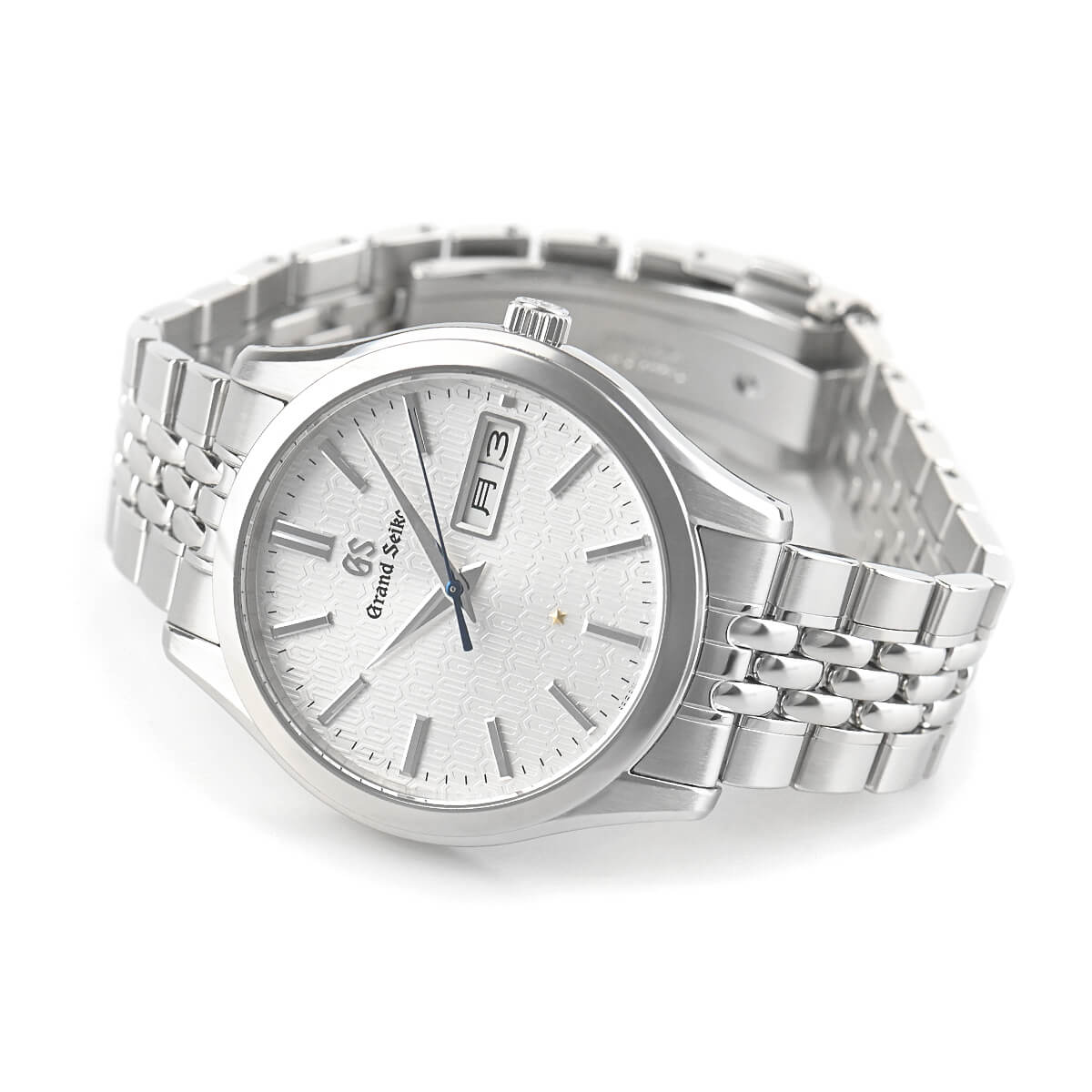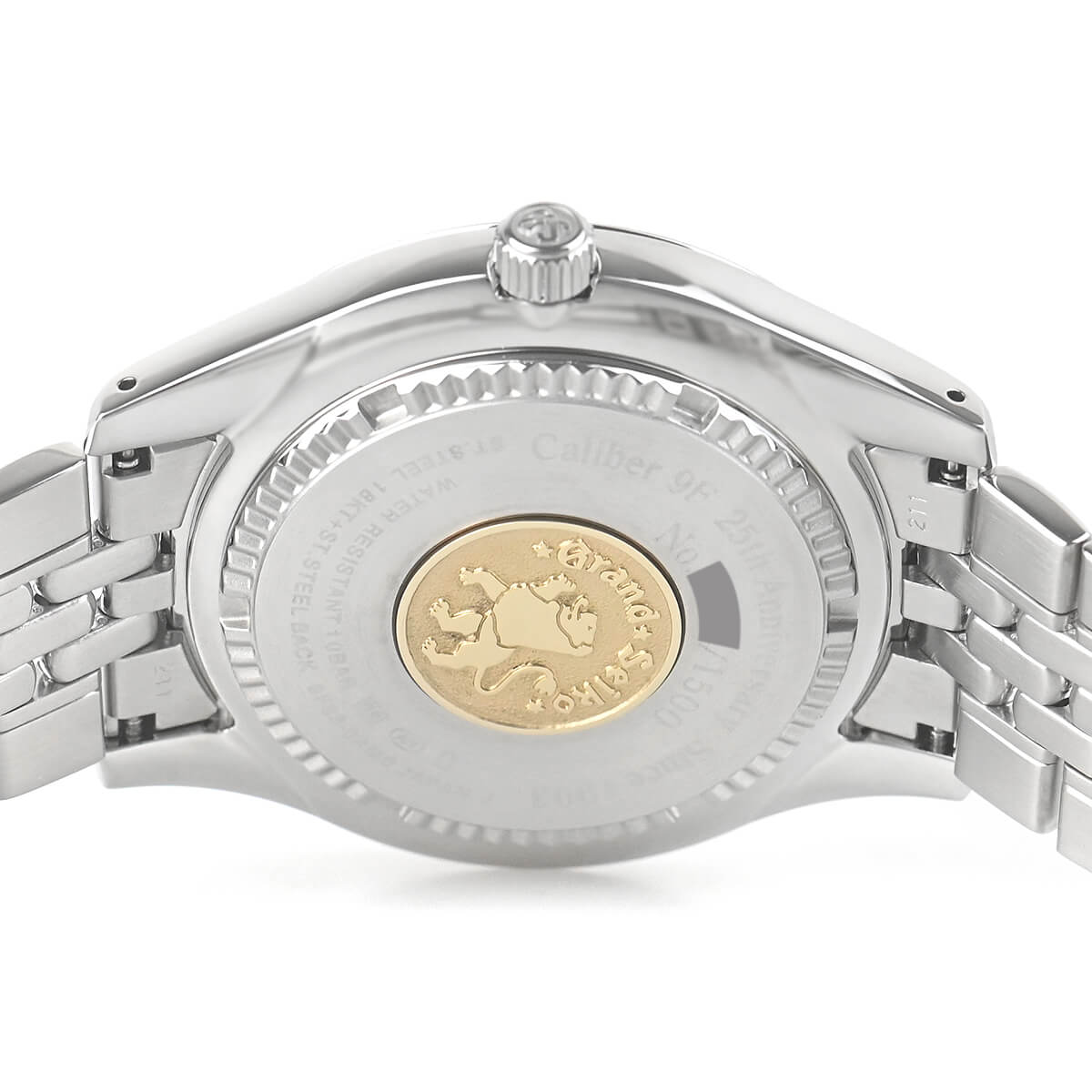 ダイヤルには水晶振動子を象ったマークで「GS」と「9F」の文字を配列したパターンが施され、年差±5秒の高精度の証としてファイブ・ポインテッド・スターがあしらわれています。