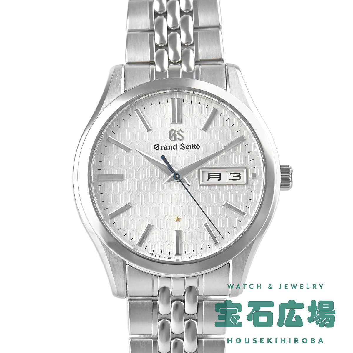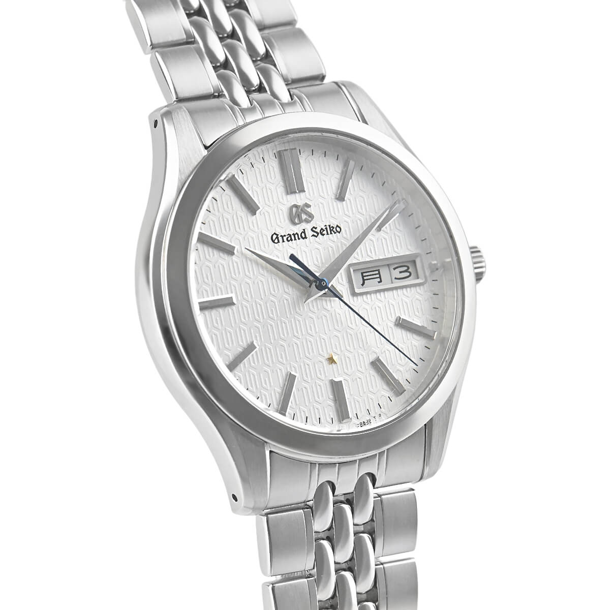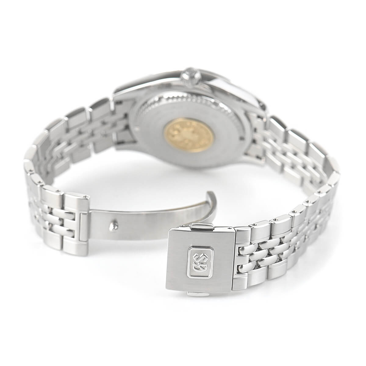 ダイヤルには水晶振動子を象ったマークで「GS」と「9F」の文字を配列したパターンが施され、年差±5秒の高精度の証としてファイブ・ポインテッド・スターがあしらわれています。