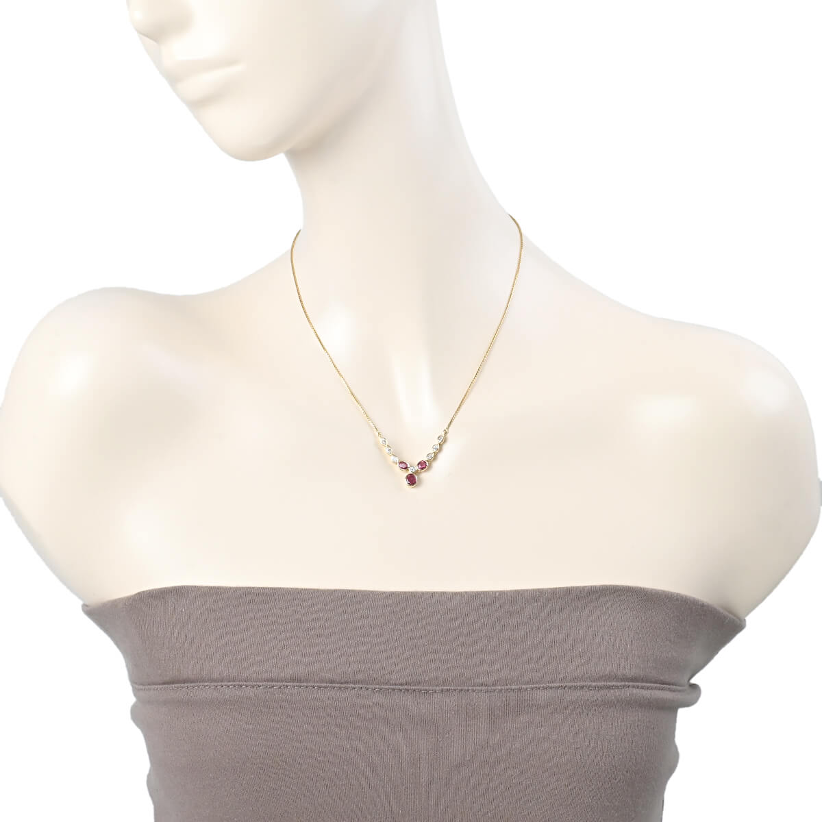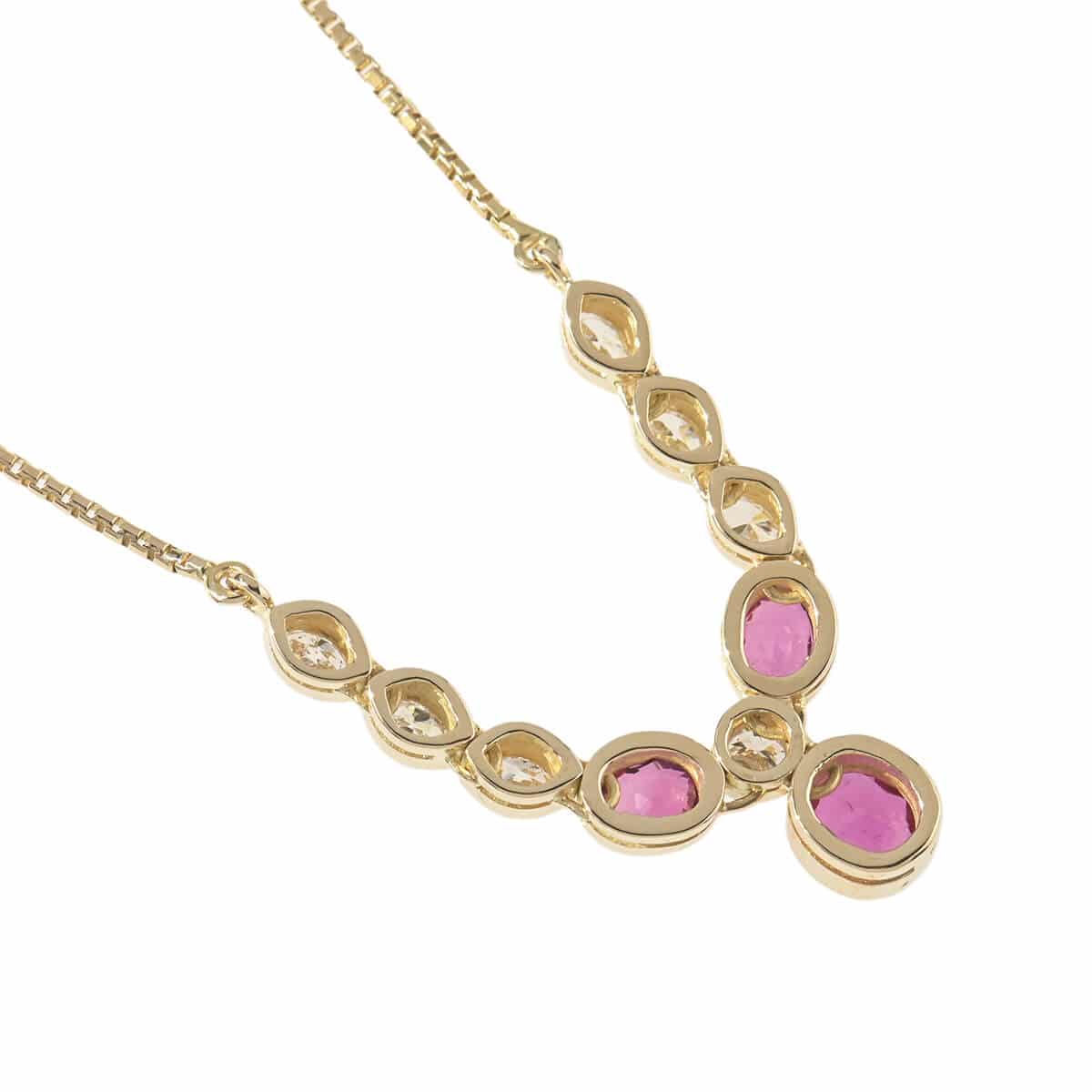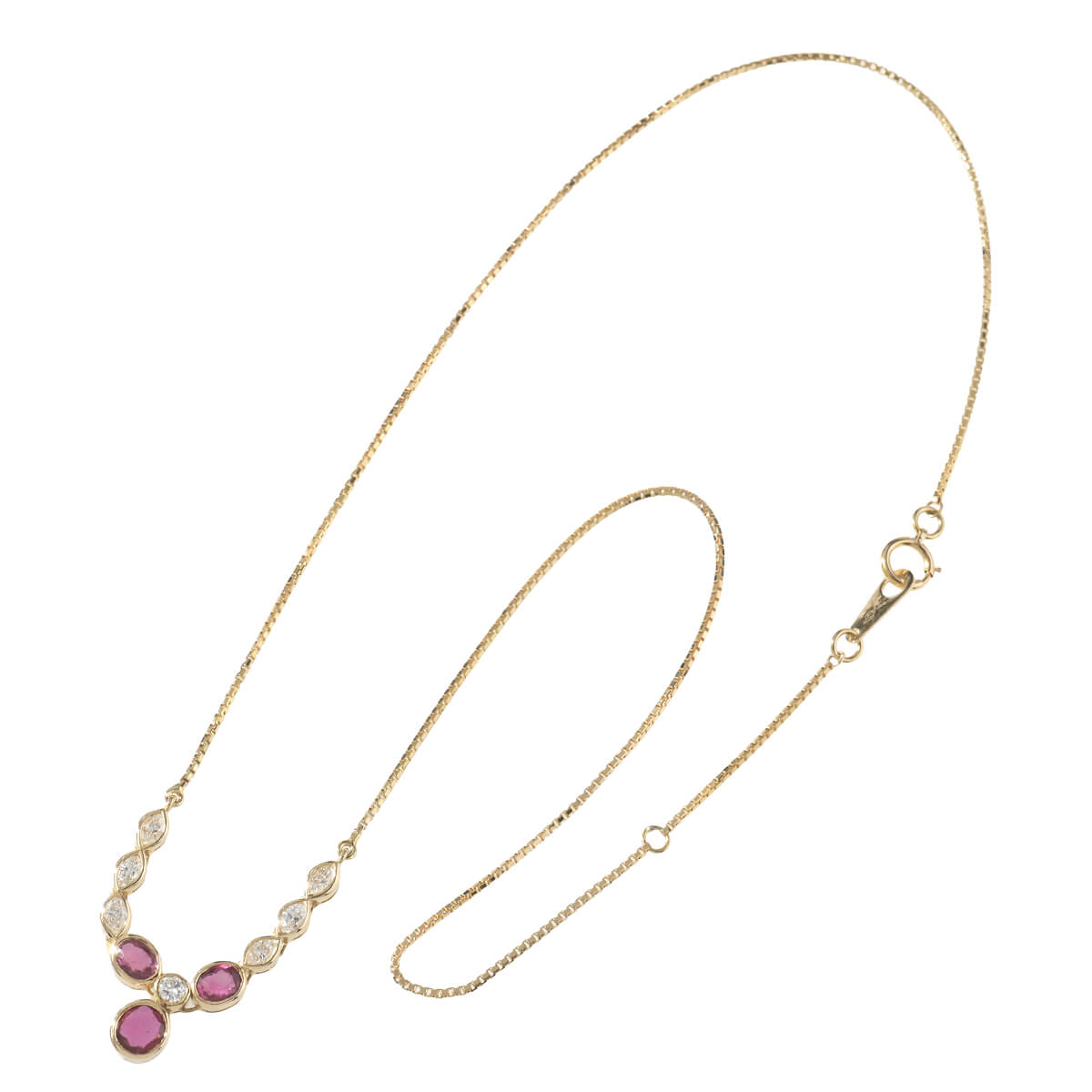 3石のルビーとマーキスダイヤモンドがベゼルセッティングされた、イエローゴールド製ペンダント。魅惑的にきらめくルビーと繊細に輝くダイヤモンドの華やかなコントラストが、デコルテを印象的に飾ります。光を浴びるたびキラキラと滑らかに輝き、モチーフとともにスタイリングを美しく華やかに飾るベネチアンチェーンも魅力のひとつ。どんなスタイリングも軽やかに優美に彩り、デイリーに色石を楽しめる本格カラーストーンジュエリーです。