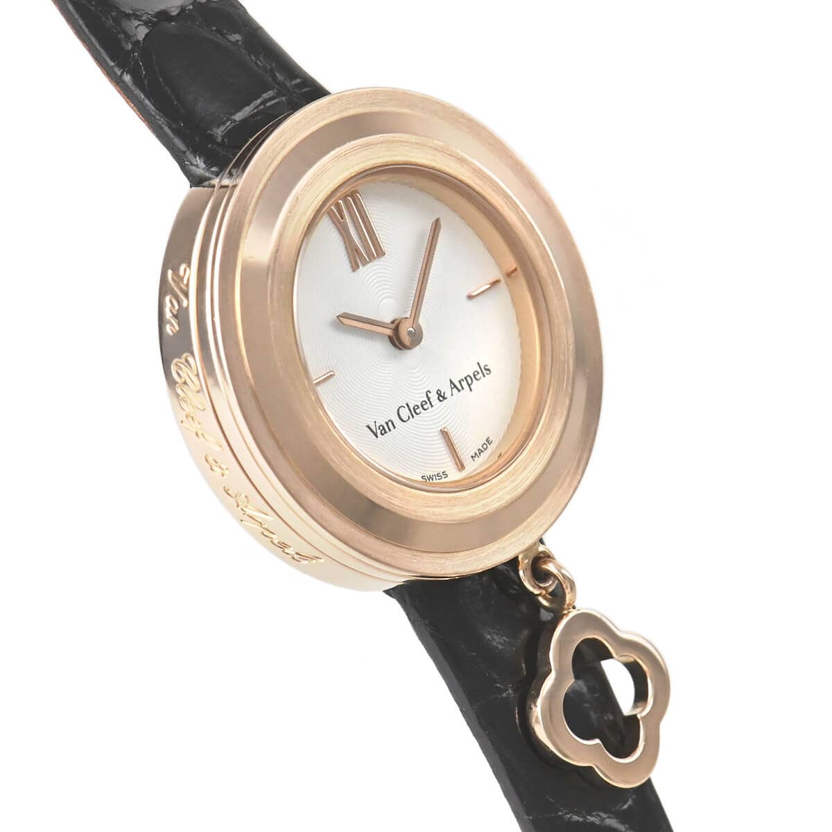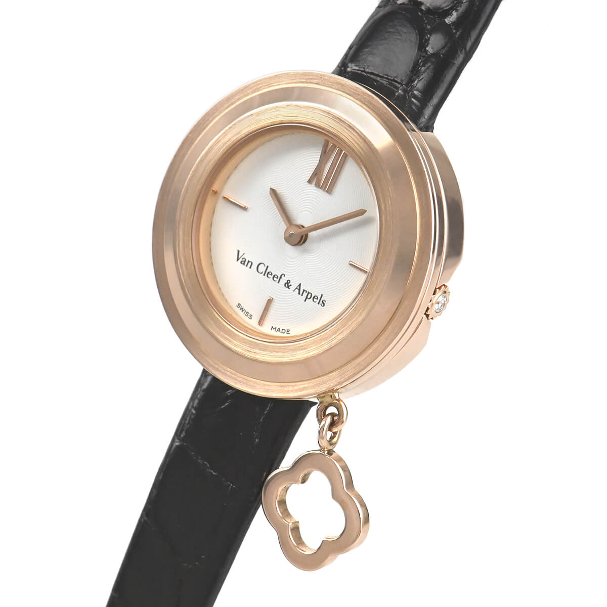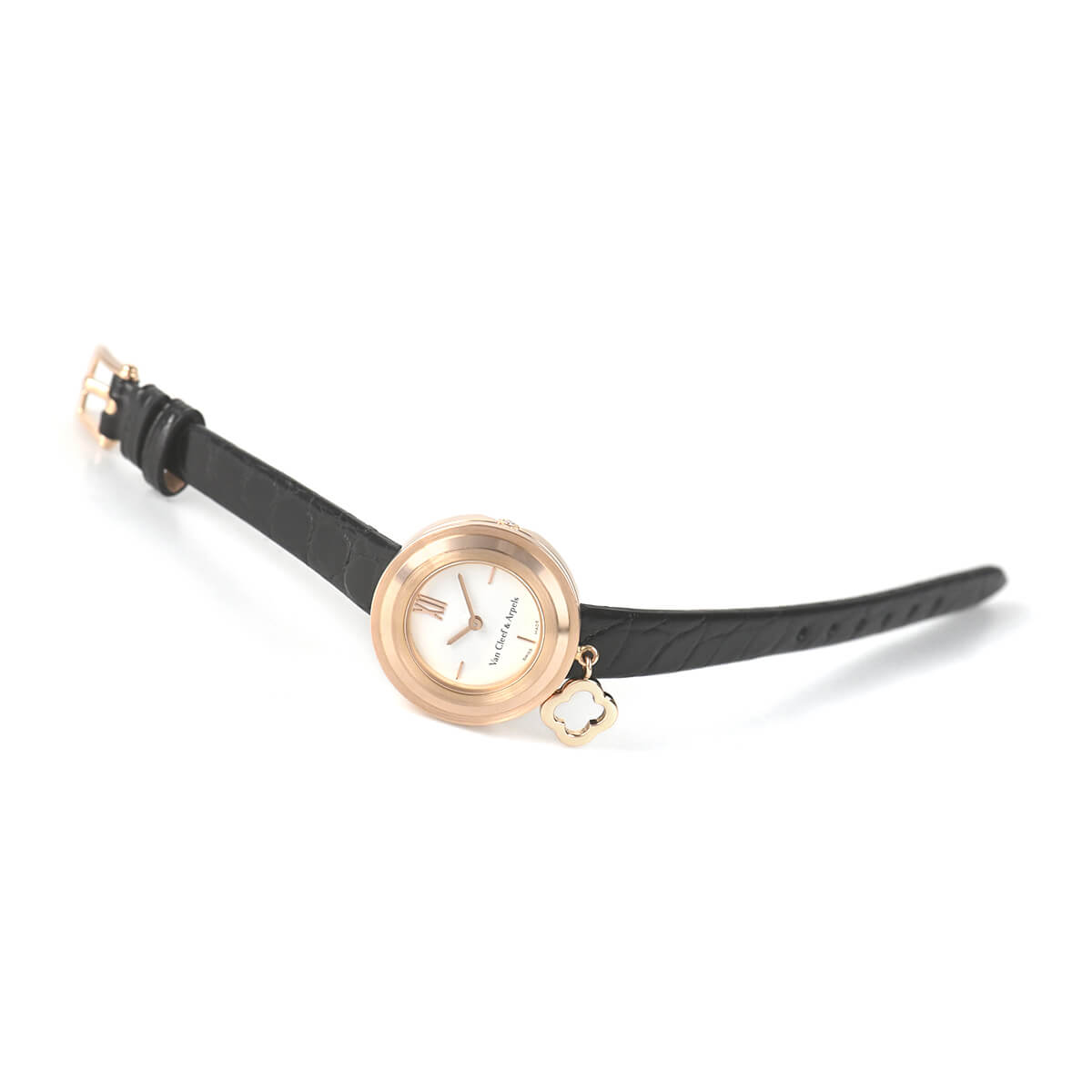可愛らしい円形のケースサイドには「Van Cleef & Arpels」の名が刻まれます。