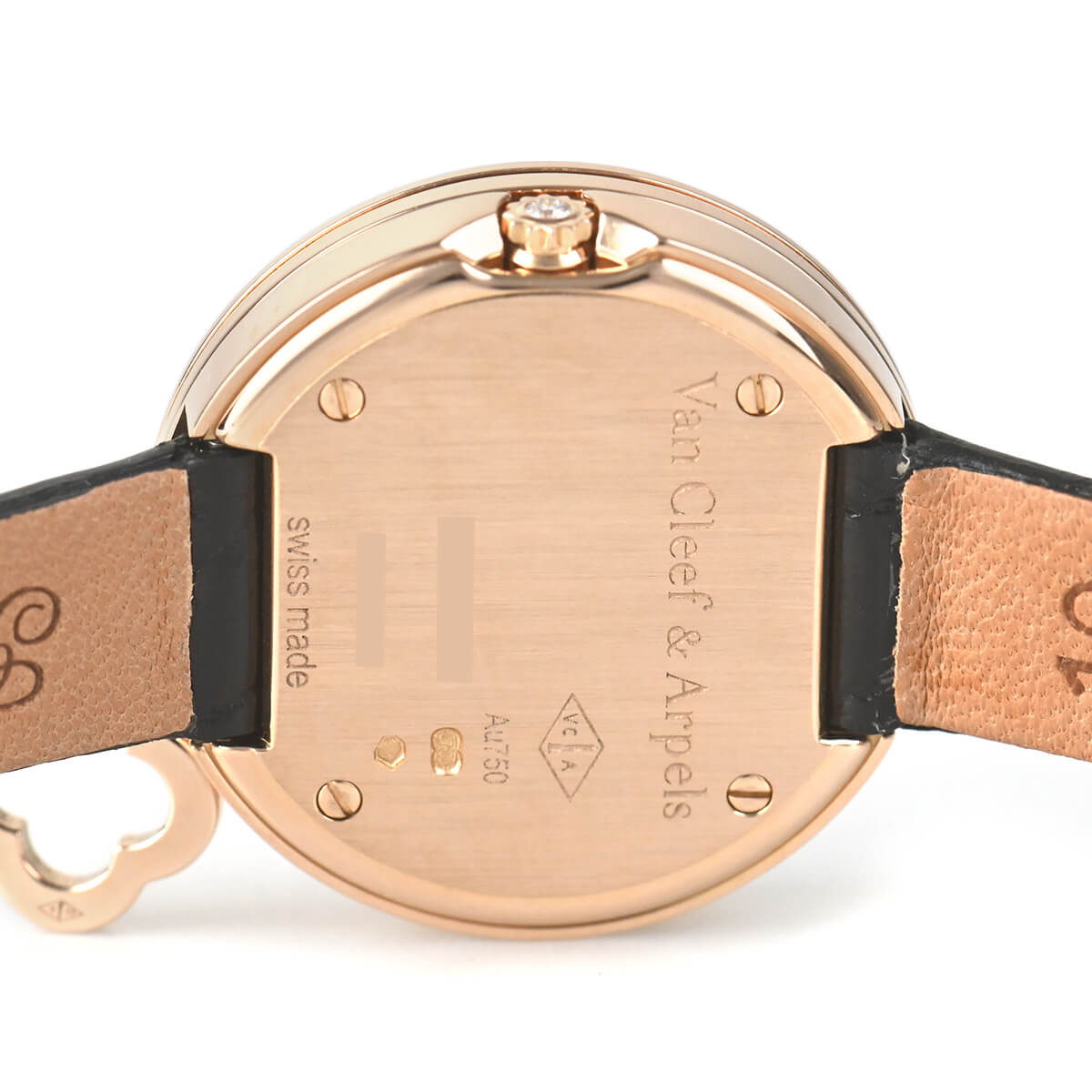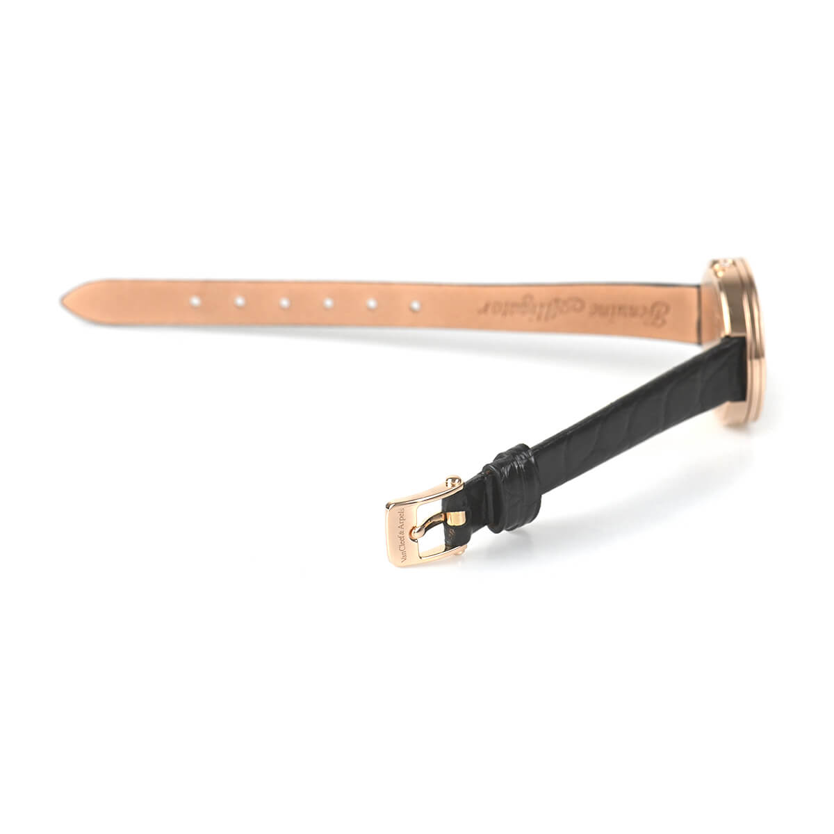 ヴァンクリーフ&アーペルの象徴とも言える「アルハンブラ」をチャームにしており、手首の動きに合わせてケース外周を動く「チャーム ウォッチ」。こちらは25mmのミニサイズで、ケース素材にはピンクゴールドを採用。