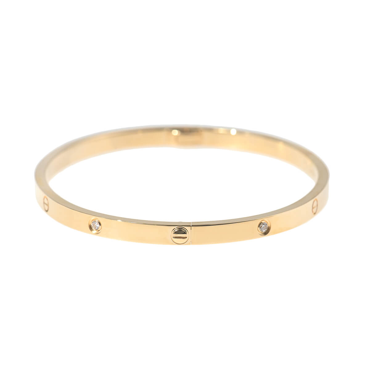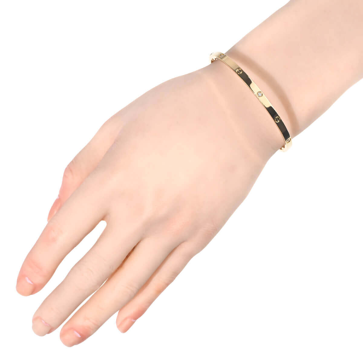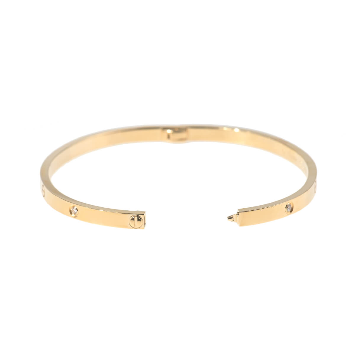 1970年代、『Cartier(カルティエ)』ニューヨークのアトリエで、イタリア出身のジュエリーデザイナー、アルド・チプロによってデザインされた「LOVE」ブレスレット。永遠に結ばれる“絆”のコレクションは、無駄のない端正なビス、完成されたシェイプ、その確固たるエレガンスがタイムレスな魅力を放ちます。端正なビスがデザインのアクセントになった洗練された美しいフォルムのブレスレットに、6粒のきらめくダイヤモンドがあしらわれたスモールサイズのイエローゴールド製オーバルシェイプブレスレット。艶やかに磨かれたマテリアルの美しさが際立つブレスレットは、1本ですっきりと洗練された存在感を楽しむのはもちろん、地金をミックスしてレイヤードするのもお洒落。本体から外れないビスを1か所、専用ドライバーで90度回すとロックが外れるこのブレスは、ぐっと着脱しやすくなったのも魅力のひとつです。