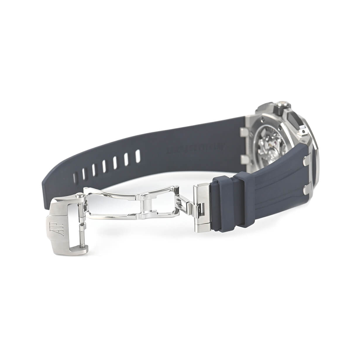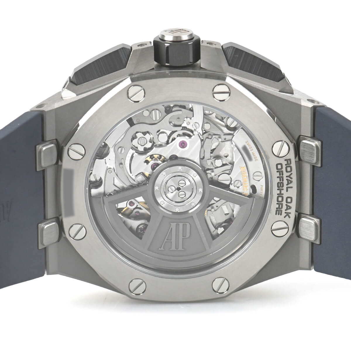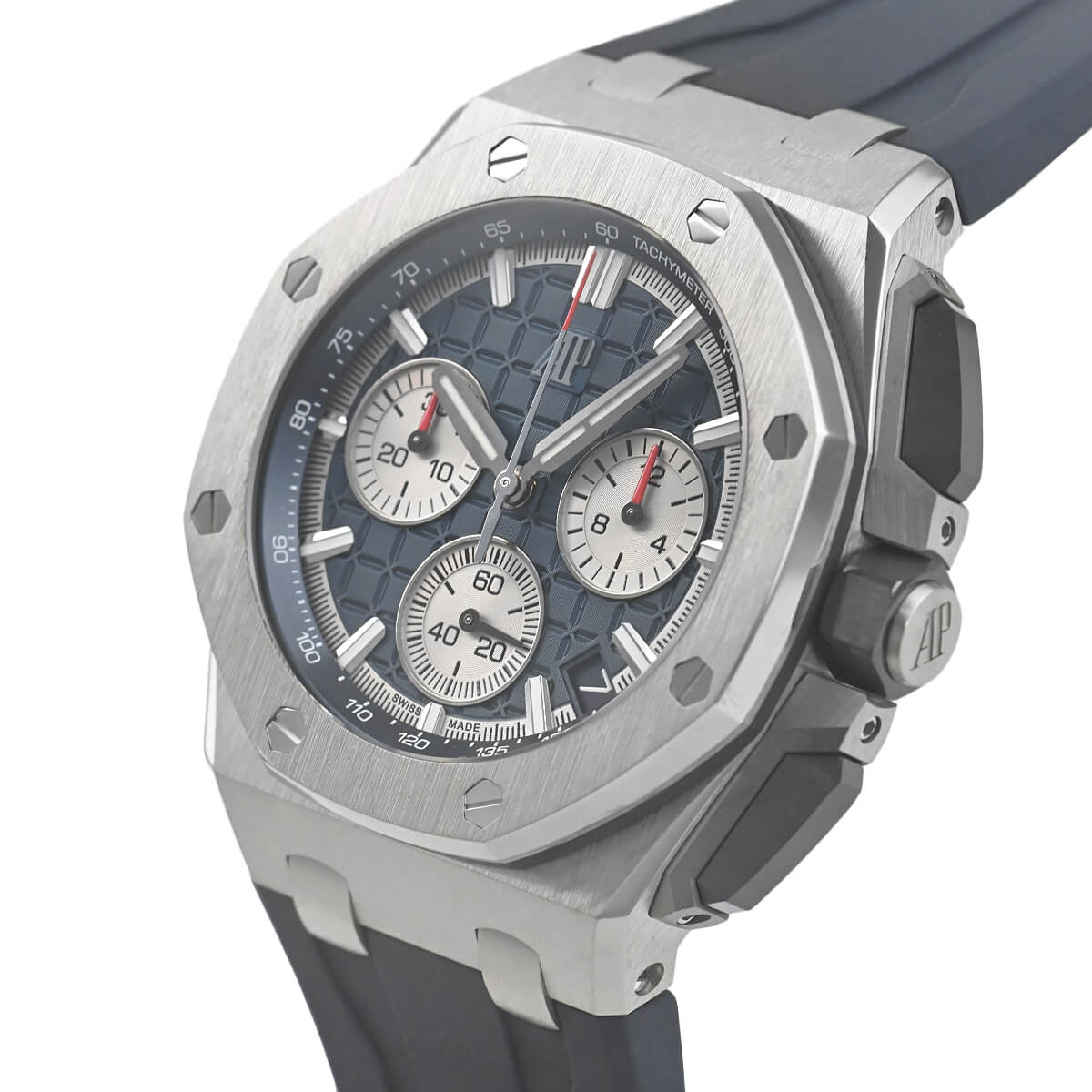 43mmのボディーで堂々と存在を主張する「ロイヤルオーク オフショアクロノグラフ」。こちらはブルーの「メガタペストリー」ダイヤルに、チタンケースを合わせたモデルです。