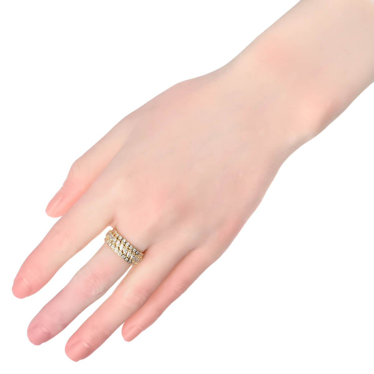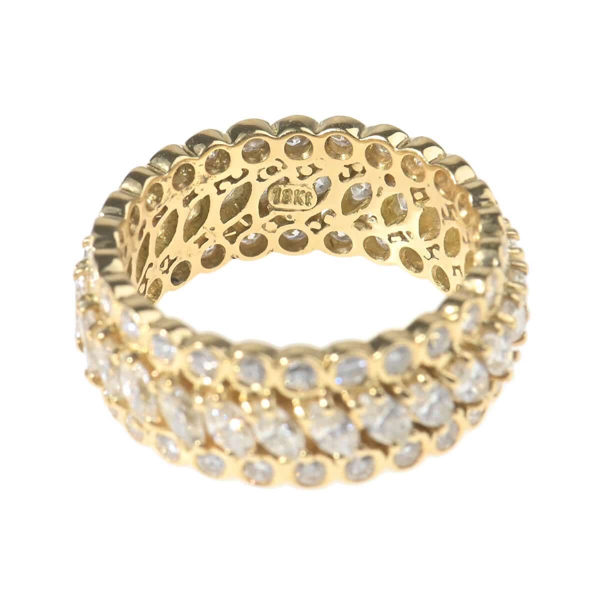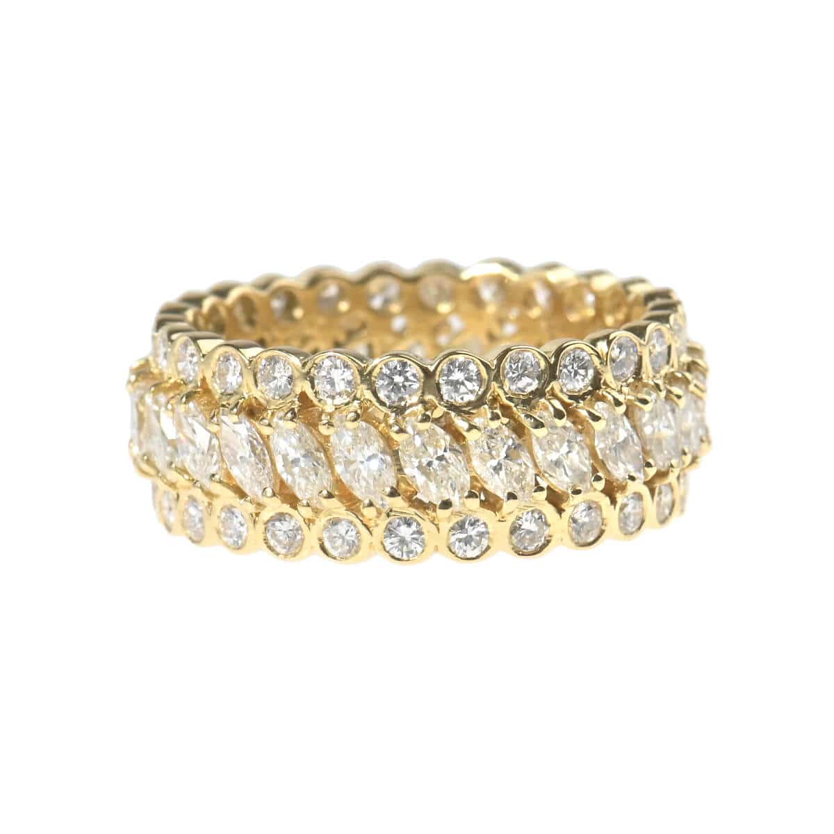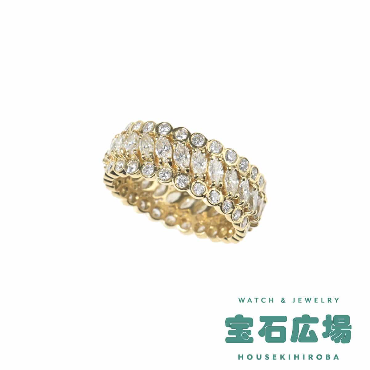 マーキスダイヤモンドをセンターラインにならべて、上下をラウンドダイヤモンドの描くラインで挟んだイエローゴールド製リング。シェイプの異なるダイヤモンドが、どのアングルからも光をとらえて指先を美しいきらめきで彩ります。大胆なボリュームをもちながら、美しく細やかにつくりこまれたリングは軽やかな印象に。大人のデイリーのスタイリングのアクセントにはもちろん、和装でも素敵な、エレガントな個性と美しさにあふれたハイジュエリーです。