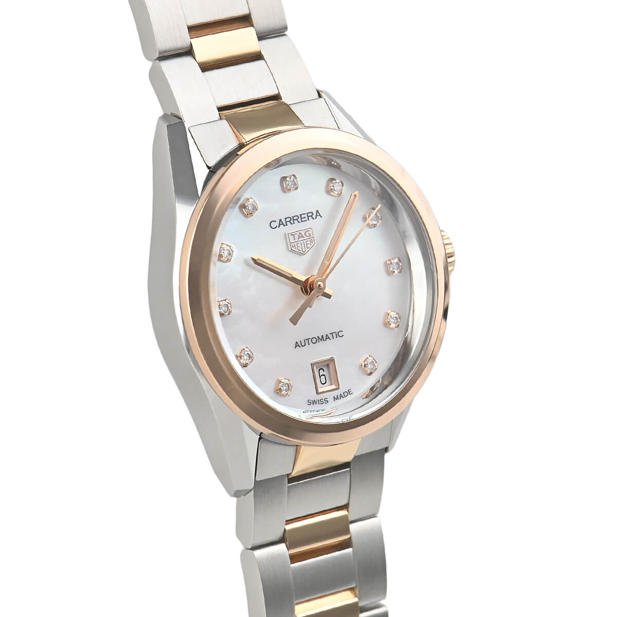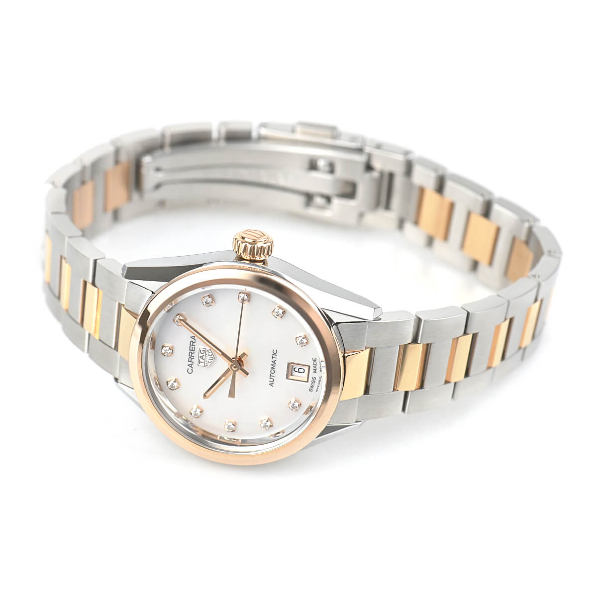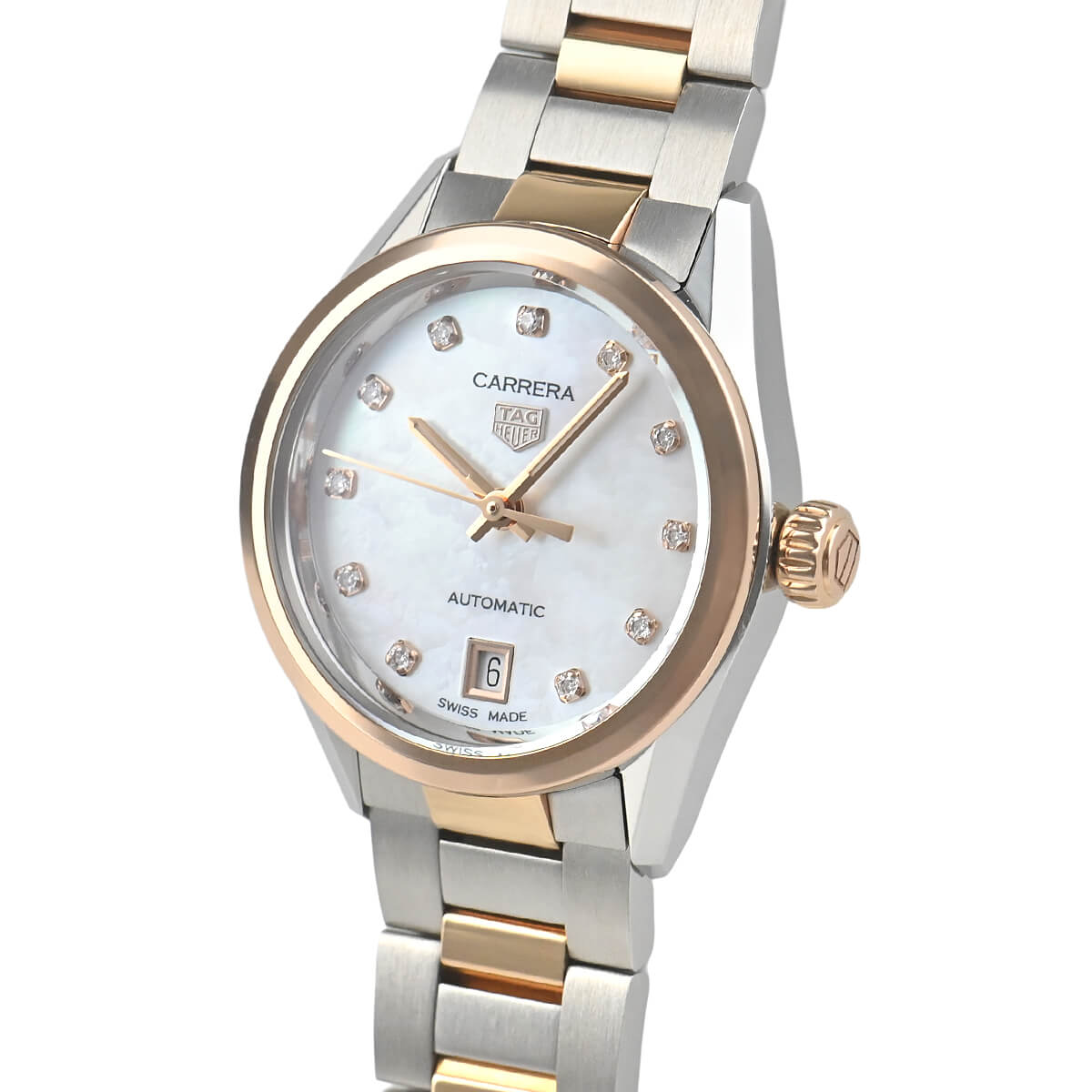 こちらはケース径29mmに自動巻きムーブメントキャリバー9を搭載したレディースモデルのカレラです。スポーティーでありながらも、ホワイトシェルダイアルには11個のダイヤモンドを配した華やかな一本です。