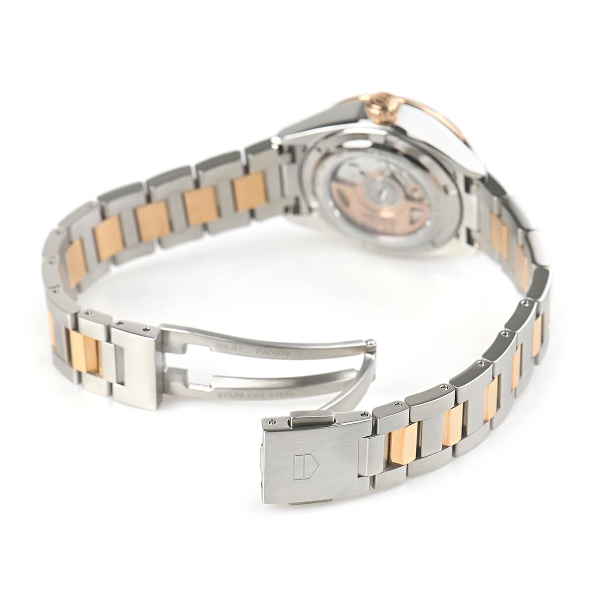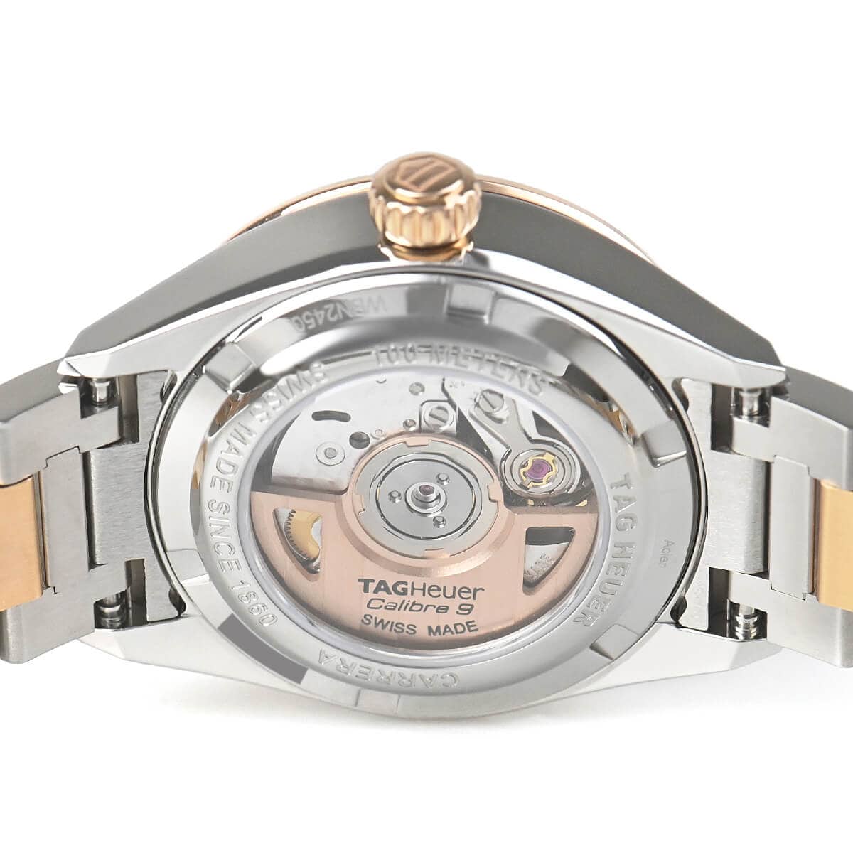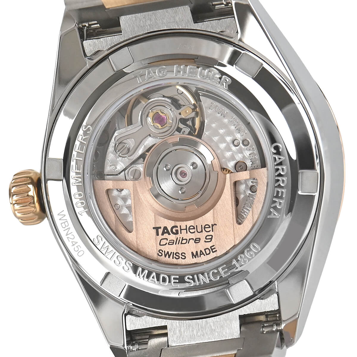 こちらはケース径29mmに自動巻きムーブメントキャリバー9を搭載したレディースモデルのカレラです。スポーティーでありながらも、ホワイトシェルダイアルには11個のダイヤモンドを配した華やかな一本です。