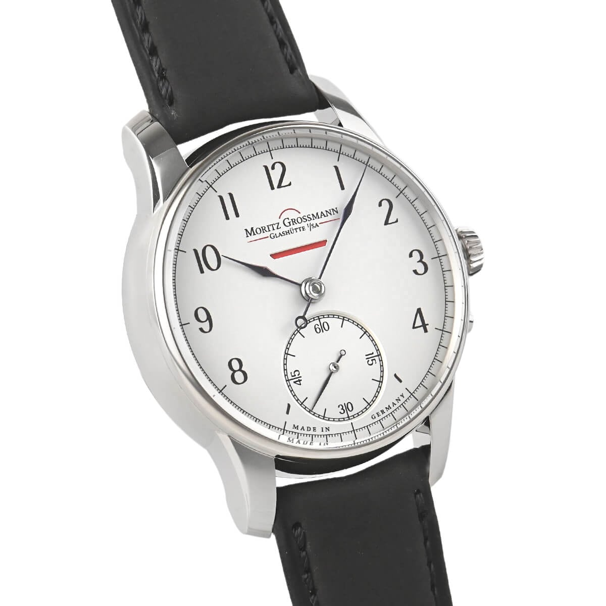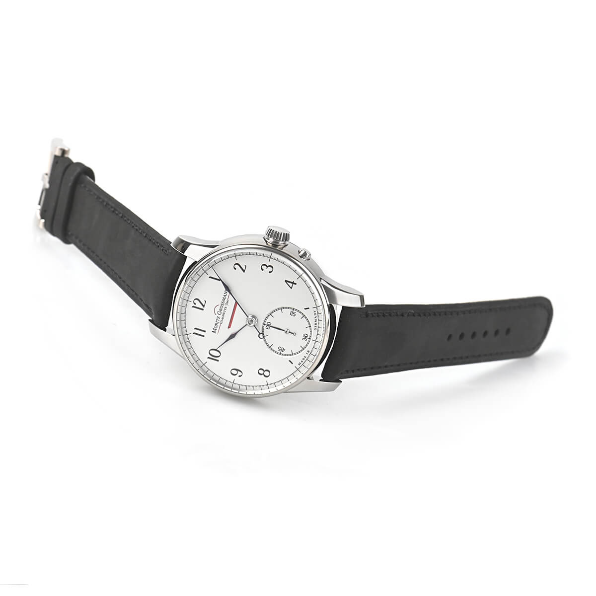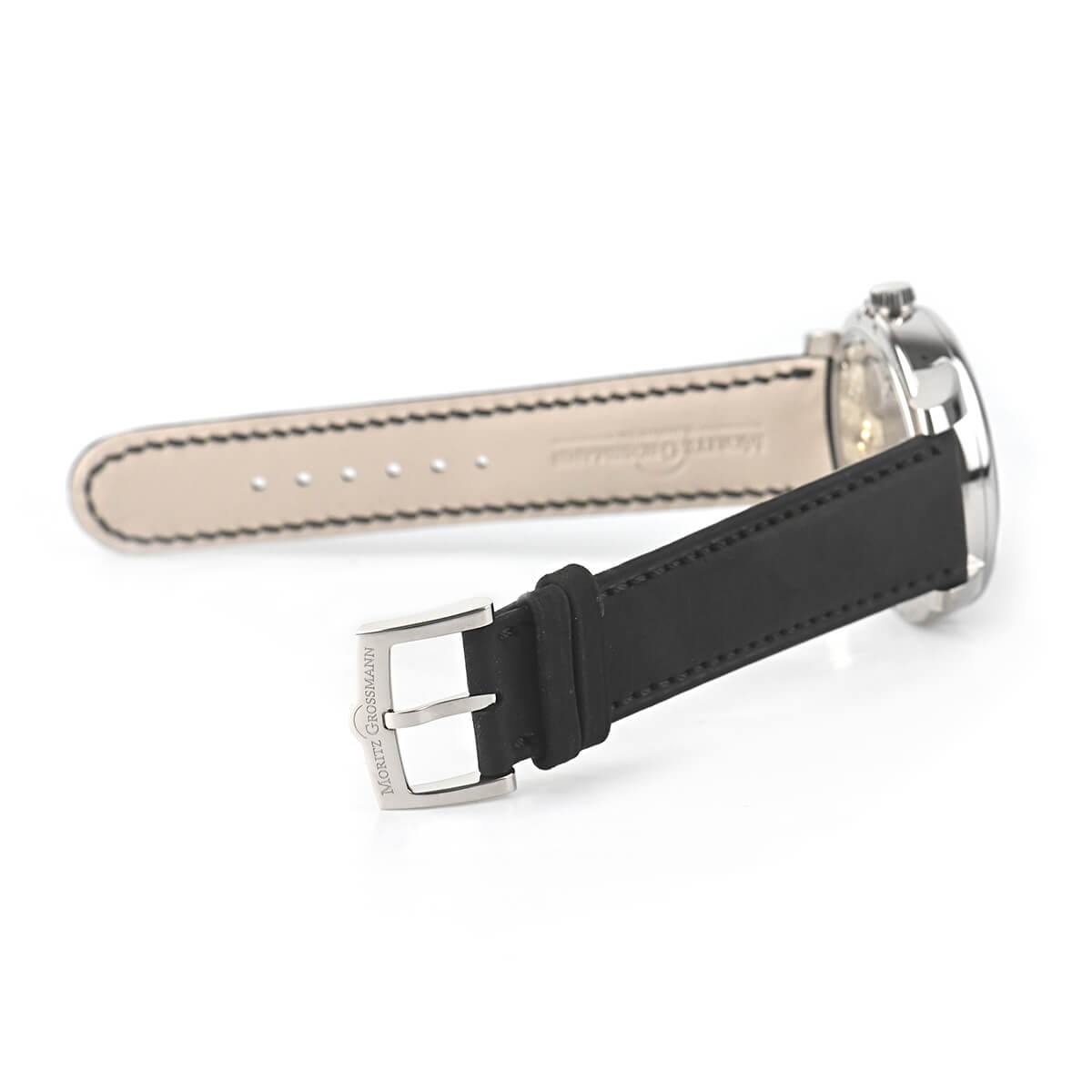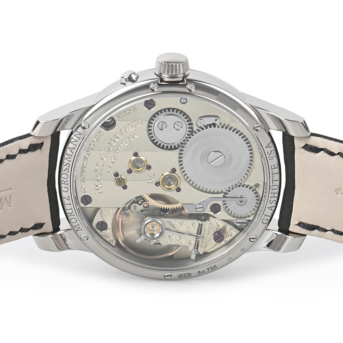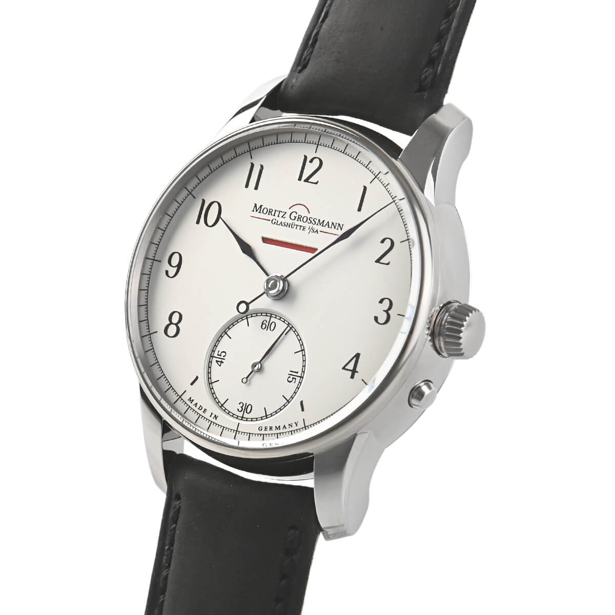 プッシャー付きの時刻調整機構が特徴で、リーズを引き出すと同時に時刻調整モードに切り替わり、手で押し込まなくてもリューズが通常に戻ります。