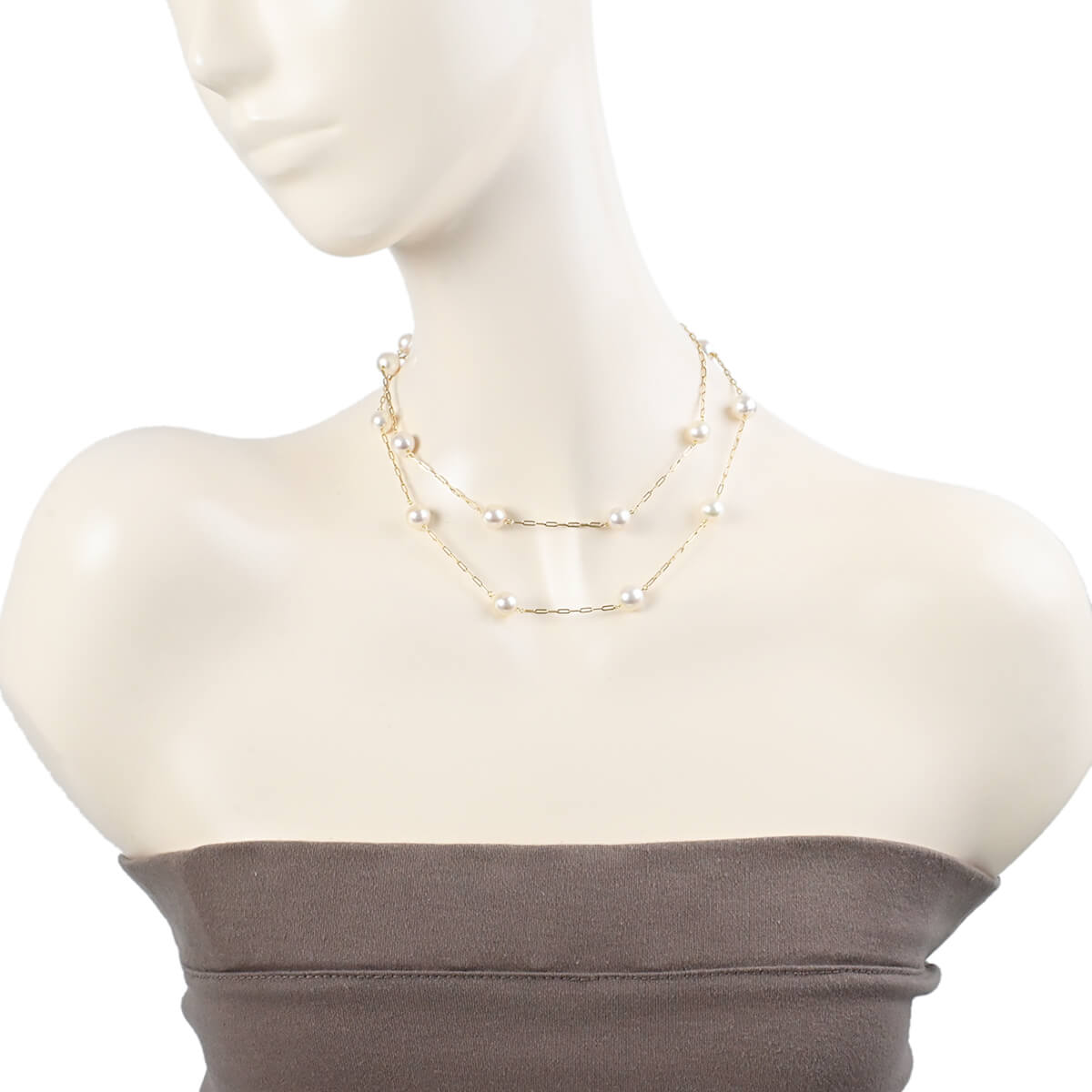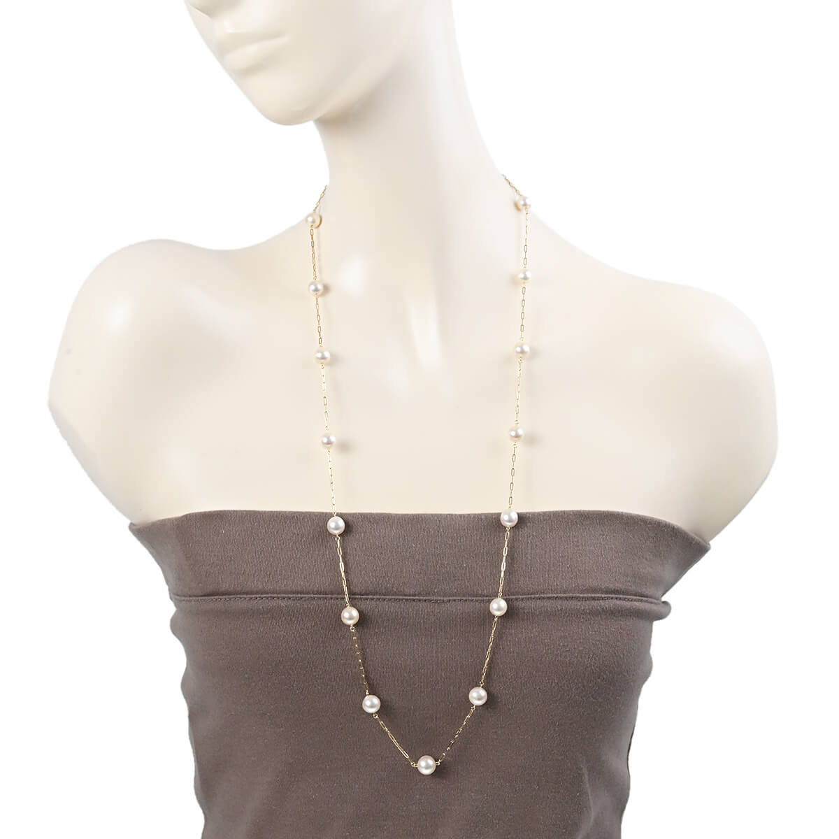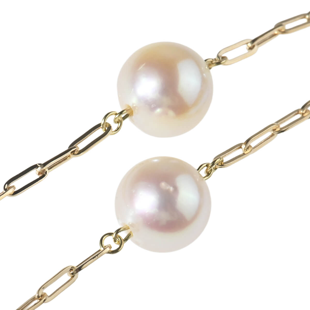 優しく柔らかな光を放つ15粒の愛らしいパールを、スクエアリンクが連なるロングチェーンにステーションセッティングしたイエローゴールド製ネックレスです。ちょっとしたお出かけスタイルにはもちろん、Tシャツやデニムでカジュアルにコーディネートして、パールジュエリーならではの品と余裕を楽しむのも。まろやかな印象のパールと華やかでつややかなゴールドのコントラストが、スタイリングを可憐に、品よく印象づけます。