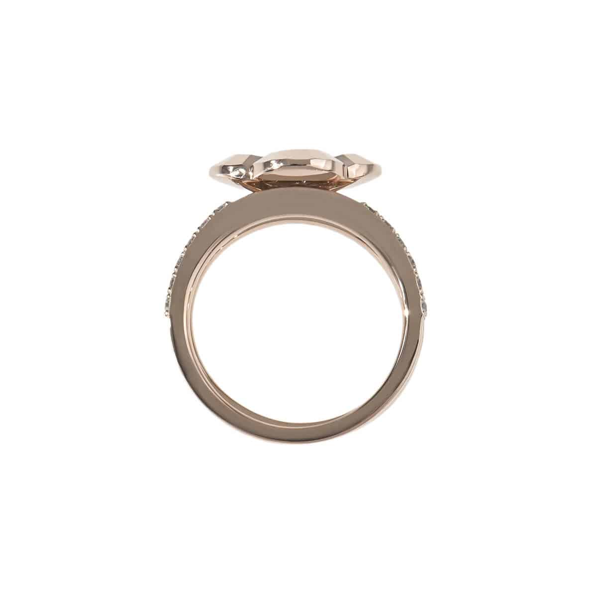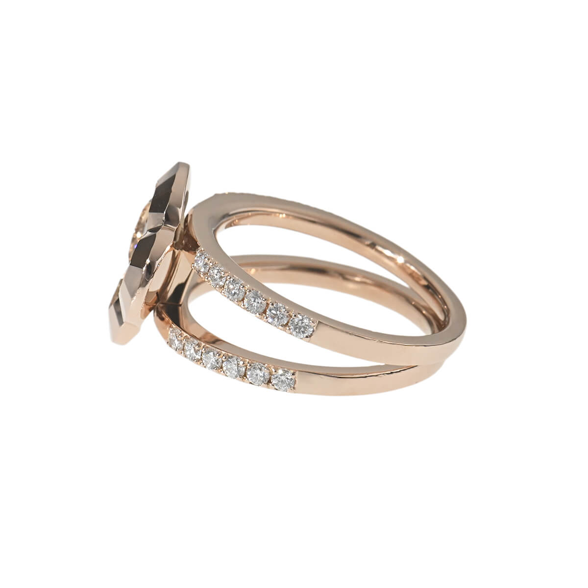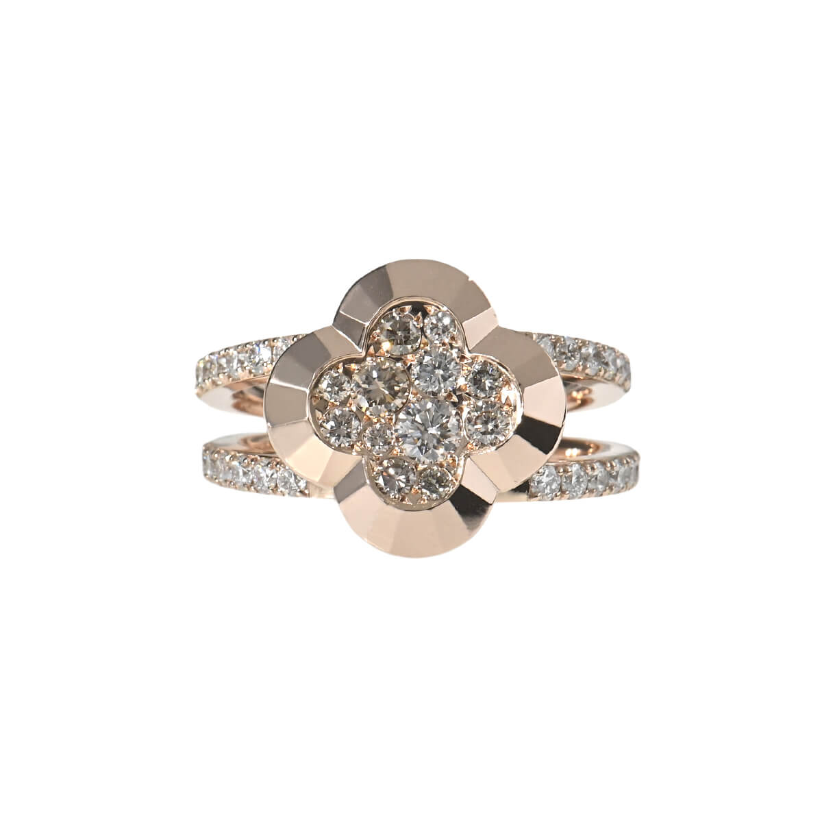 創業90年の歴史を持ち、“ダイヤモンドのカシケイ”とまで呼ばれるほどのダイヤモンドのトータルカンパニーである「株式会社 柏圭」のオリジナルブランド『KASHIKEY(カシケイ)』は、2003年に世界初、天然ブラウンダイヤモンドのみを使用するジュエリーブランドとしてスタートしました。ブラウンダイヤモンドならではの深みのある輝き、天然ダイヤモンドならではのキラキラと透明感のある煌めきに、個性を引き立てるデザインと丁寧なつくりにこだわり、無色透明のダイヤモンドにはない魅力を追求し、ナチュラルカラーダイヤモンドの可能性を広く提案し続けています。光を纏ったブラウンダイヤモンドが煌めいて鮮やかな印象を残す、アンフォゲタブルな「モティーフ」コレクションのピンクゴールド製リング。モチーフを支える2重のダイヤモンドラインが、リングの繊細でエレガントな美しさをより引き立てています。洗練された個性と大人の可愛らしさを放つ、まざまなブラウンダイヤモンドを抱くクローバーのモチーフが、指先を華やかに、シックに彩るリングです。