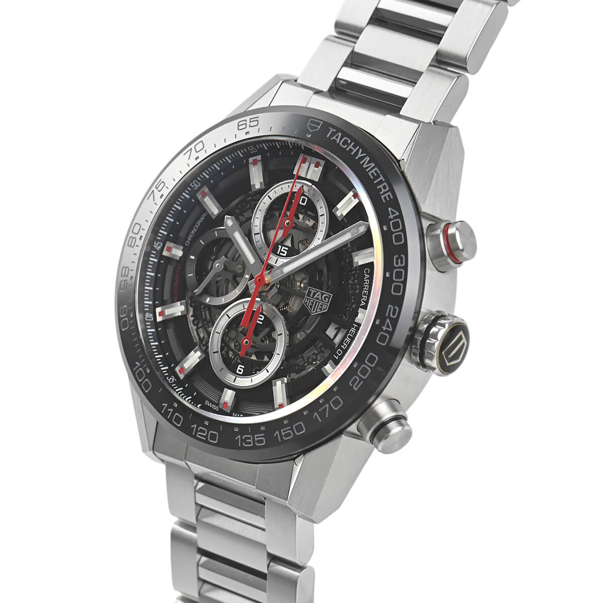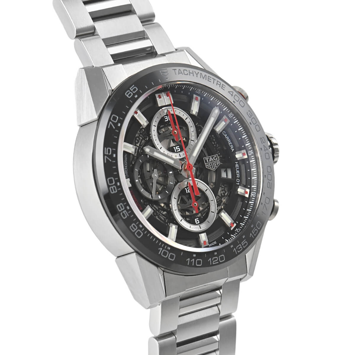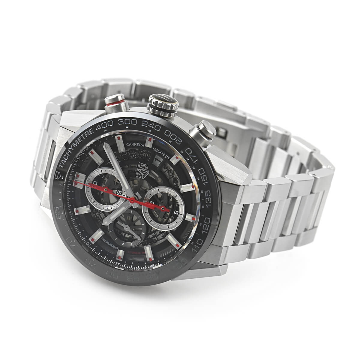 タキメーターベゼルには耐傷性に優れたブラックセラミックを採用し、また文字盤をスケルトン仕様にすることでスポーティーでメカニックな印象の「キャリバーホイヤー01クロノグラフ」。ムーブメントにはブラックコーティングが施されたローターと赤色のコラムホイールが特徴のキャリバー「ホイヤー01」を搭載します。