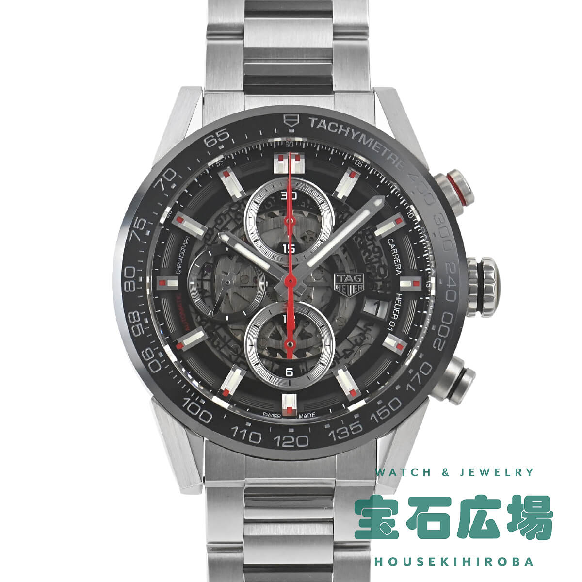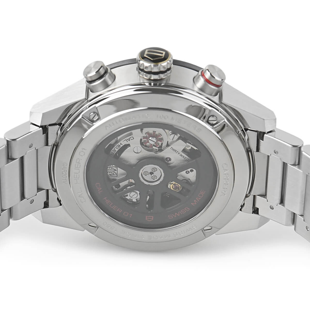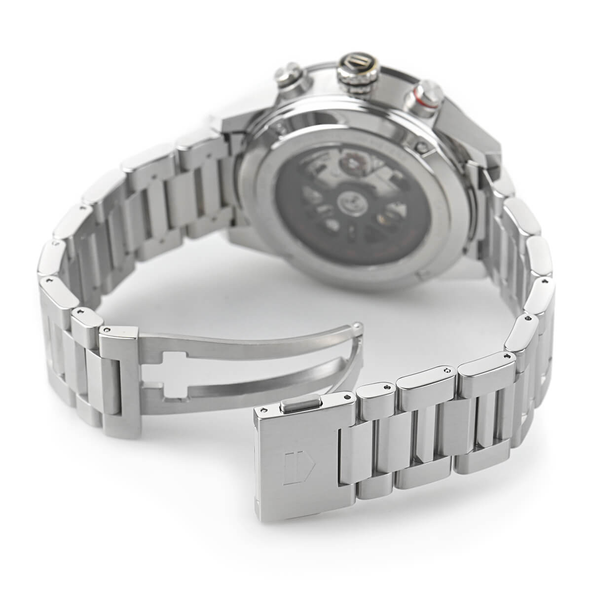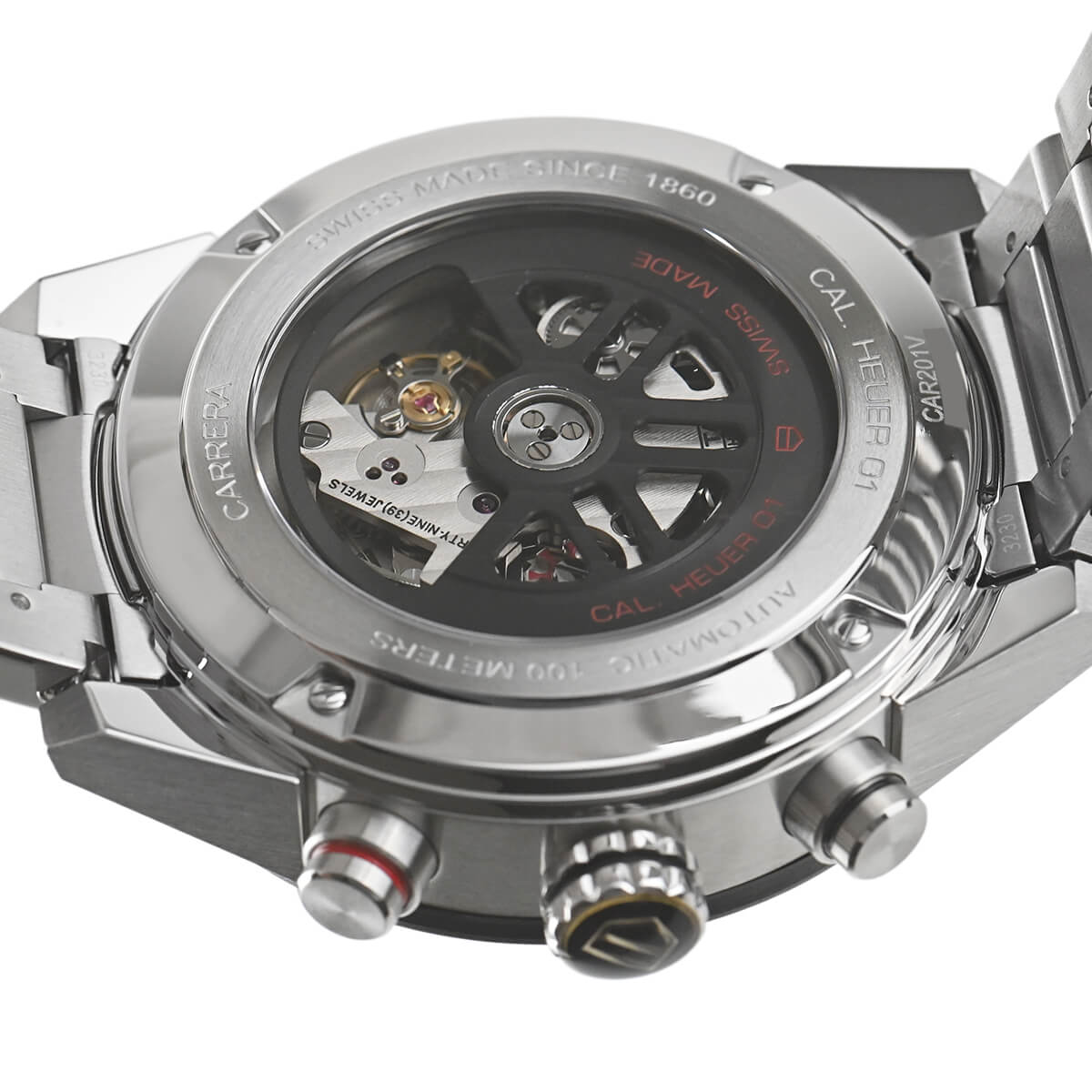 タキメーターベゼルには耐傷性に優れたブラックセラミックを採用し、また文字盤をスケルトン仕様にすることでスポーティーでメカニックな印象の「キャリバーホイヤー01クロノグラフ」。ムーブメントにはブラックコーティングが施されたローターと赤色のコラムホイールが特徴のキャリバー「ホイヤー01」を搭載します。