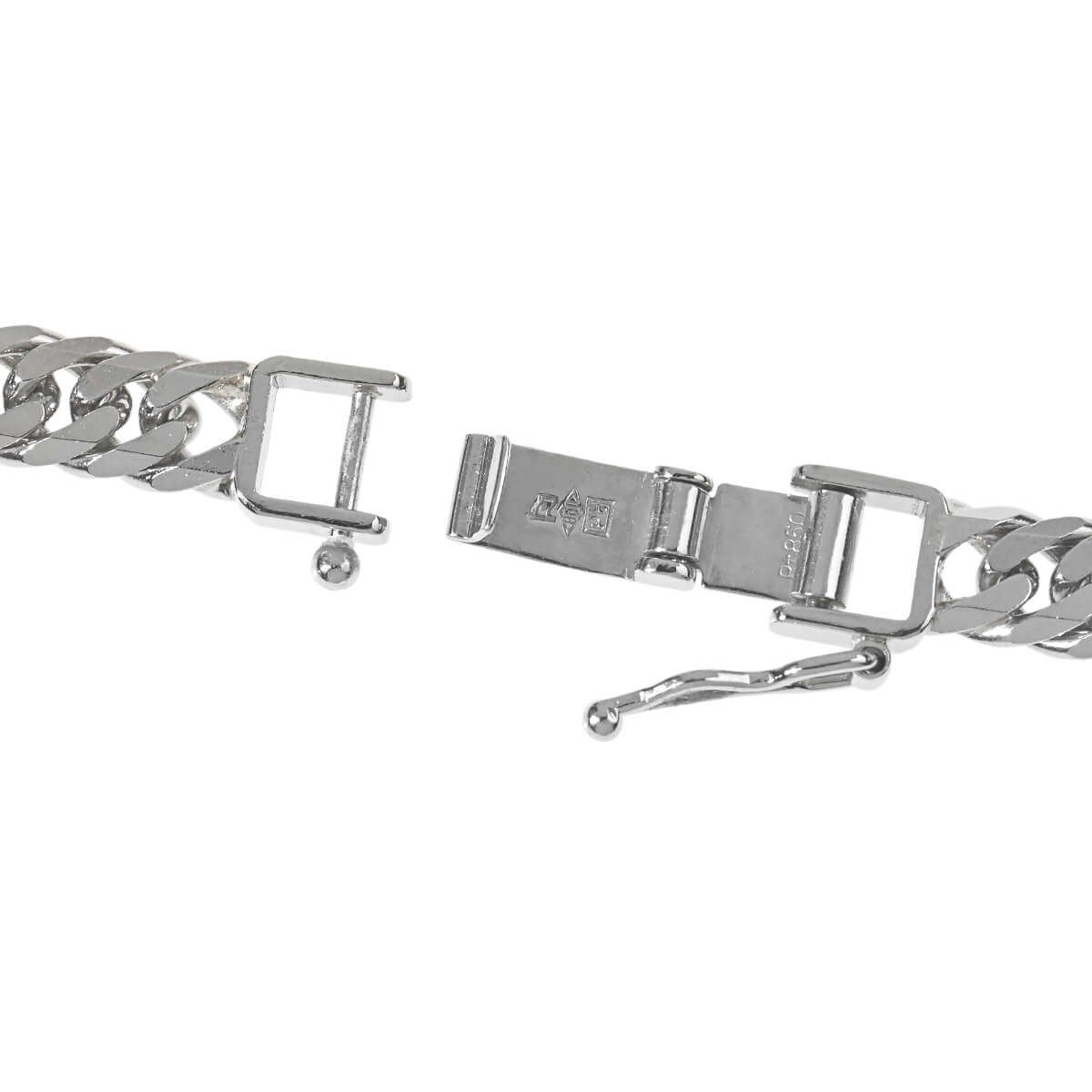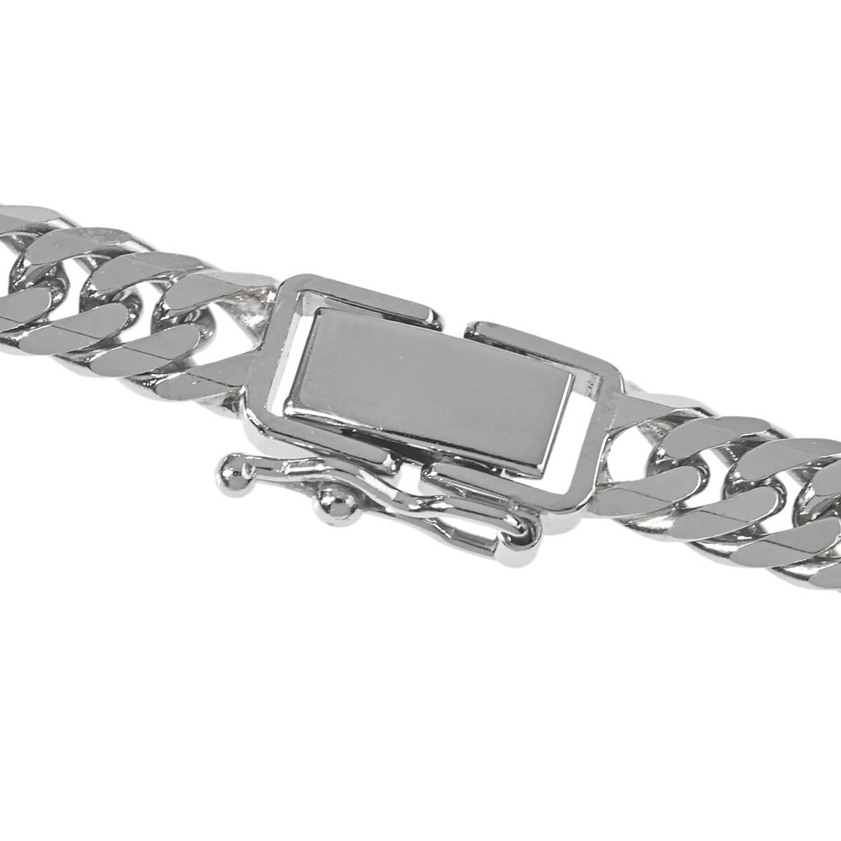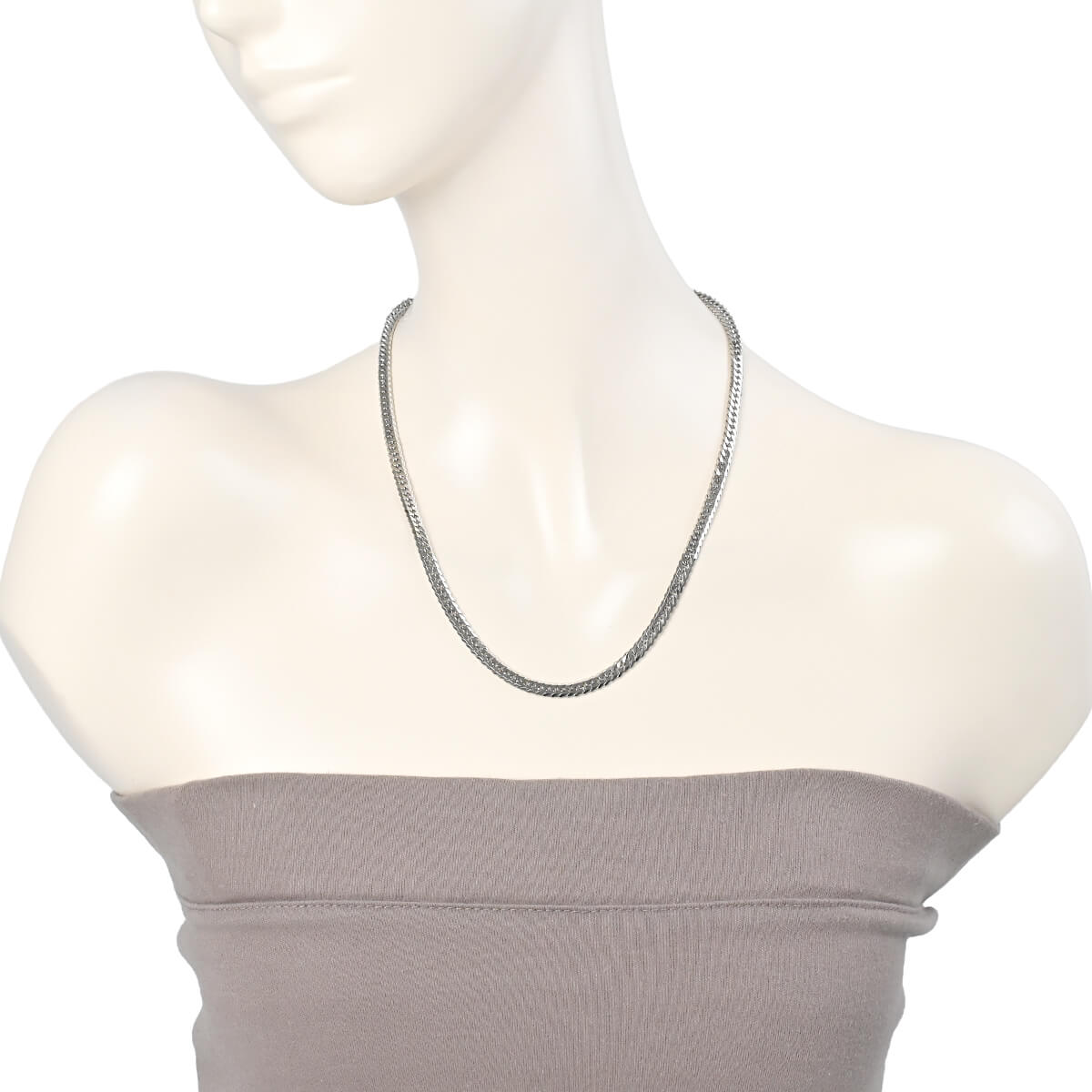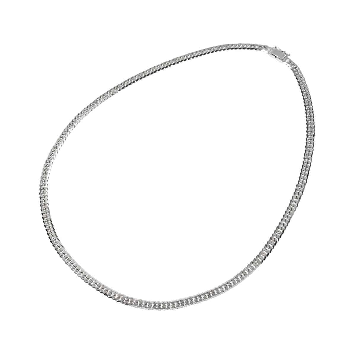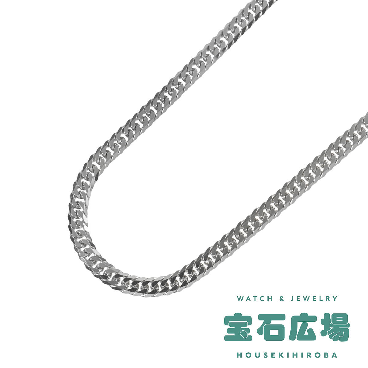 約50センチ、幅約5.1ミリ、約50グラムの、プラチナ製6面ダブルキヘイチェーンネックレス。キヘイチェーンとは、あずき型のチェーンを90度ひねり、さらに押しつぶしたつくりのデザインチェーンのこと。押しつぶした面が綺麗に並んで同じ面を向き、連続していることによるなめらかな輝きが魅力のデザインチェーンです。上下及び2つの対角線上に2つずつ平面が施された6面のコマをダブルに繋いだ、6面ダブルキヘイチェーン。カット面が多く地金の輝きが強く映えるこのチェーンは、隣り合うコマとの密度も高いため、程よい華やかさと重厚感をあわせもっています。資産価値にも注目されるキヘイは他のチェーンとは違い、単なる装飾品としてだけでなく身につける資産としても人気です。