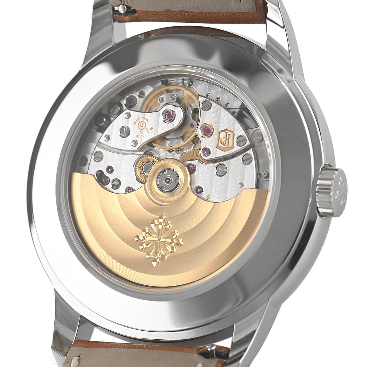 日付と曜日に週の番号を表示するダイヤルは、パテック社所属デザイナーによる手書き文字を転写したもの。