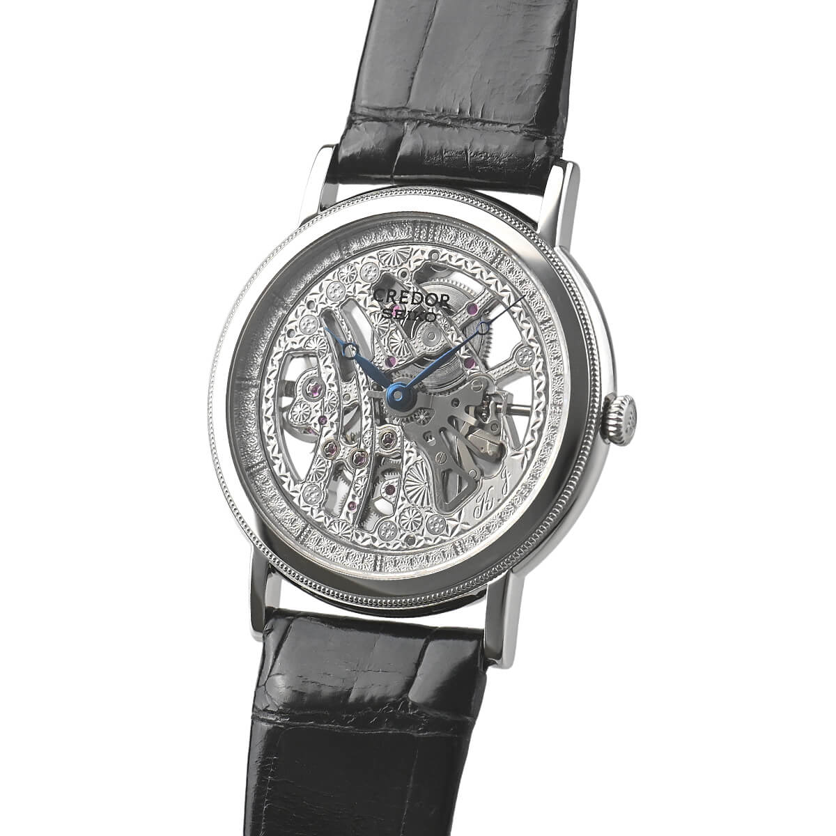 高級ウォッチブランド「クレドール」から、メカニカルスケルトン彫金シリーズの「GBBD989」の入荷です。厚さ1.98mmの超薄型キャリバーに0.15mmの深さの模様を施した、熟練した職人のみが作ることのできる逸品です。
