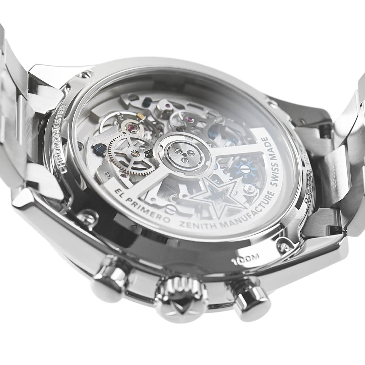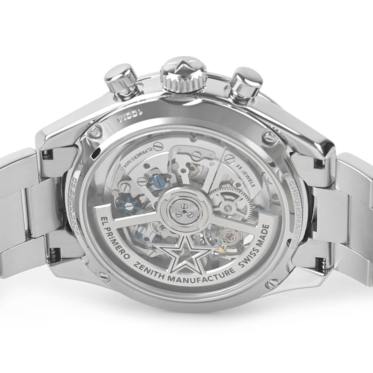 サファイアクリスタル製ケースバックから見えるのは、1/10秒の精度を備えたエル・プリメロ 3604 自動巻クロノグラフムーブメントです。