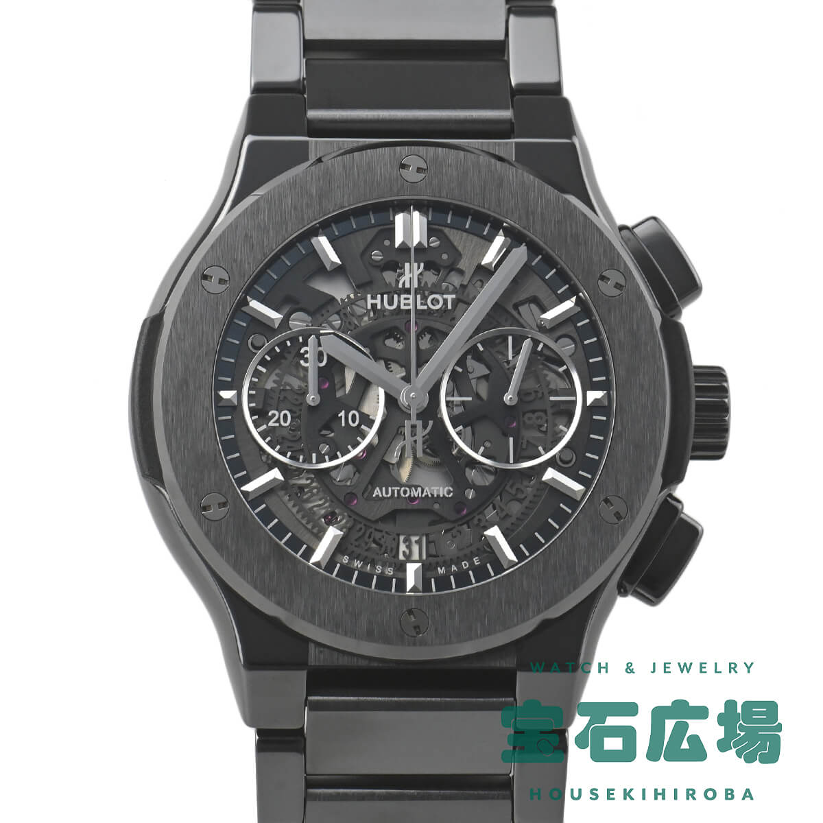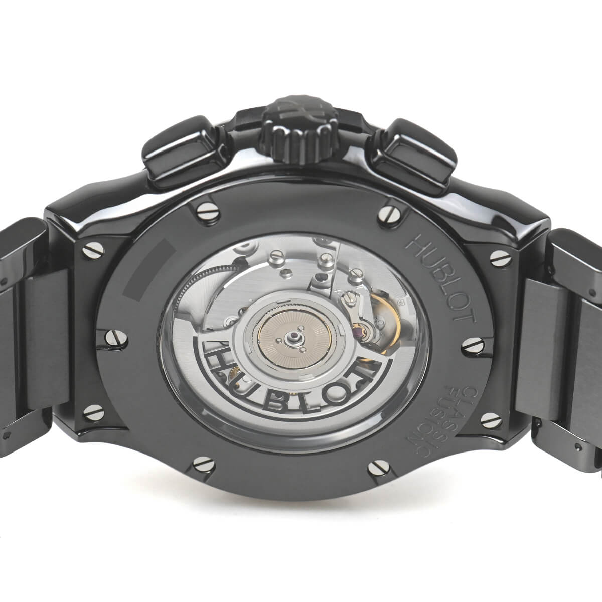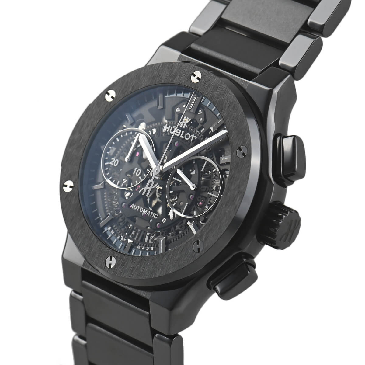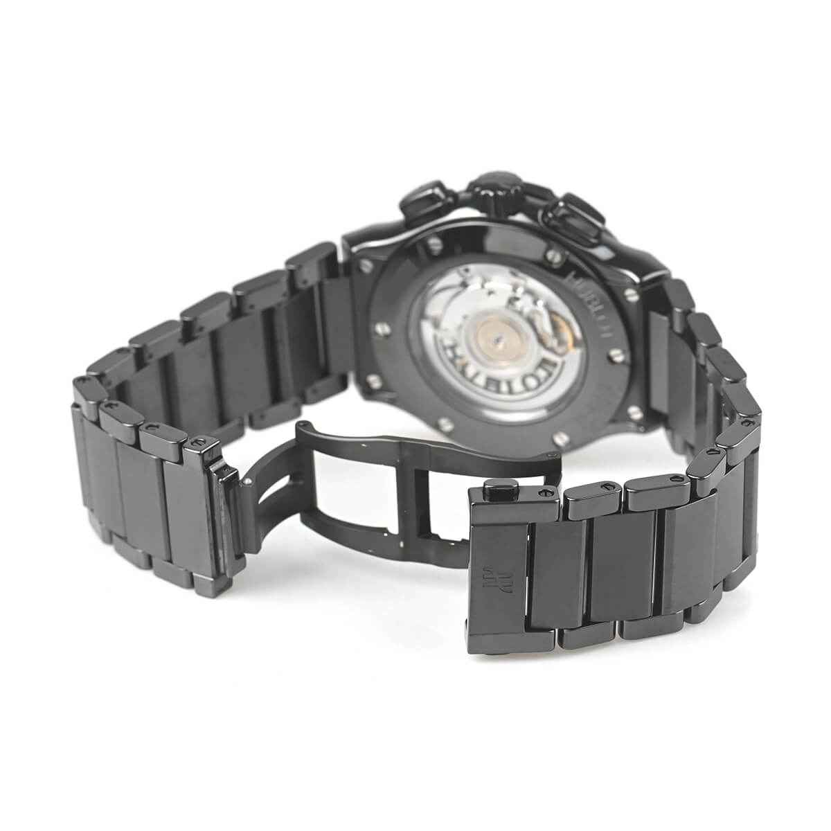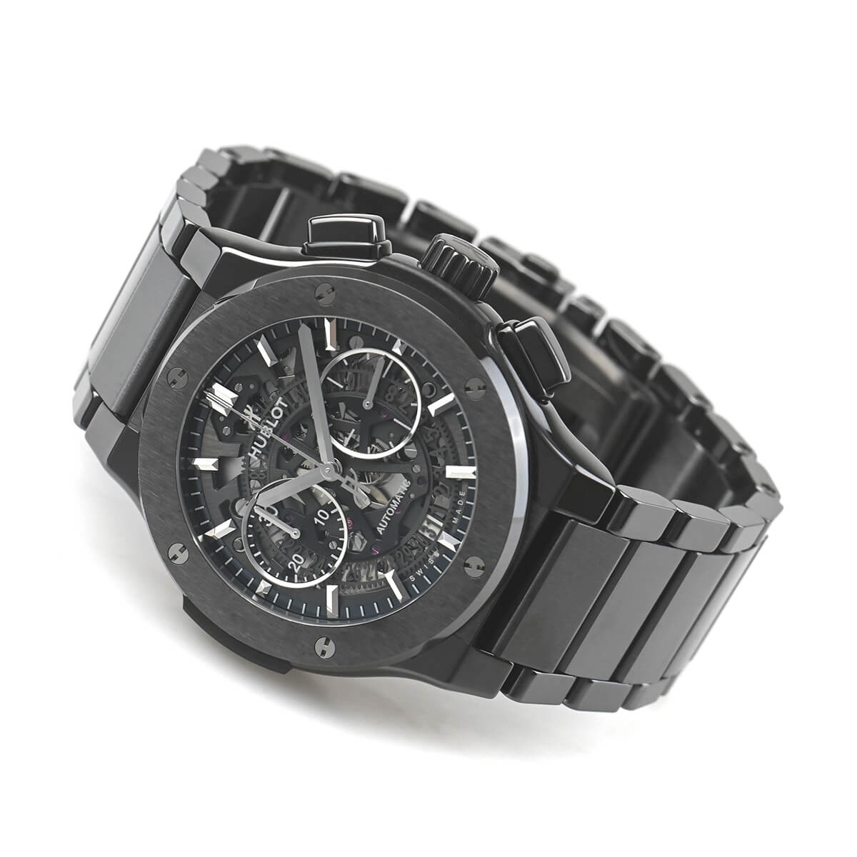 ウブロが創業以来大切にしてきたシリーズ「クラシック」の進化系「クラシックフュージョン」。こちらの【アエロフュージョン ブラックマジック】は、ウブロの『THE ART OF FUSION』(異なる素材やアイデアの融合)のコンセプトに則り製造されたモデルで、クラシックフュージョンのダイアルをスケルトン加工してシースルーバックからだけでなく、文字盤側からもムーブメントの動きがお楽しみ頂けます。