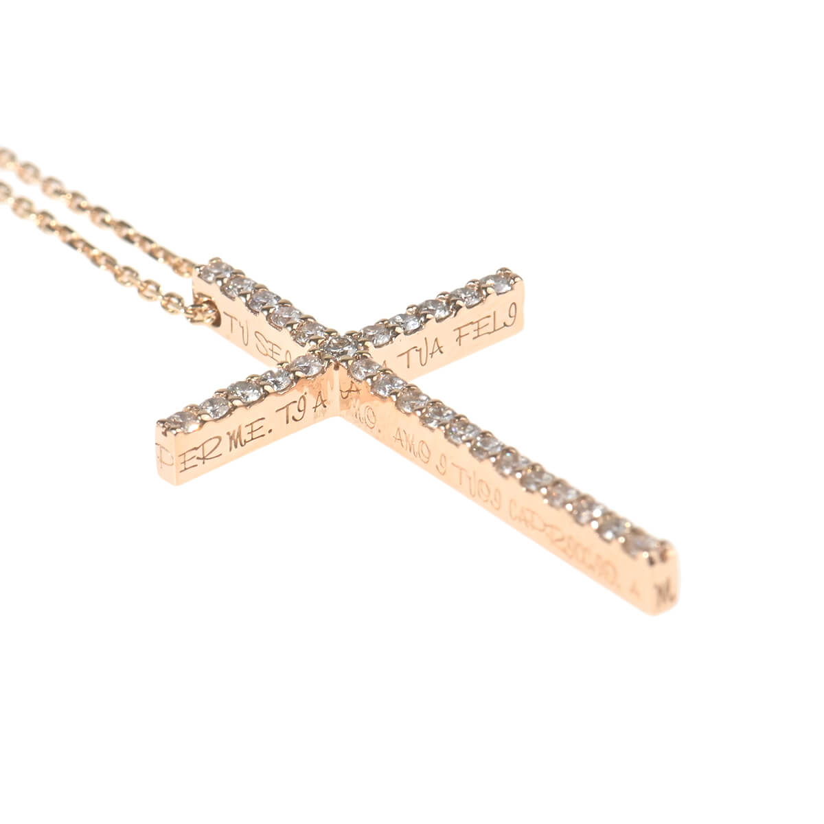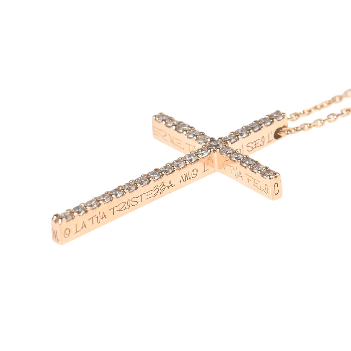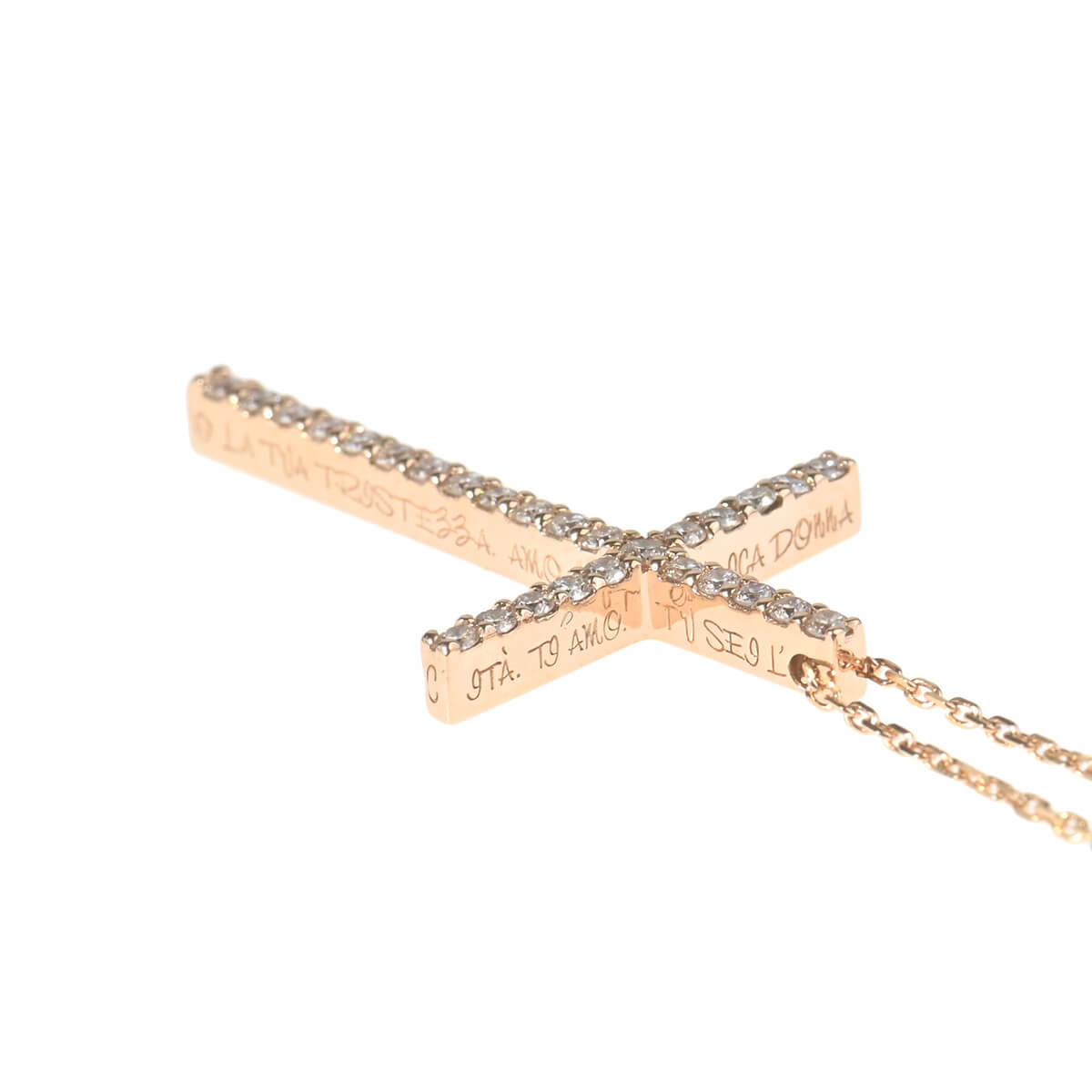 0.39ctものダイヤモンドで描かれた、シャープなクロスが繊細なチェーンにあしらわれたピンクゴールド製ペンダントネックレス。一見シンプルなこのクロスのサイドには“あなたは私の最愛の女性です。愛しています。あなたの気まぐれが好きです。あなたの悲しみも好きです。あなたの幸せも好きです。愛しています。”とロマンティックなメッセージがイタリア語でエングレービングされています。愛するパートナーへのギフトにはもちろん、アミュレットとしても魅力のメッセージジュエリーです。