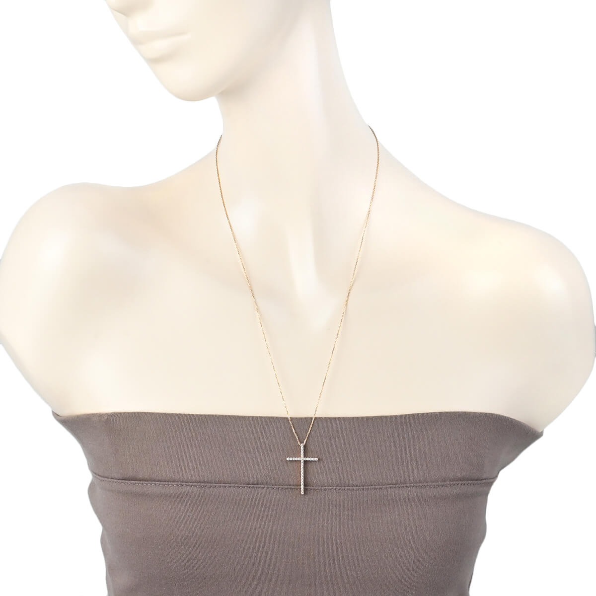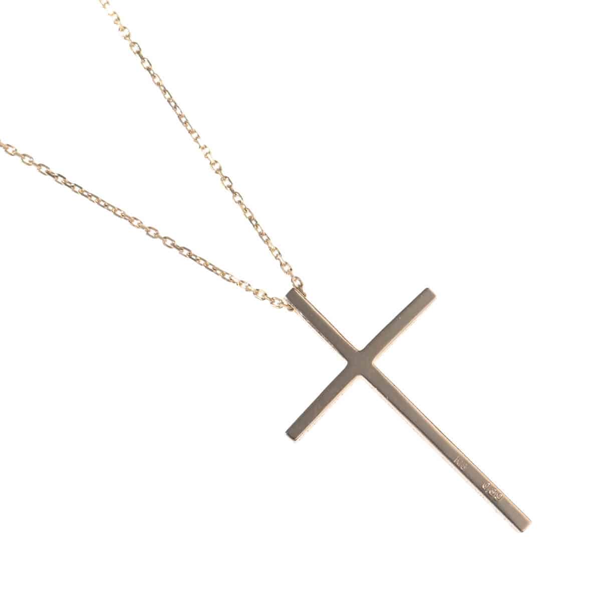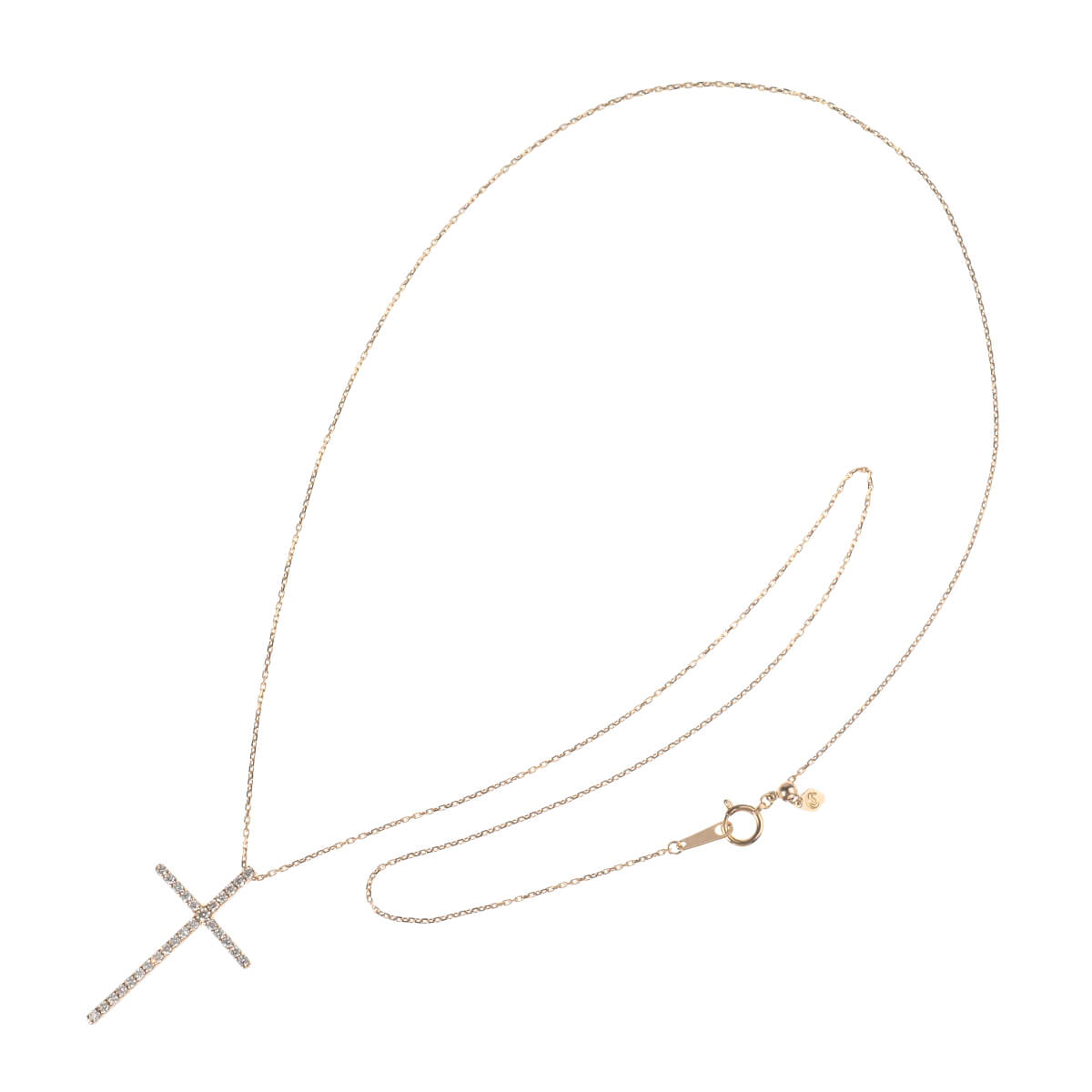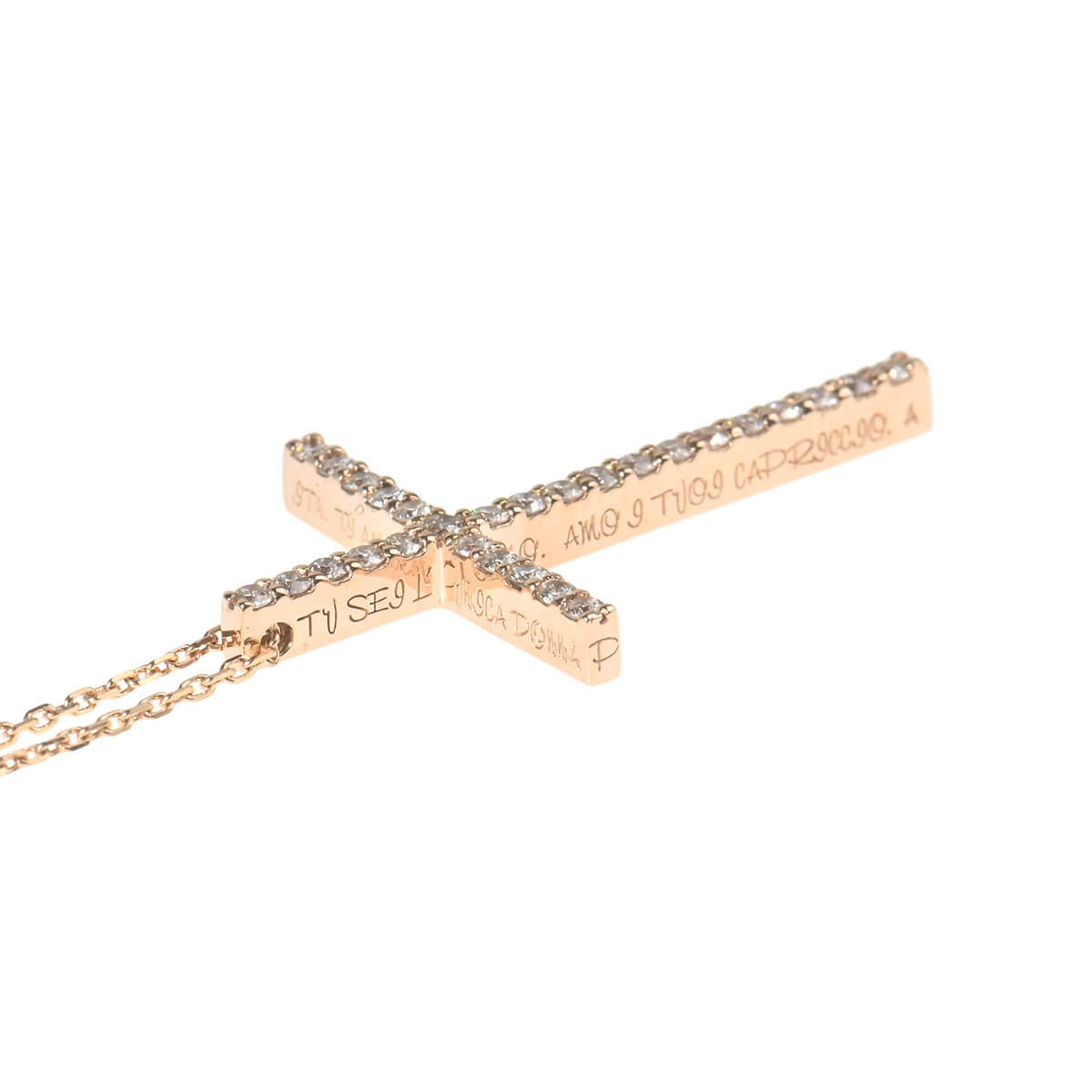 0.39ctものダイヤモンドで描かれた、シャープなクロスが繊細なチェーンにあしらわれたピンクゴールド製ペンダントネックレス。一見シンプルなこのクロスのサイドには“あなたは私の最愛の女性です。愛しています。あなたの気まぐれが好きです。あなたの悲しみも好きです。あなたの幸せも好きです。愛しています。”とロマンティックなメッセージがイタリア語でエングレービングされています。愛するパートナーへのギフトにはもちろん、アミュレットとしても魅力のメッセージジュエリーです。