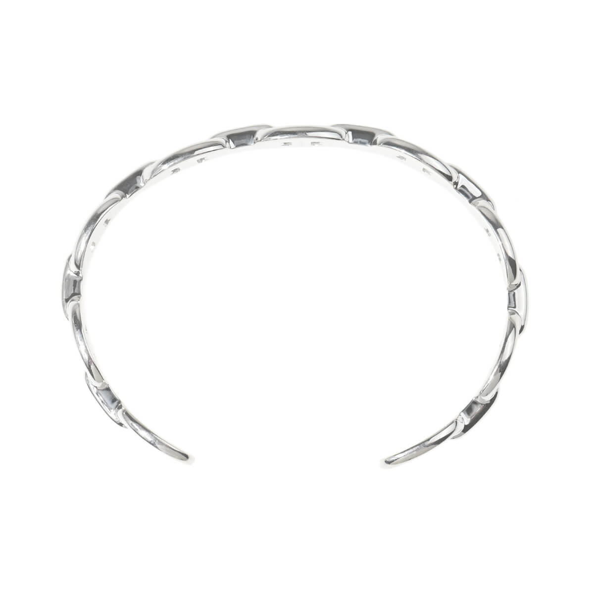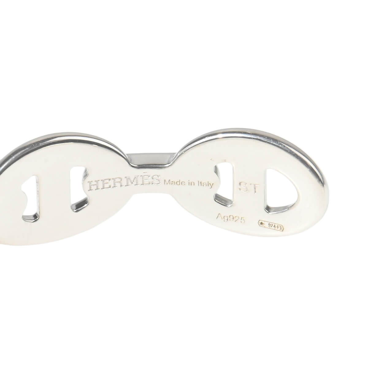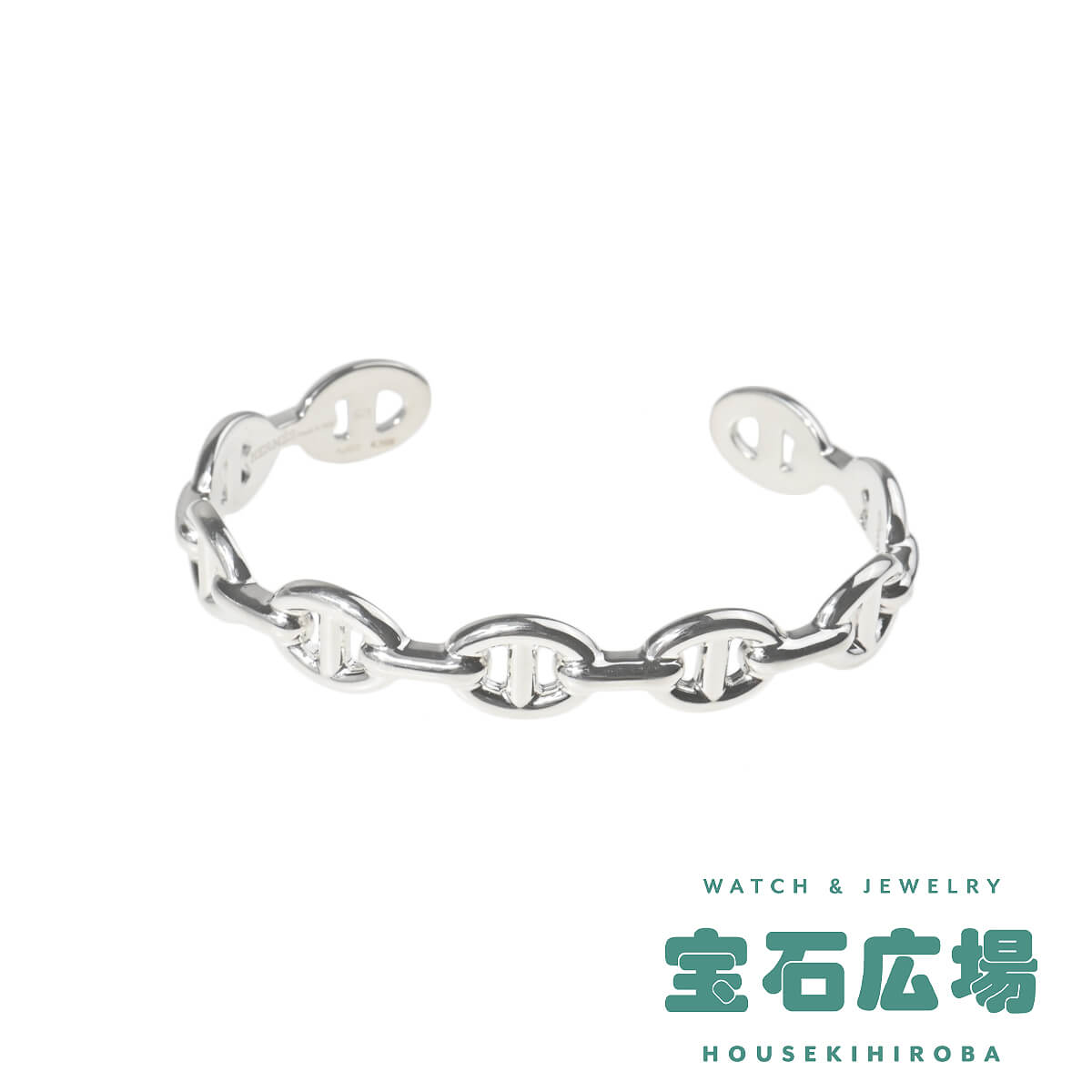 1938年にエルメス家の一員であり当時のエルメスの社長であったロベール・デュマ=エルメスが、ふと船の錨のチェーンに目を留め、そのシルエットに惹かれ、そのチェーンを元にデザインしたブレスレットを作ったことにはじまった「シェーヌ・ダンクル」コレクション。インスピレーションの源であった“錨の鎖(Chaine d’ancre)”をそのままモデル名に冠したこのコレクションは、鎖で強く結ばれた絆を象徴しているそう。最初のブレスレット誕生後も艶出しにしたり、丸い粒状にしたり、ひねったりと、コマの形や大きさを変え、ネックレスやリング、ピアス、ブレスレットとつぎつぎに新しい姿を見せ、メゾンを代表するコレクションのひとつとなった「シェーヌ・ダンクル」、MMサイズのシルバー製ショートバングルです。着脱しやすいオープンバングルはこれひとつでも、スタッキングしても、ジェンダーや年代を問わずに身につけるひとをお洒落に引き立てる、一流メゾンのトレンドジュエリーです。