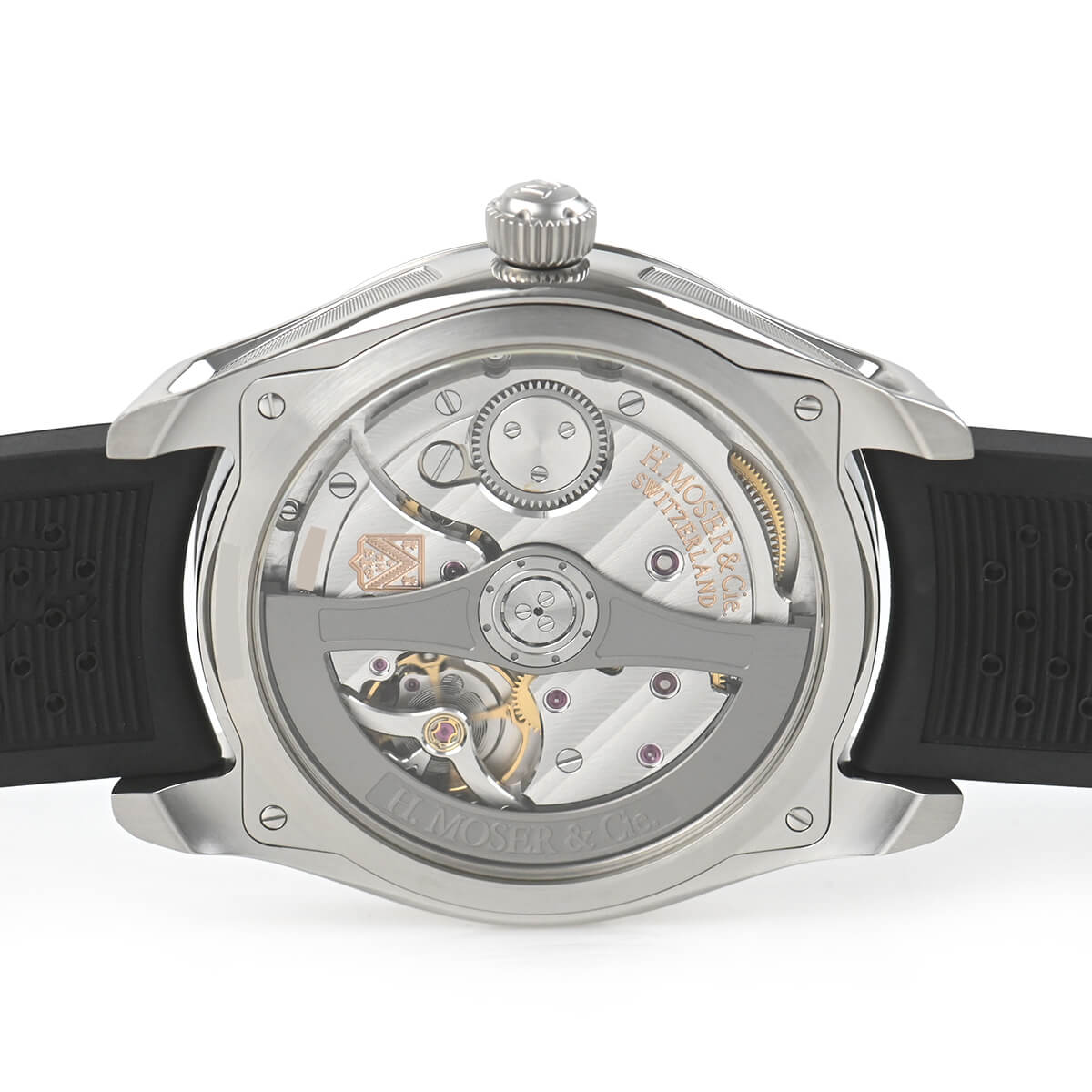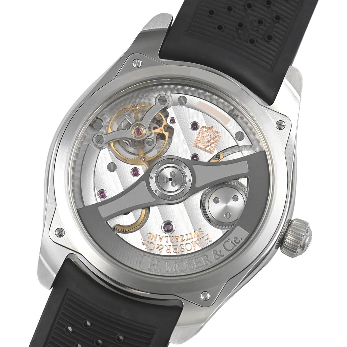 モーザーダブルストライプでブリッジと地板を仕上げ、ローターにはエングレービングを施しました。