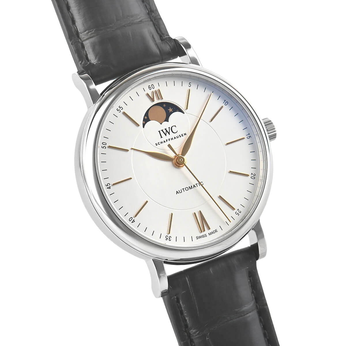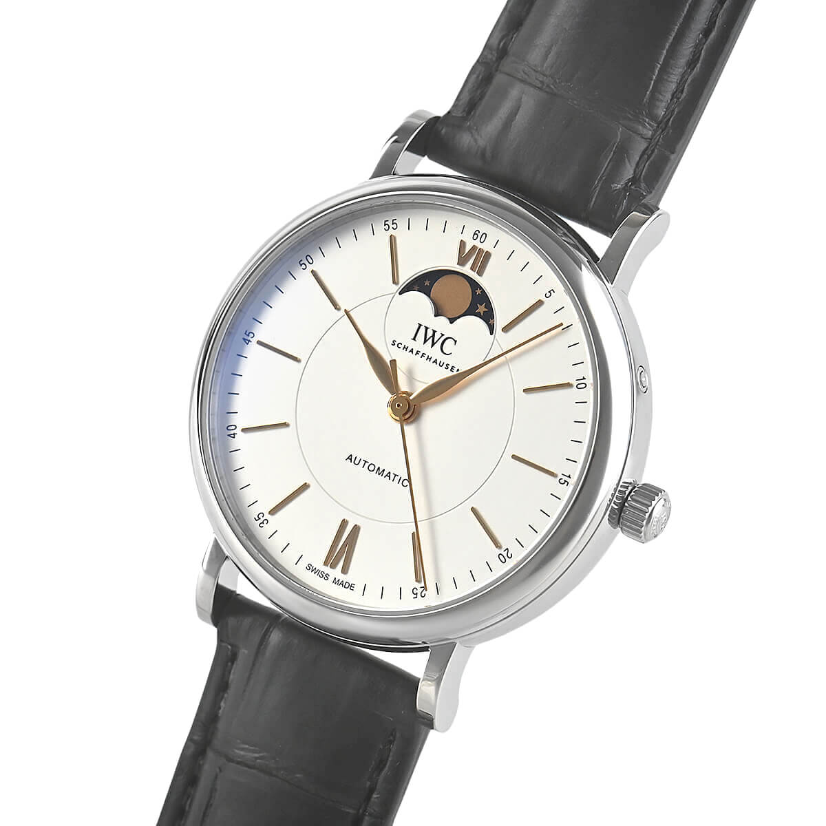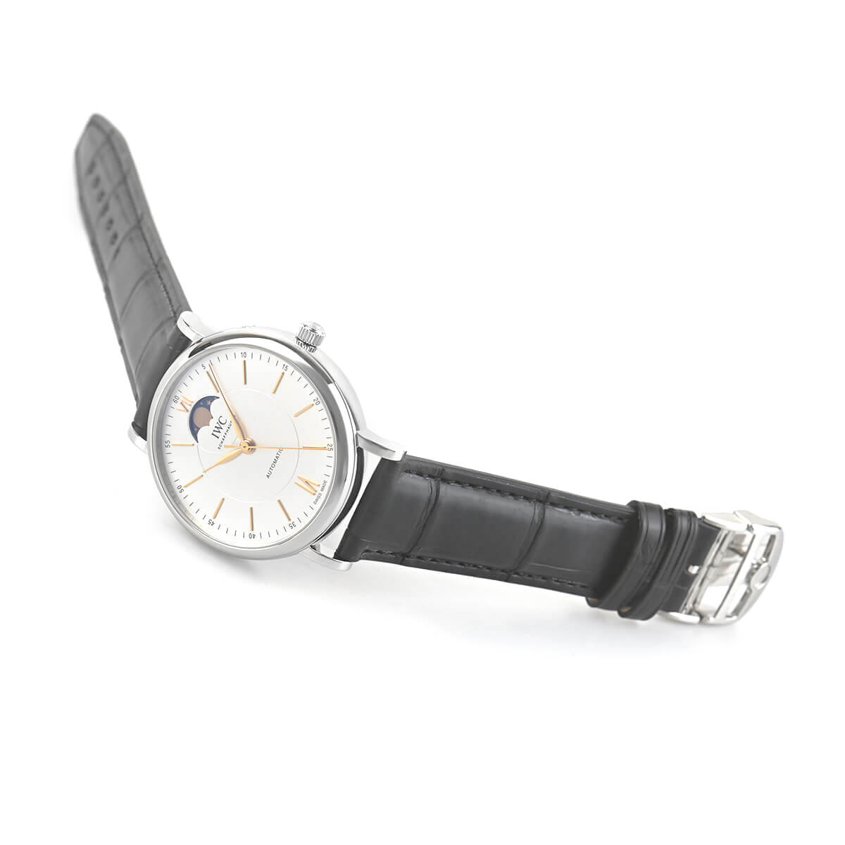 ケース径40mmのメンズモデル【ポートフィノ オートマティック ムーンフェイズ 40】。文字盤の12時位置にはムーンフェイズ表示機能を備え、2時位置のケース側面のプッシュボタンで操作します。