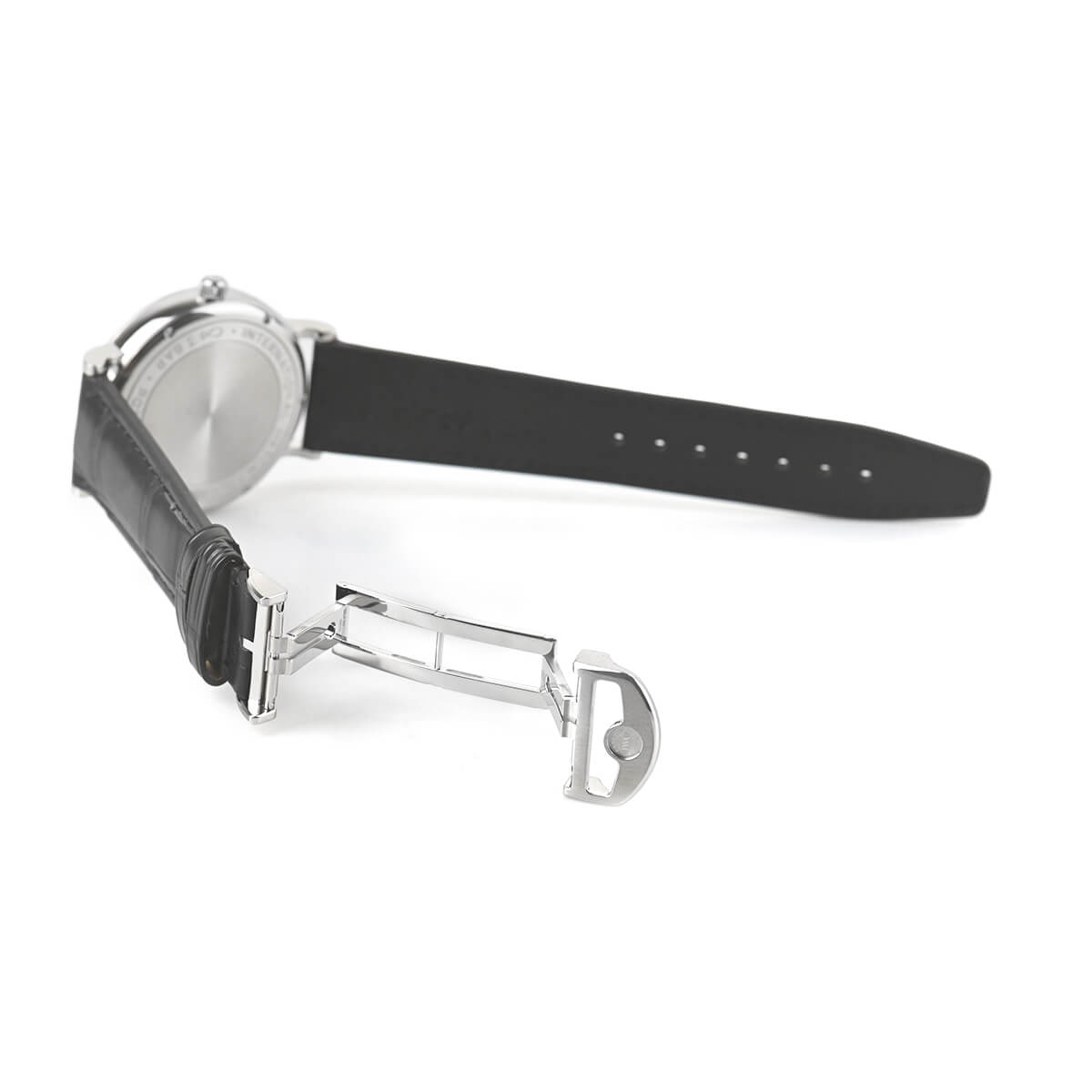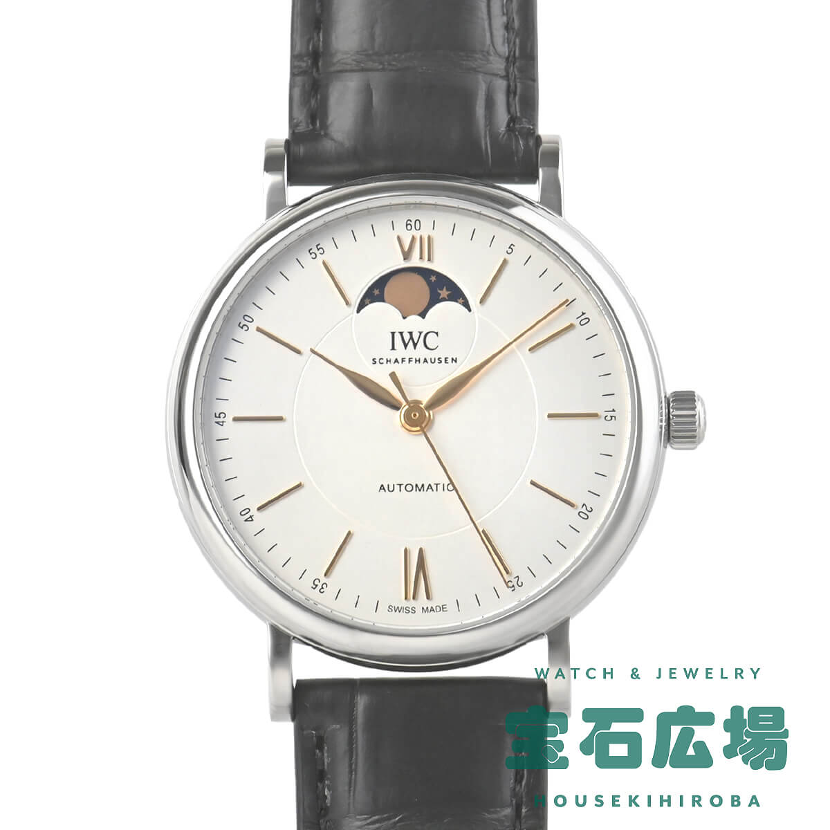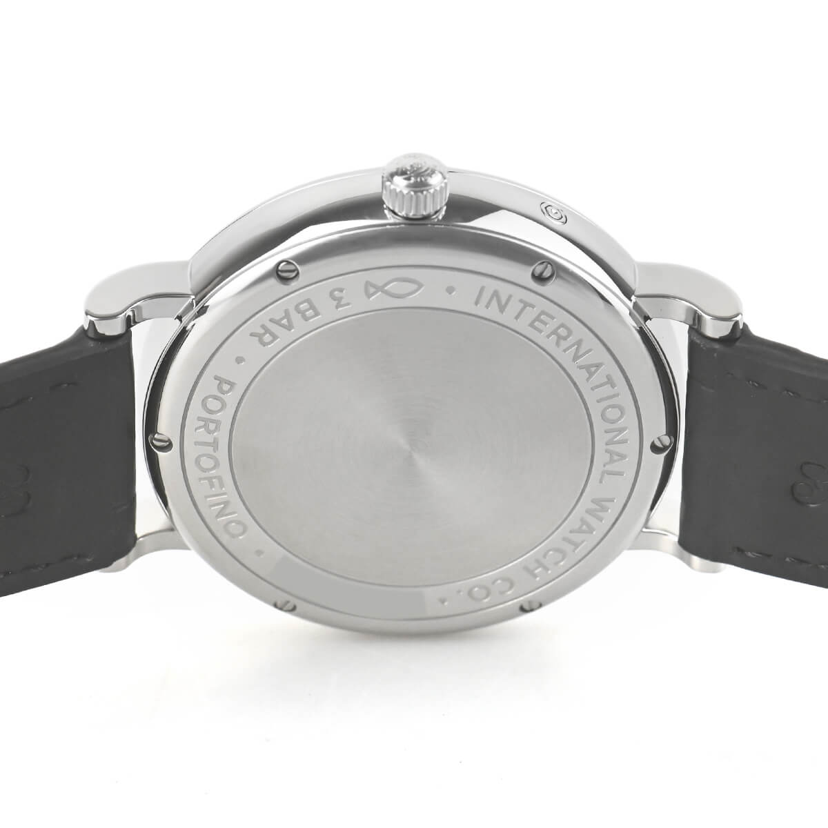 ケース径40mmのメンズモデル【ポートフィノ オートマティック ムーンフェイズ 40】。文字盤の12時位置にはムーンフェイズ表示機能を備え、2時位置のケース側面のプッシュボタンで操作します。