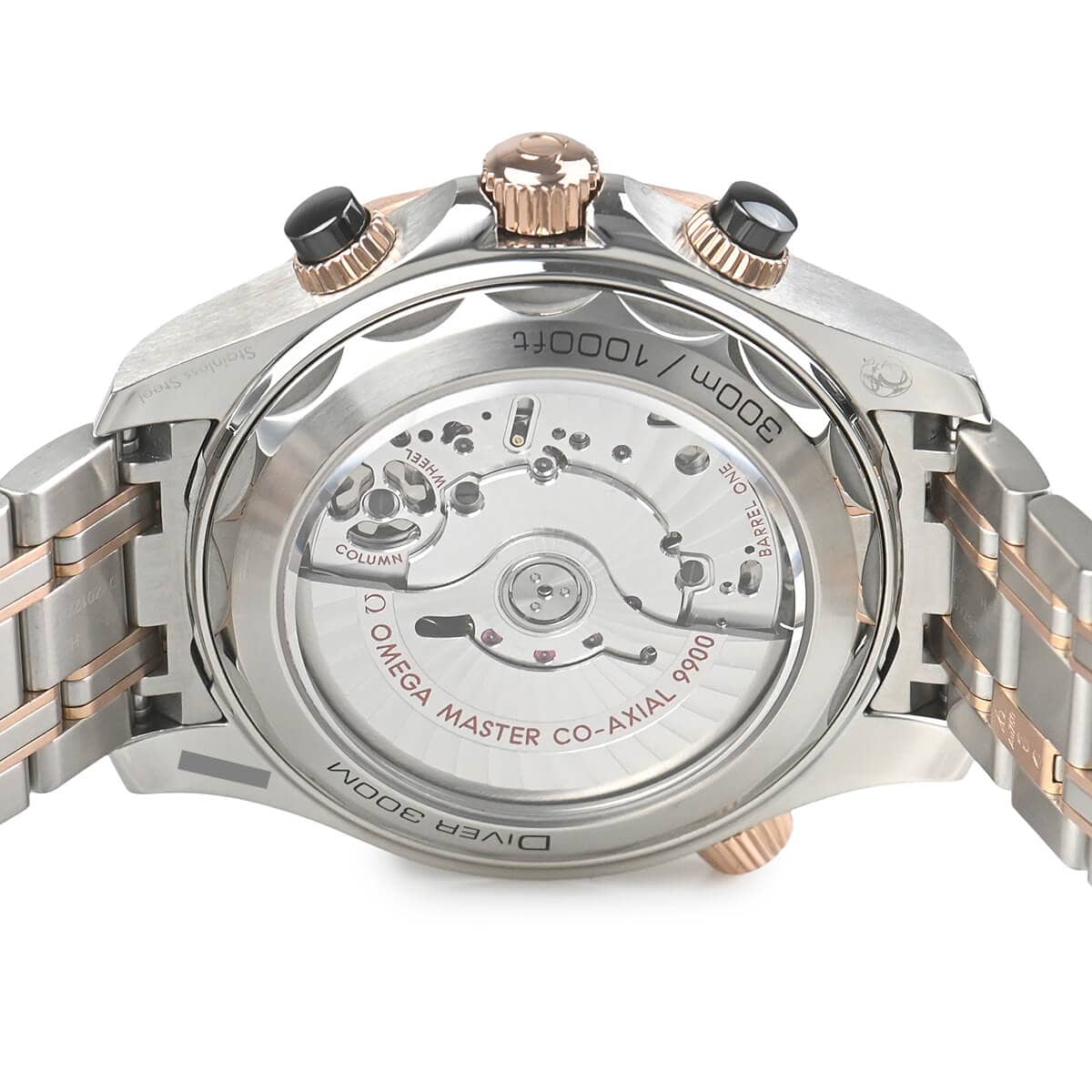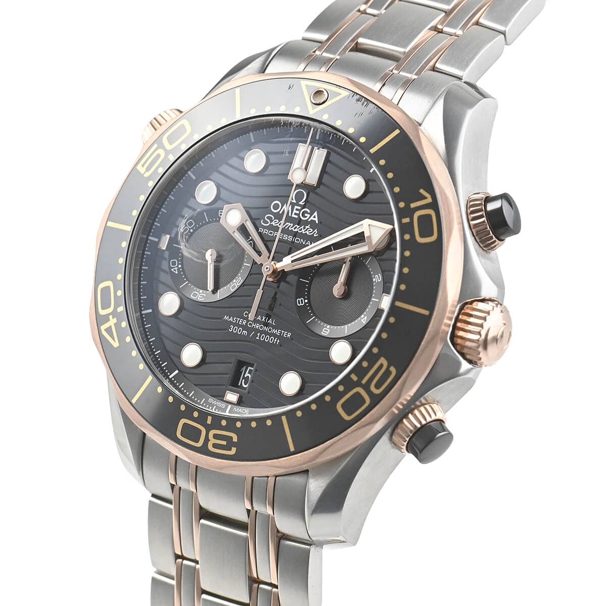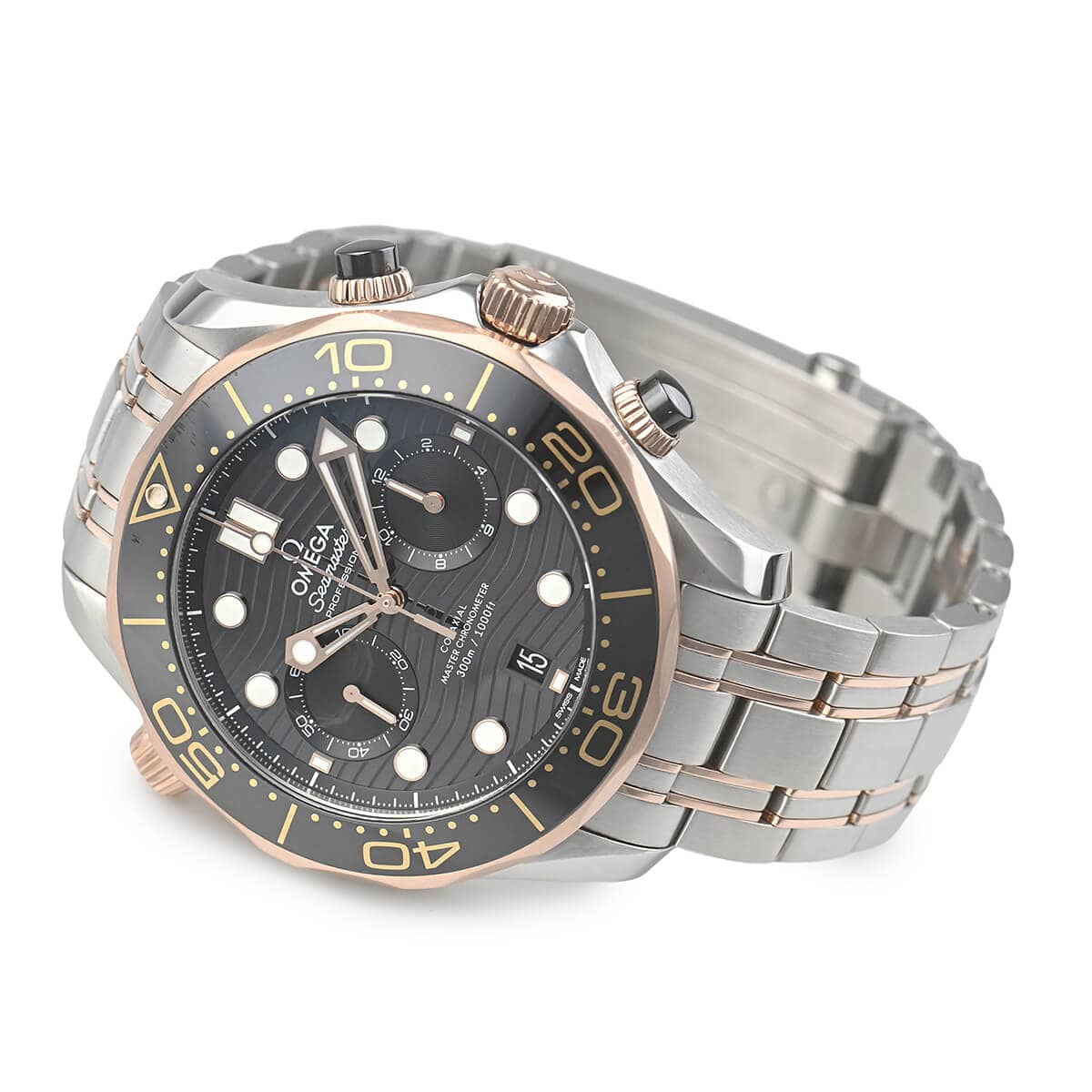 1993年に発表された【シーマスター ダイバー300M】は、スピードマスターと並びオメガを代表する人気シリーズです。こちらは2019年に発表されたケース径44mmのクロノグラフモデル。文字盤とダイビングベゼルには耐久性に優れたブラック・セラミックを採用し、文字盤にはシーマスターの初代モデルにあったレーザー加工の波模様を施します。