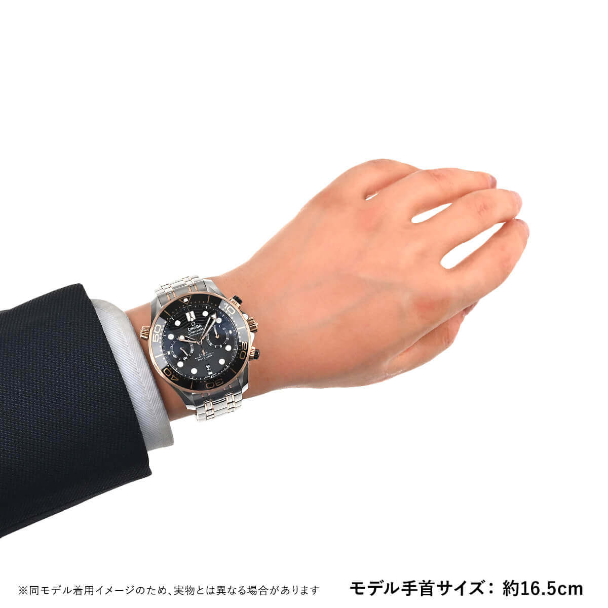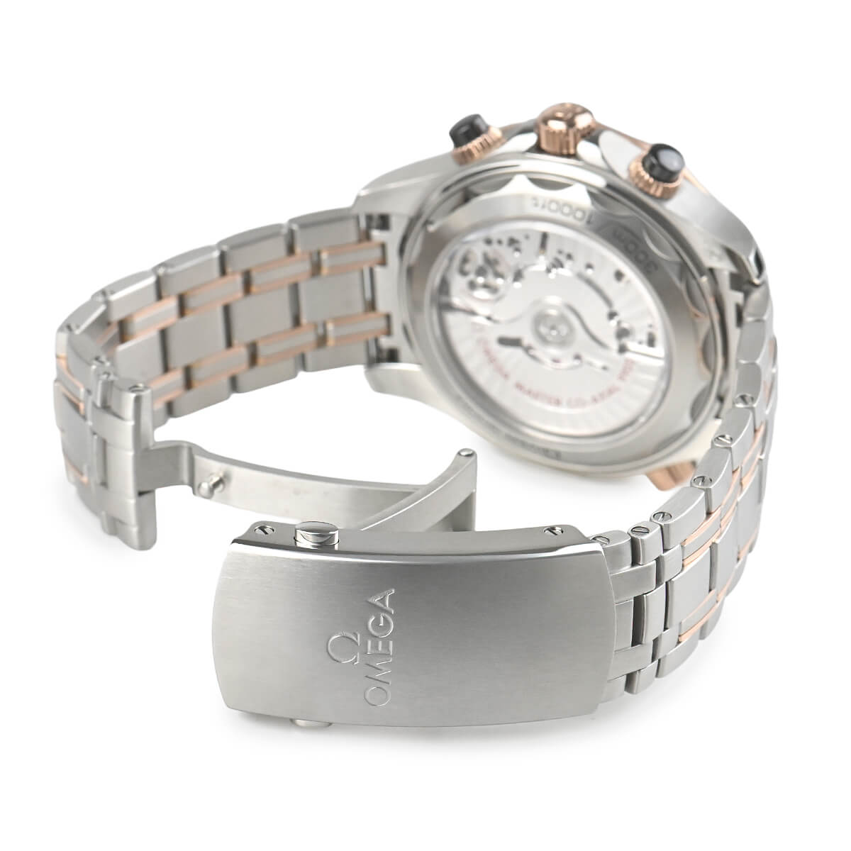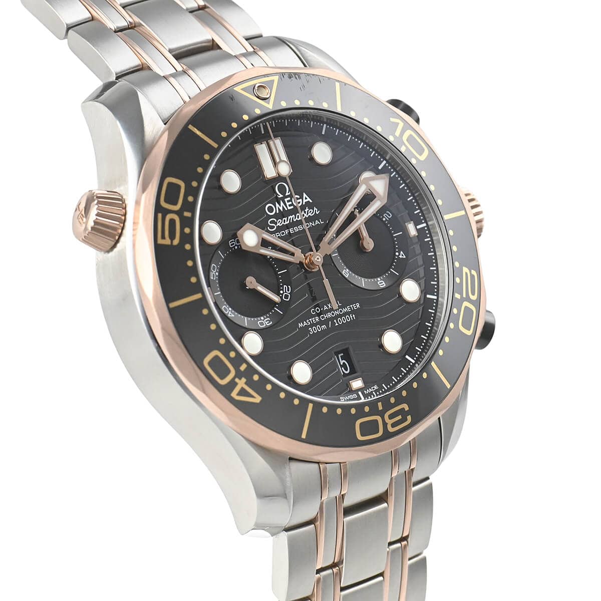 1993年に発表された【シーマスター ダイバー300M】は、スピードマスターと並びオメガを代表する人気シリーズです。こちらは2019年に発表されたケース径44mmのクロノグラフモデル。文字盤とダイビングベゼルには耐久性に優れたブラック・セラミックを採用し、文字盤にはシーマスターの初代モデルにあったレーザー加工の波模様を施します。
